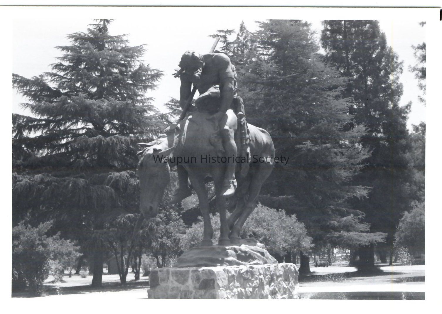 Black and white photo of The End of The Trail statue when in Calif. before it was moved to the Cowboy Hall of Fame in Oklahoma City and then to Waupun, WI.
