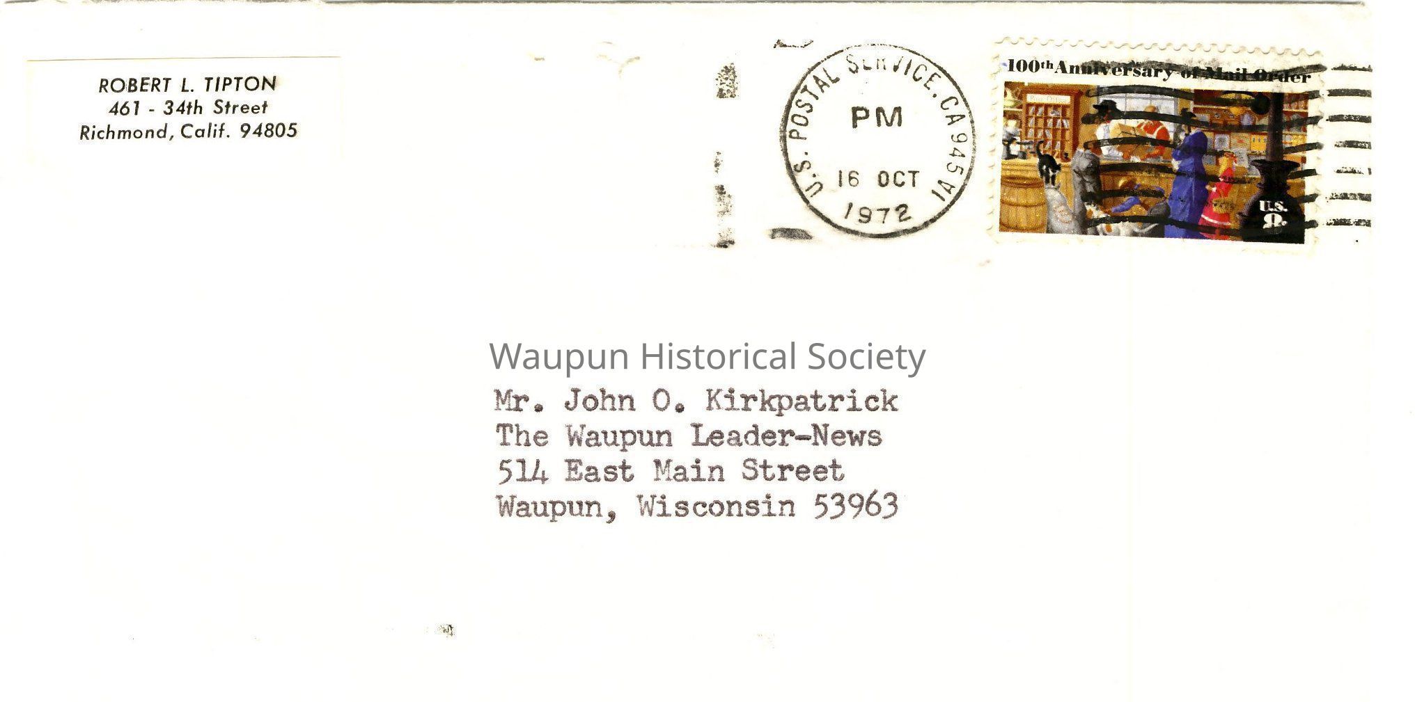 Envelope to Mr. John O. Kirkpatrick from Robert L. Tipton, Calif. dated October 16, 1972 which contained the photos of the End of the Trail in Calif. and placque dedicated to the End of the Trail statue in Calif. before it was traded to the National Cowboy Hall of Fame in Oklahoma City.Acquisition