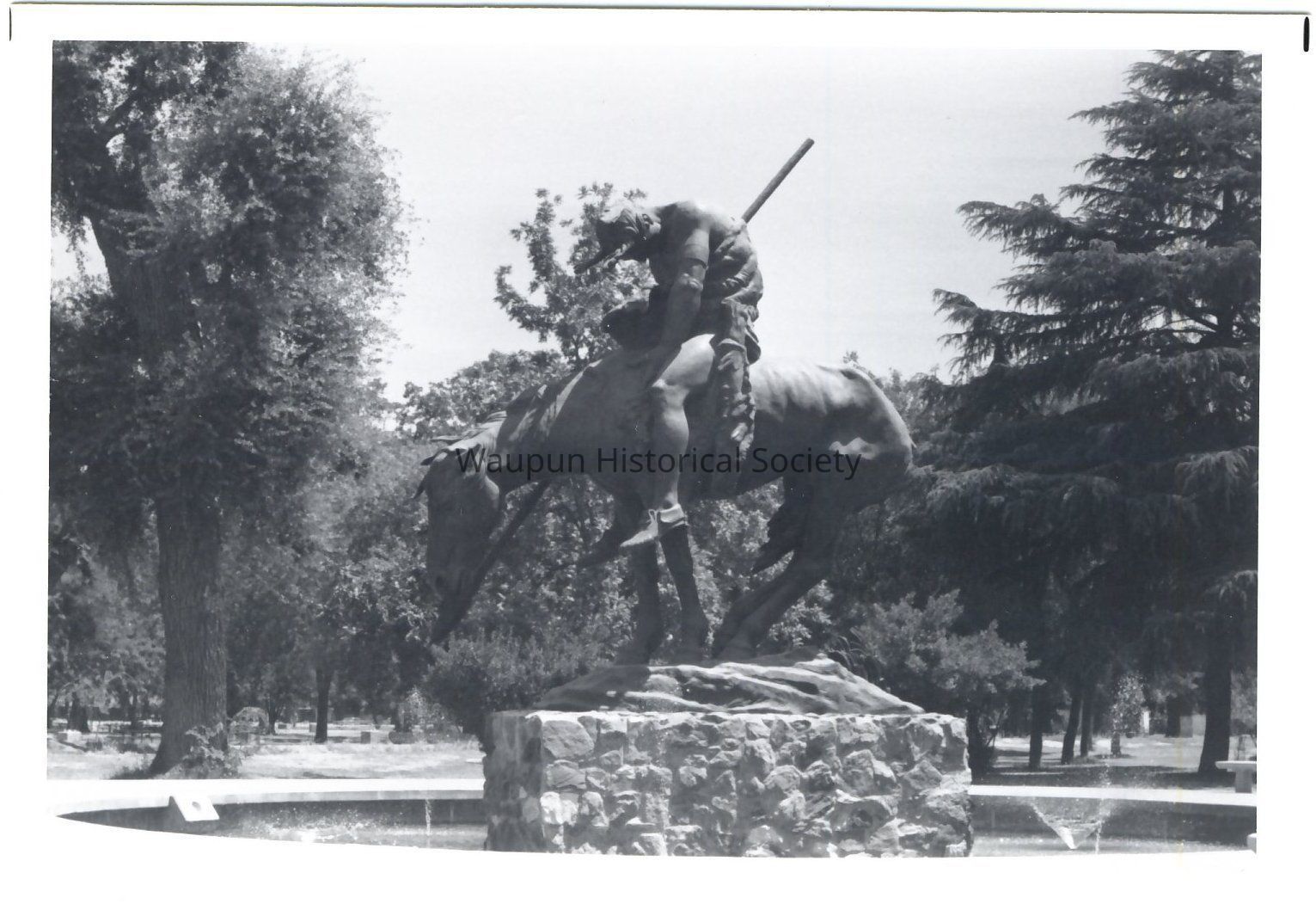 Black and white photo of The End of The Trail statue when in Calif. before it was moved to the Cowboy Hall of Fame in Oklahoma City and then to Waupun, WI.