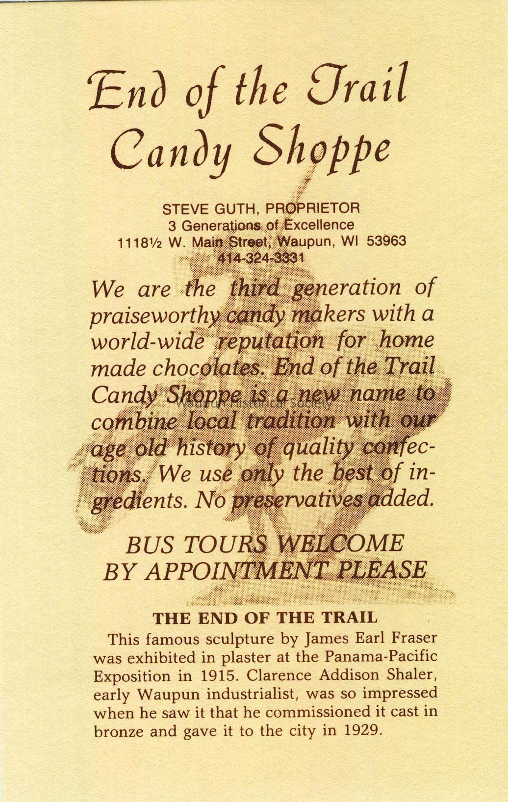 We are the third generation of praiseworthy candy makers with a world-wide reputation for home made chocolates. End of the Trail Candy Shoppe is a new name to combine local tradition with our age old history of quality confections. We use only the best of ingredients. No preservatives added.