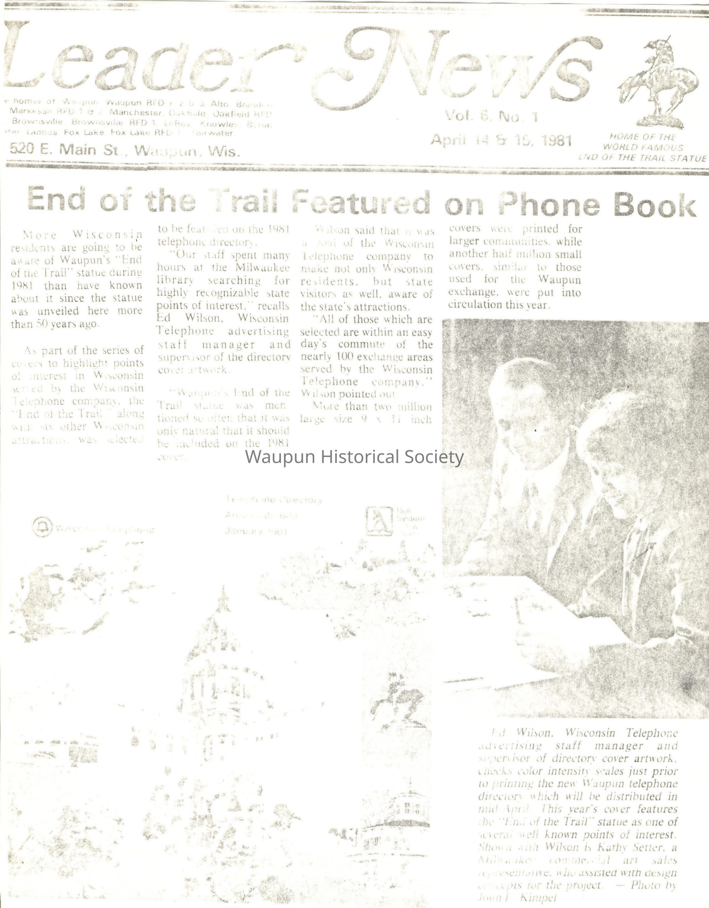 Copy of a newspaper article taken from Lader News of April 14 & 15, 1981 - End of the Trail Featured on Phone Book.