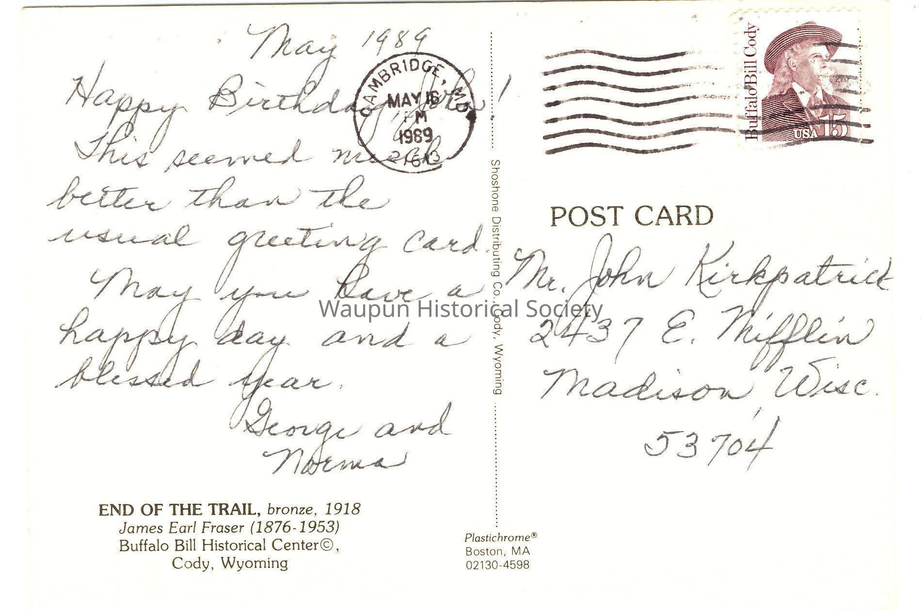 Note from George and Norma to Mr. John Kirkpatrick, Madison, WI, dated May 16, 1989. A 15c stamp used to send.Acquisition