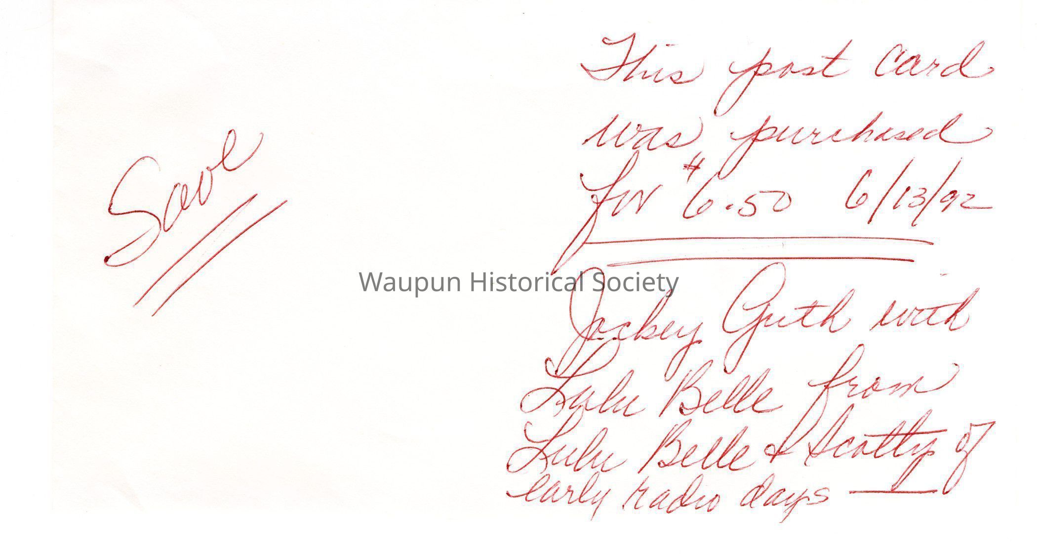 Ann Guth donation envelope. This is the envelope in which item 2009.0010.0001 arrived. Ann Guth had bought the postcard in 6/13/1992 for $6.50. She indicates on the envelope that the lady shown on the postcard is Lulu Belle of Lulu Belle and Scotty of radio fame.Acquisition