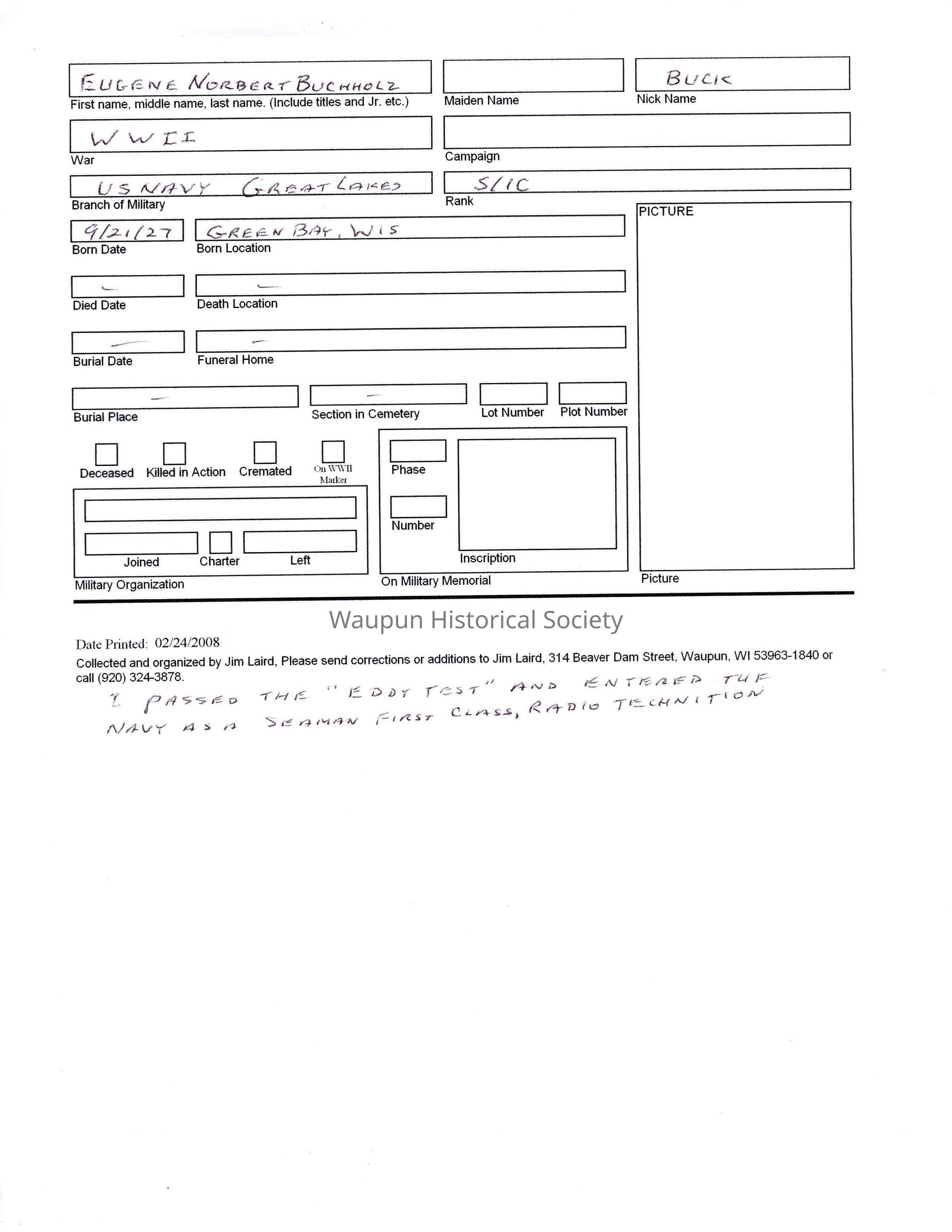 Eugene Norbert Buchholz military information. This form was completed and submitted by Gene Buchholz. It indicates that his nickname is "Buck." He served in WWII in the U. S. Navy Great Lakes. His rank was S/IC. He was born in Green Bay, WI on September 21, 1927. On the bottom is the notation: "I passed the "Eddy Test" and entered the Navy as a Seaman First Class, Radio Technition.Acquisition