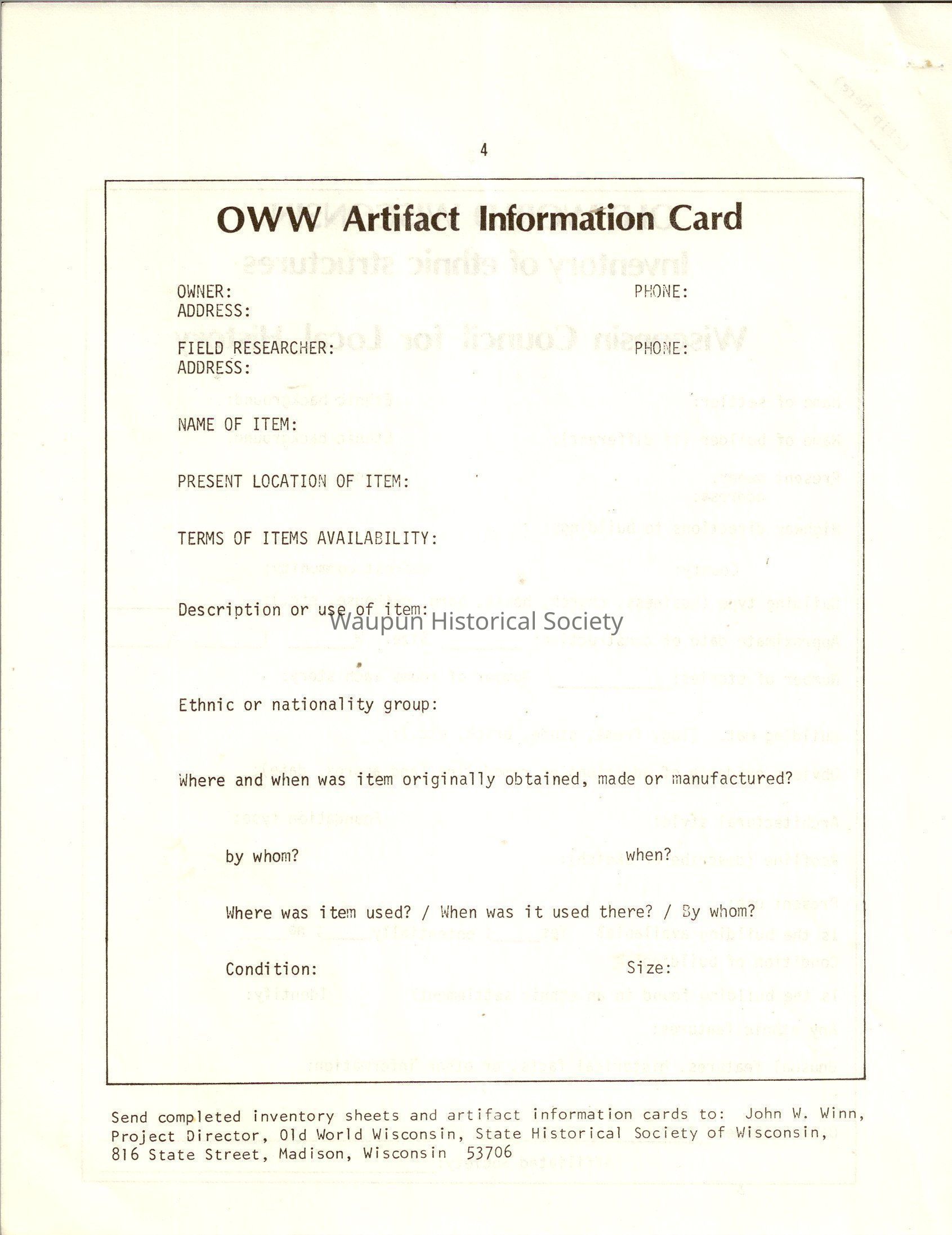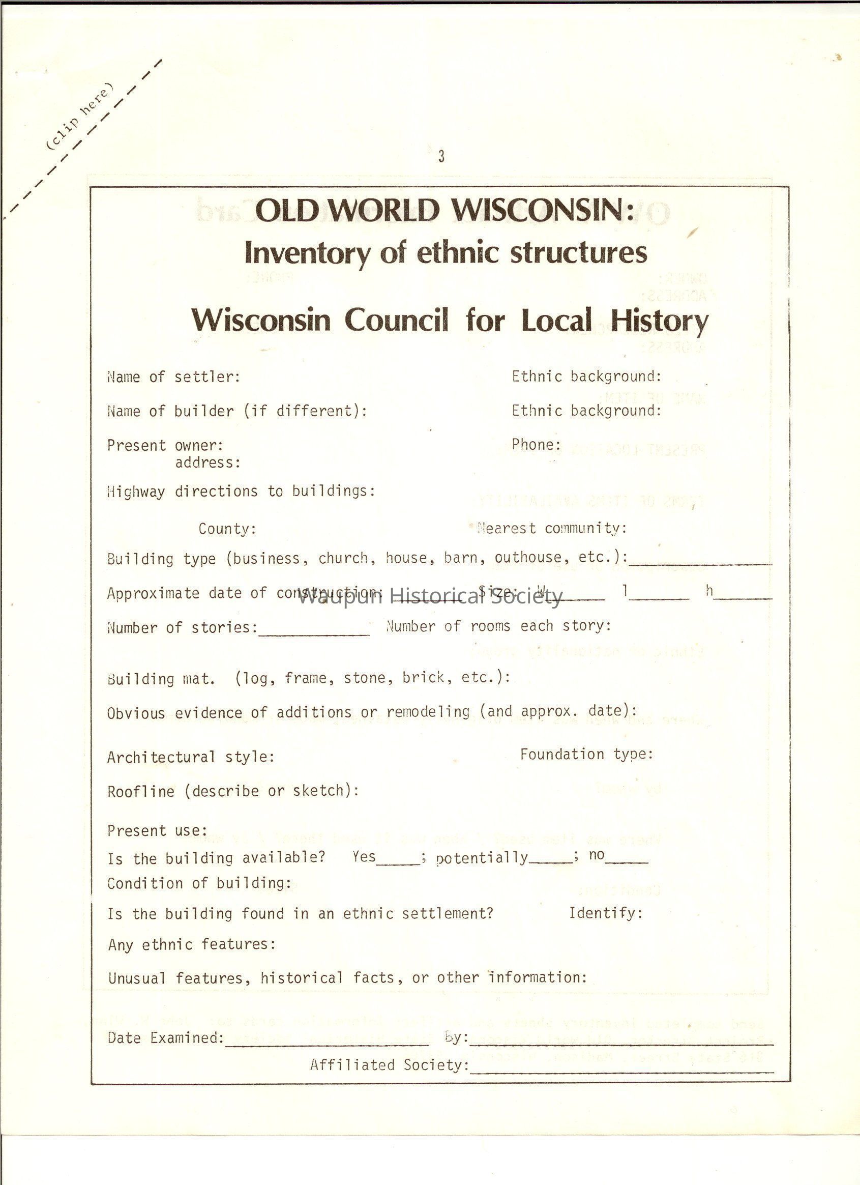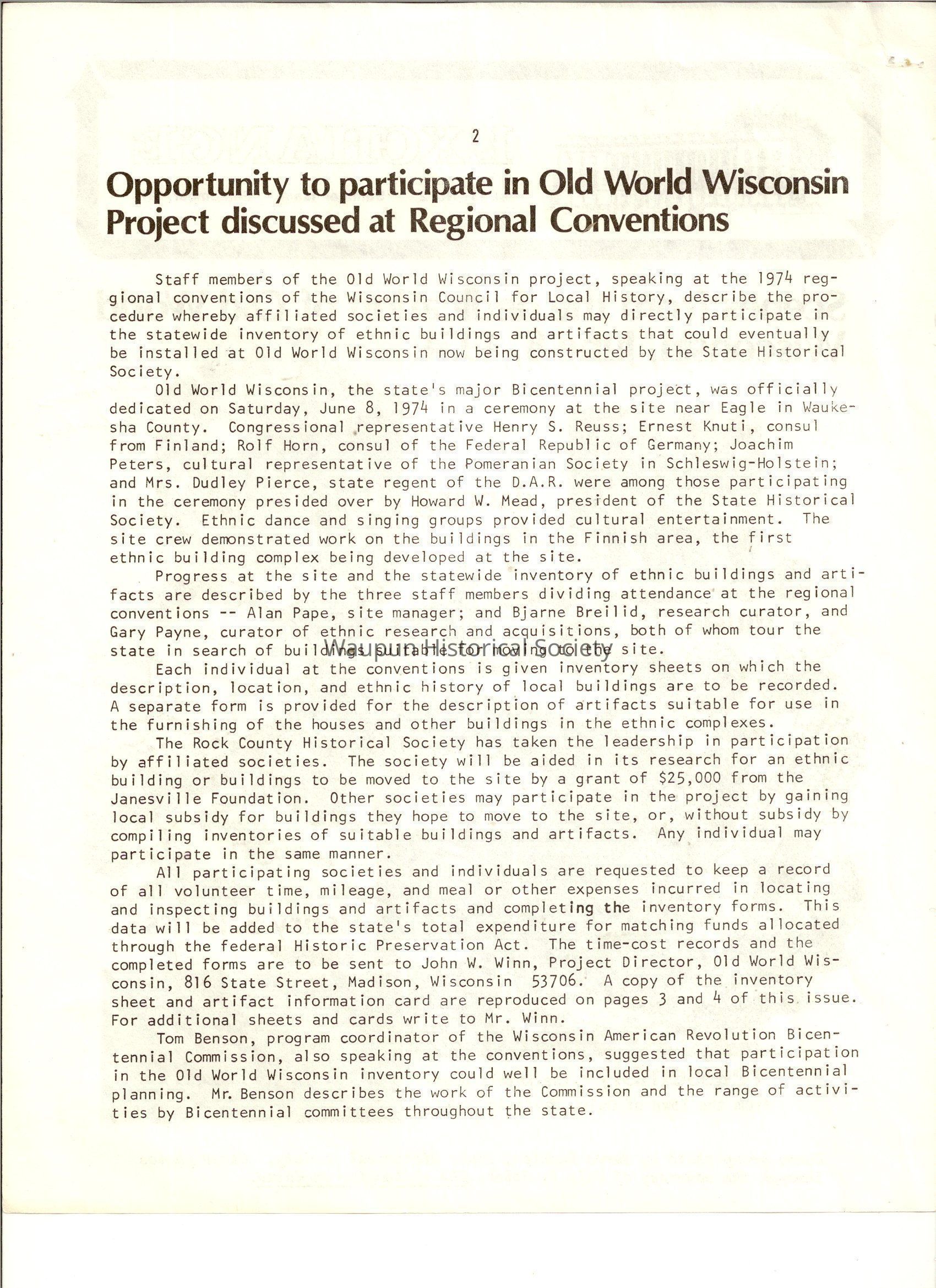 a Document about the old World Wisconsin Project Staff Speaking at the 1974 reggional convention of the Wisconsin Council for local History describe the procedure so all affiliated societies and individuals may directly paarticipate in the statewide inventoiry of ethnic building and artifactsAcquisition