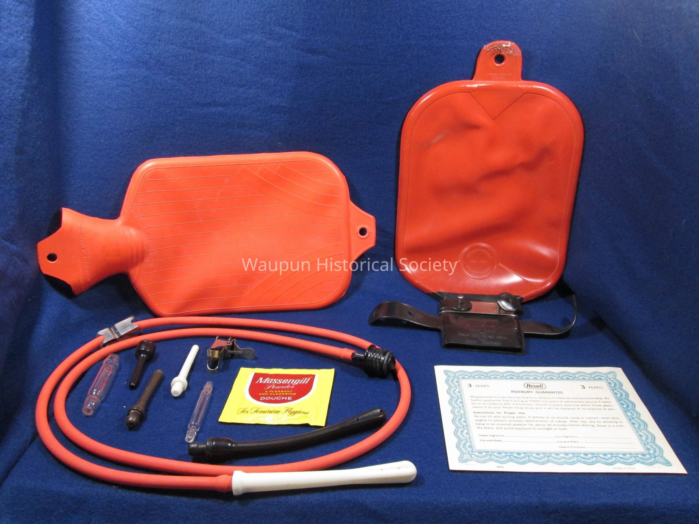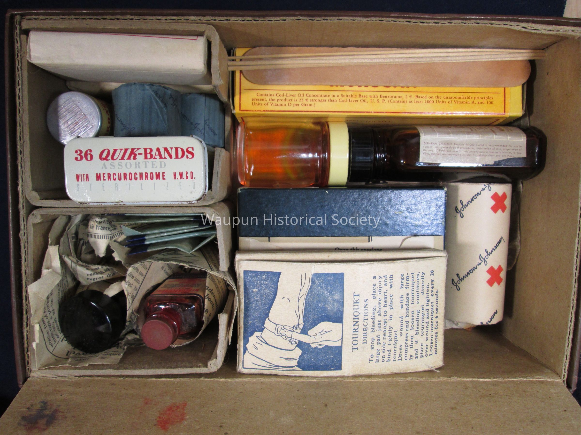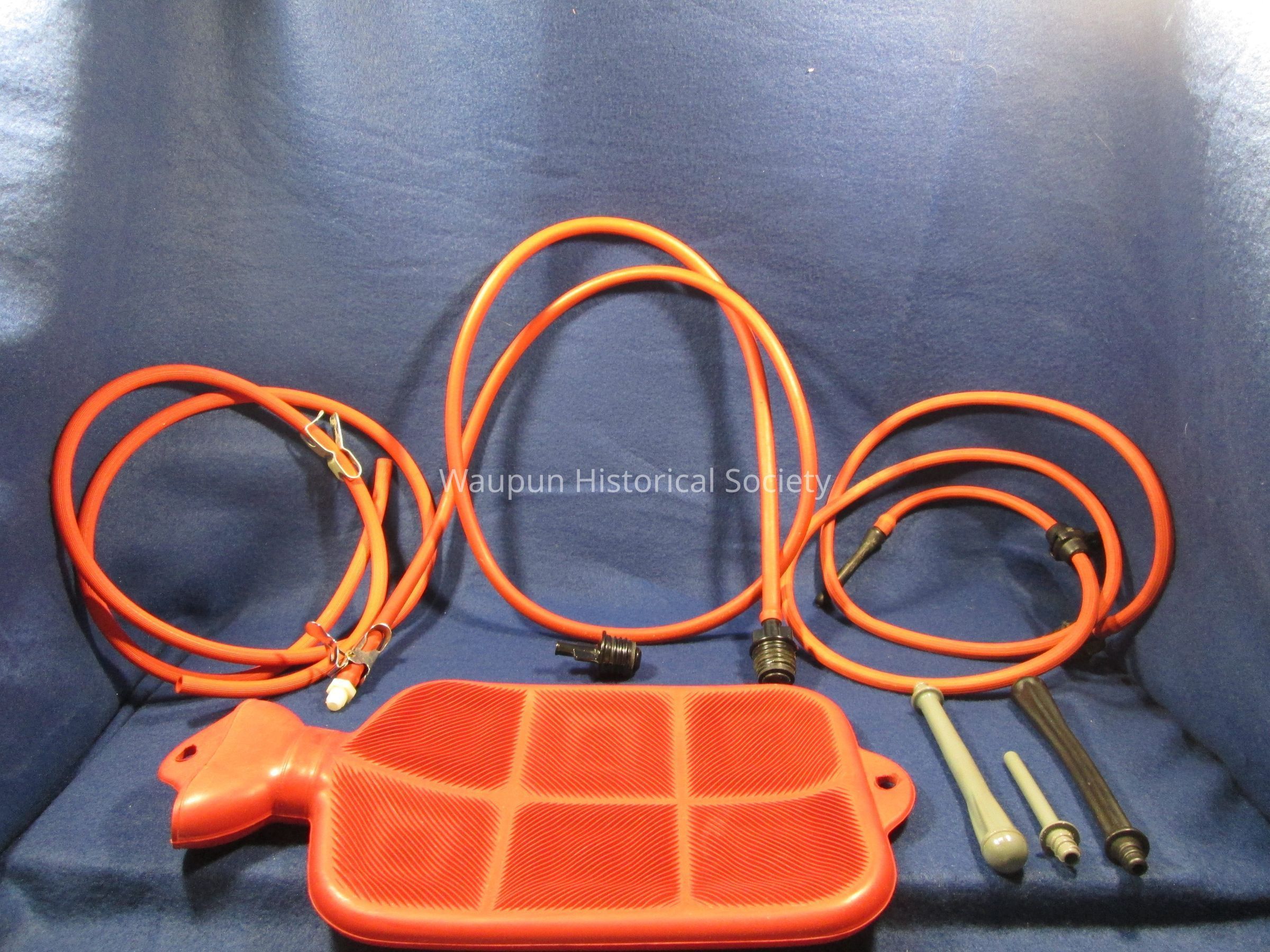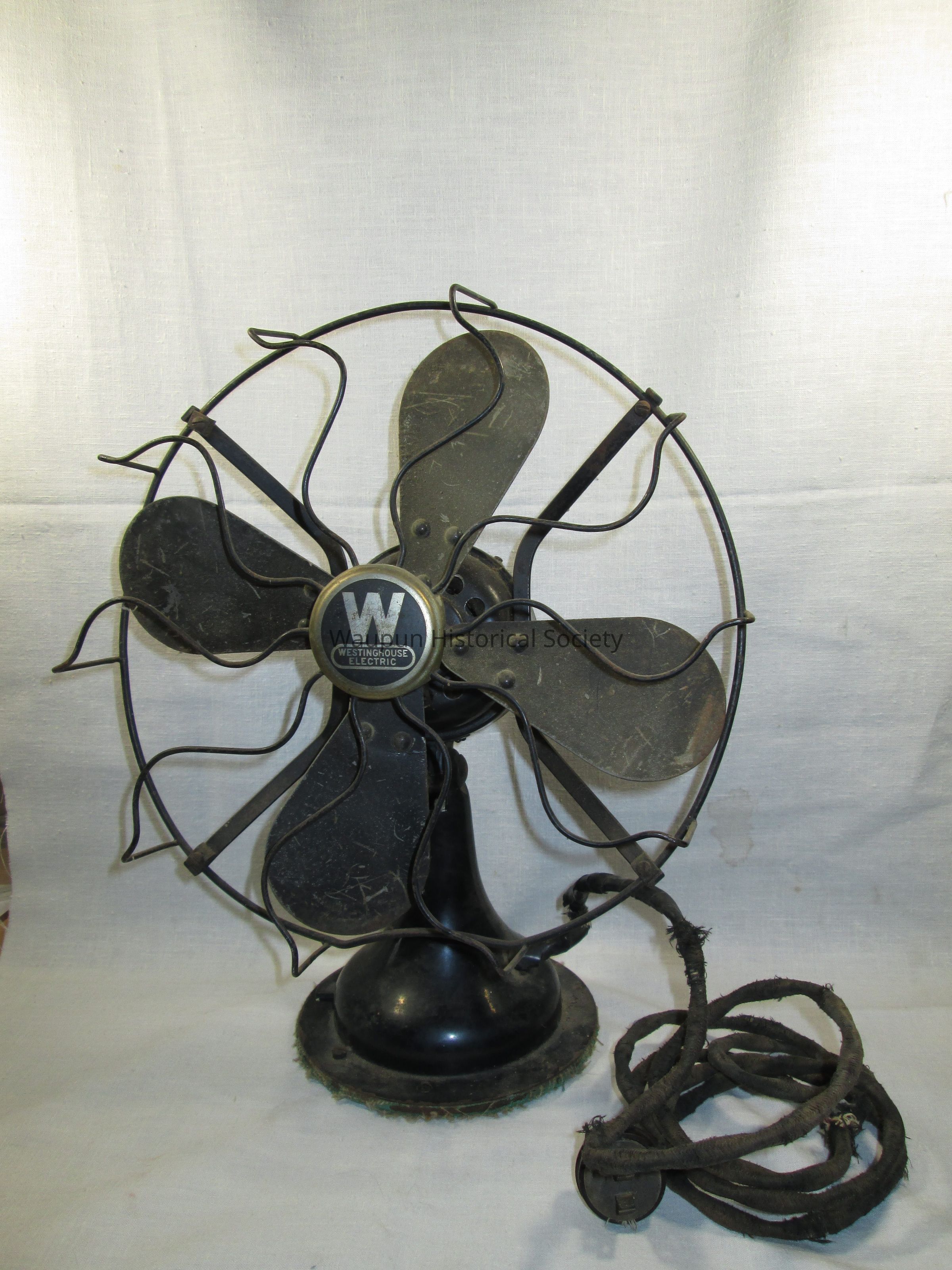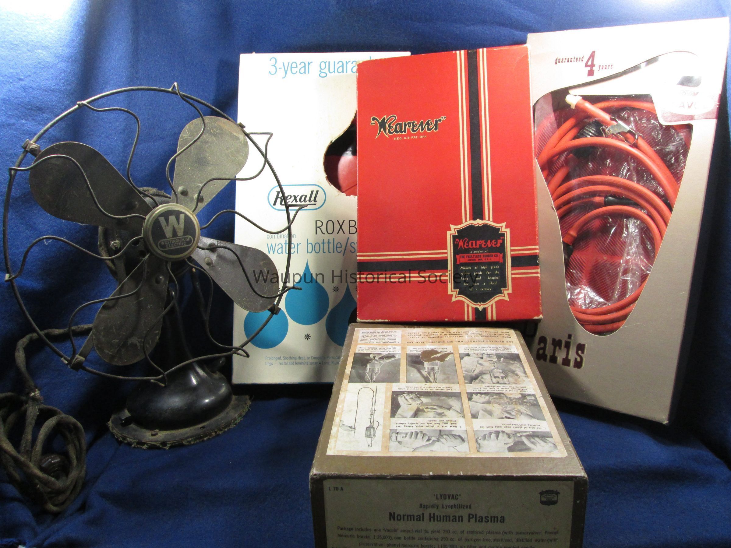 Open blade fan. Black in color, made by Westinghouse. Medical pieces including three hot water bottles and tubing. Medical pieces are red in color and made from rubber. One box of first aid items. Items include bandages, tourniquet, cleaning solutions, tongue depressor, clip, sticks, and instructions.Acquisition