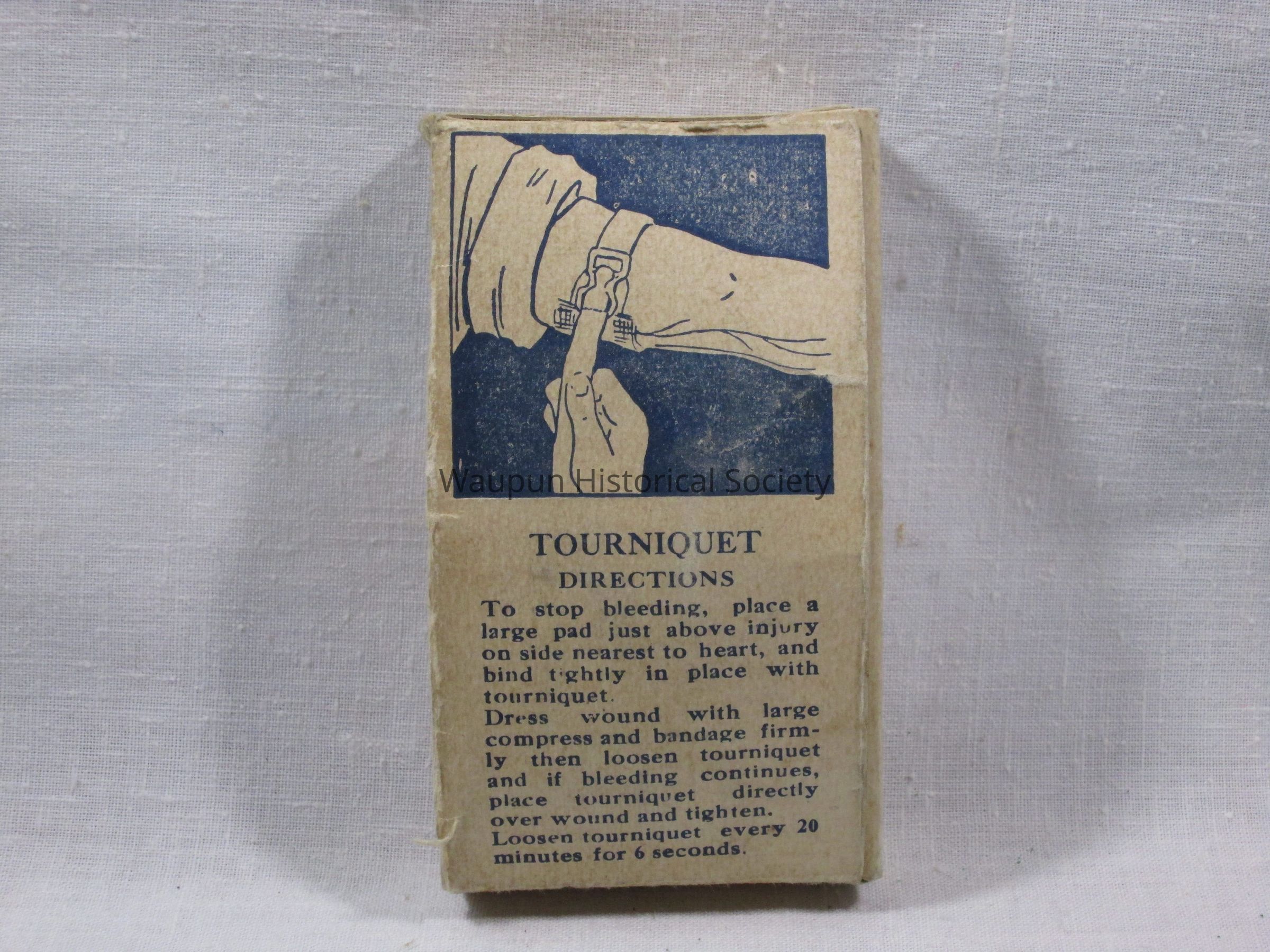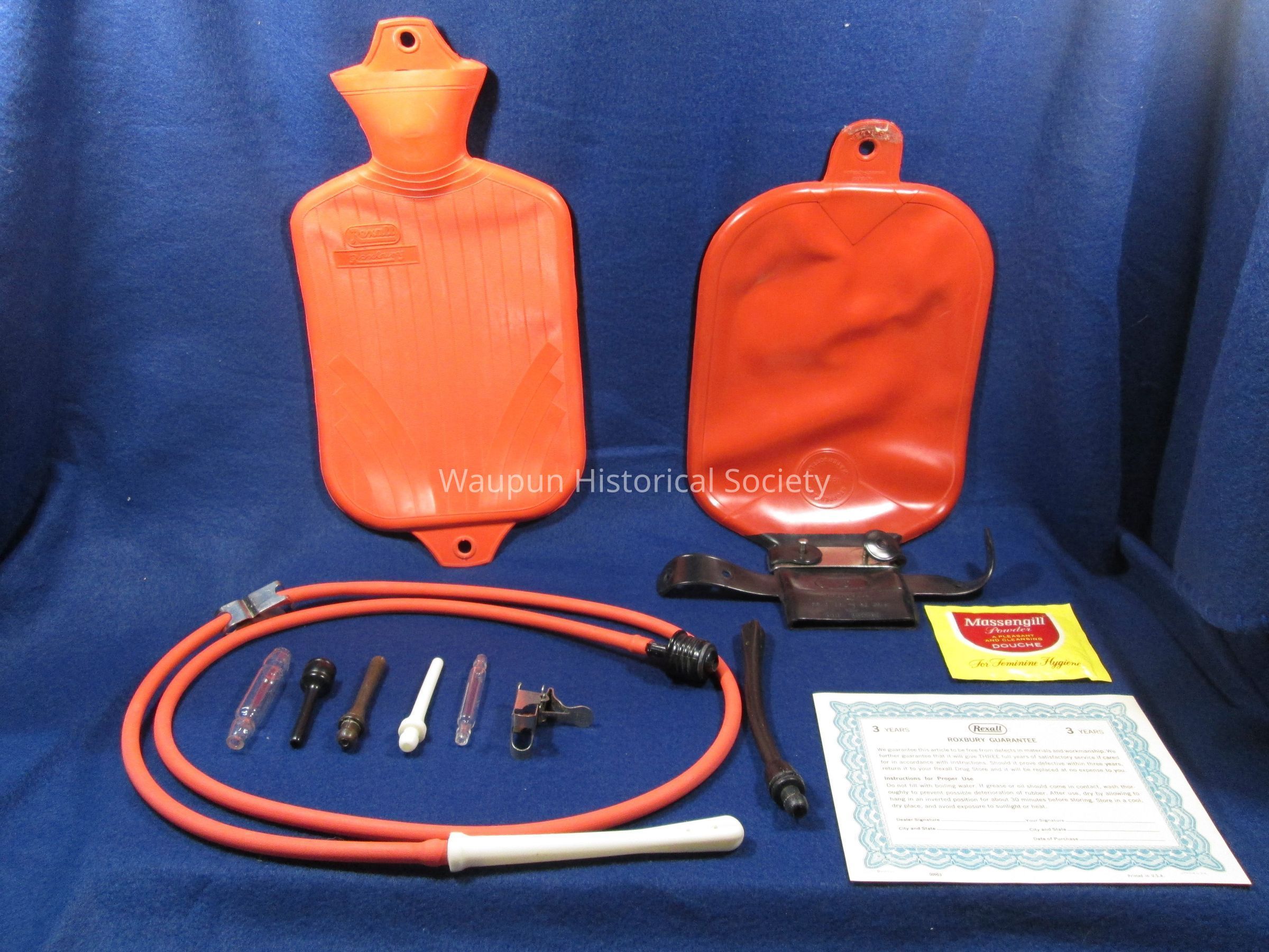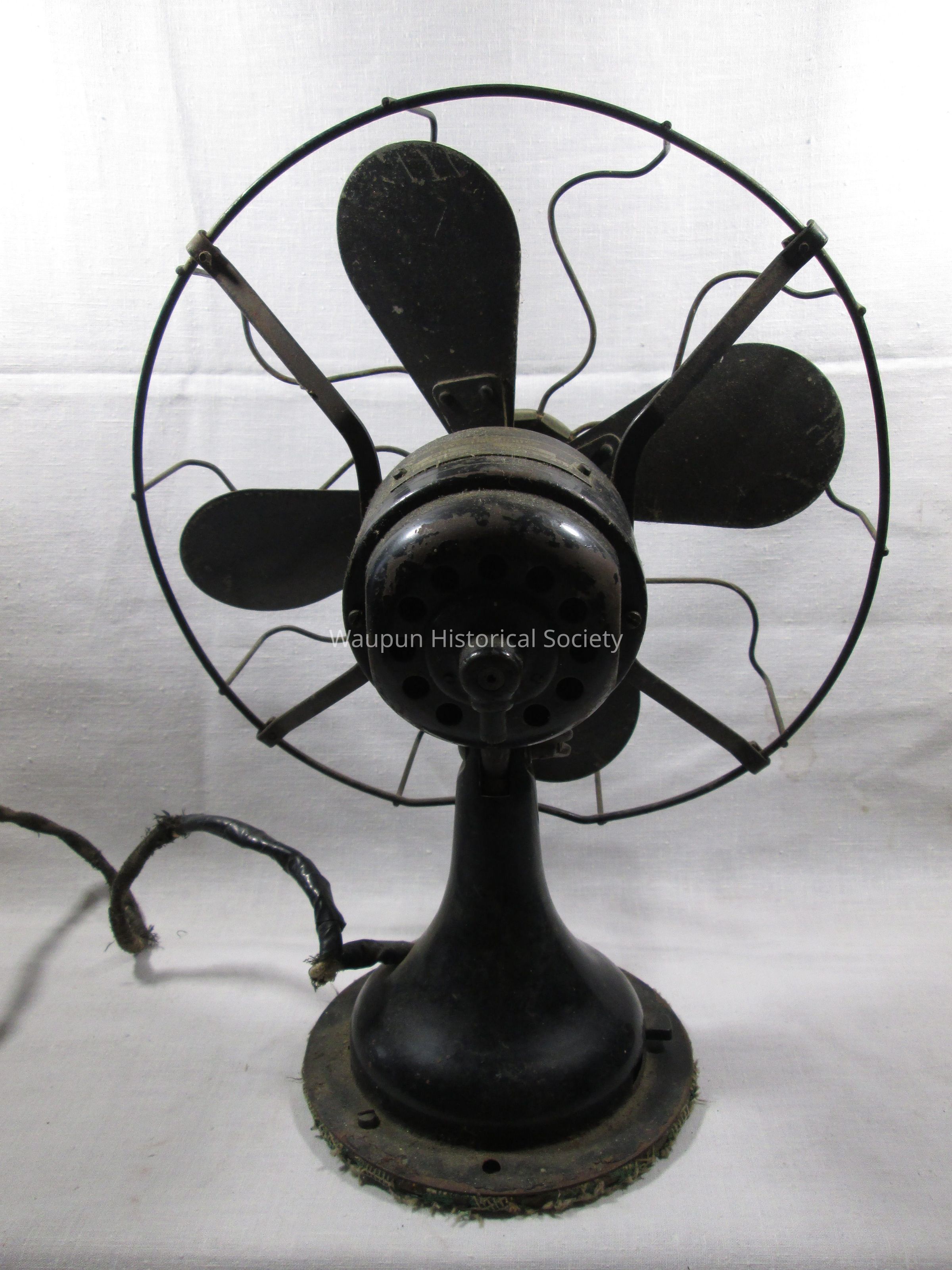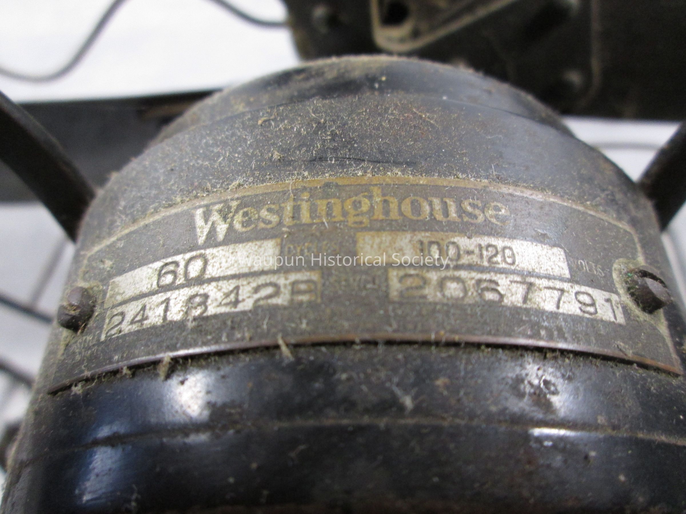 Open blade fan. Black in color, made by Westinghouse. Medical pieces including three hot water bottles and tubing. Medical pieces are red in color and made from rubber. One box of first aid items. Items include bandages, tourniquet, cleaning solutions, tongue depressor, clip, sticks, and instructions.Acquisition