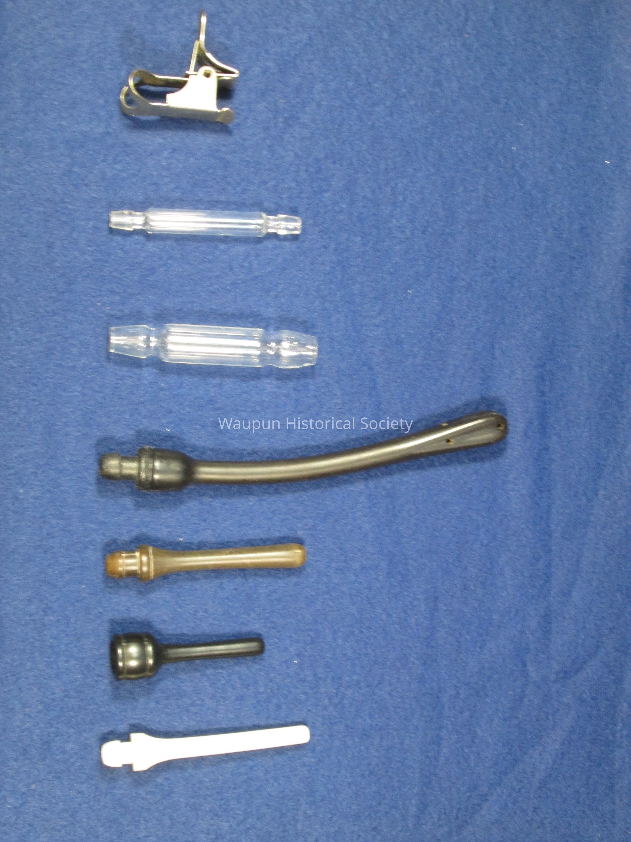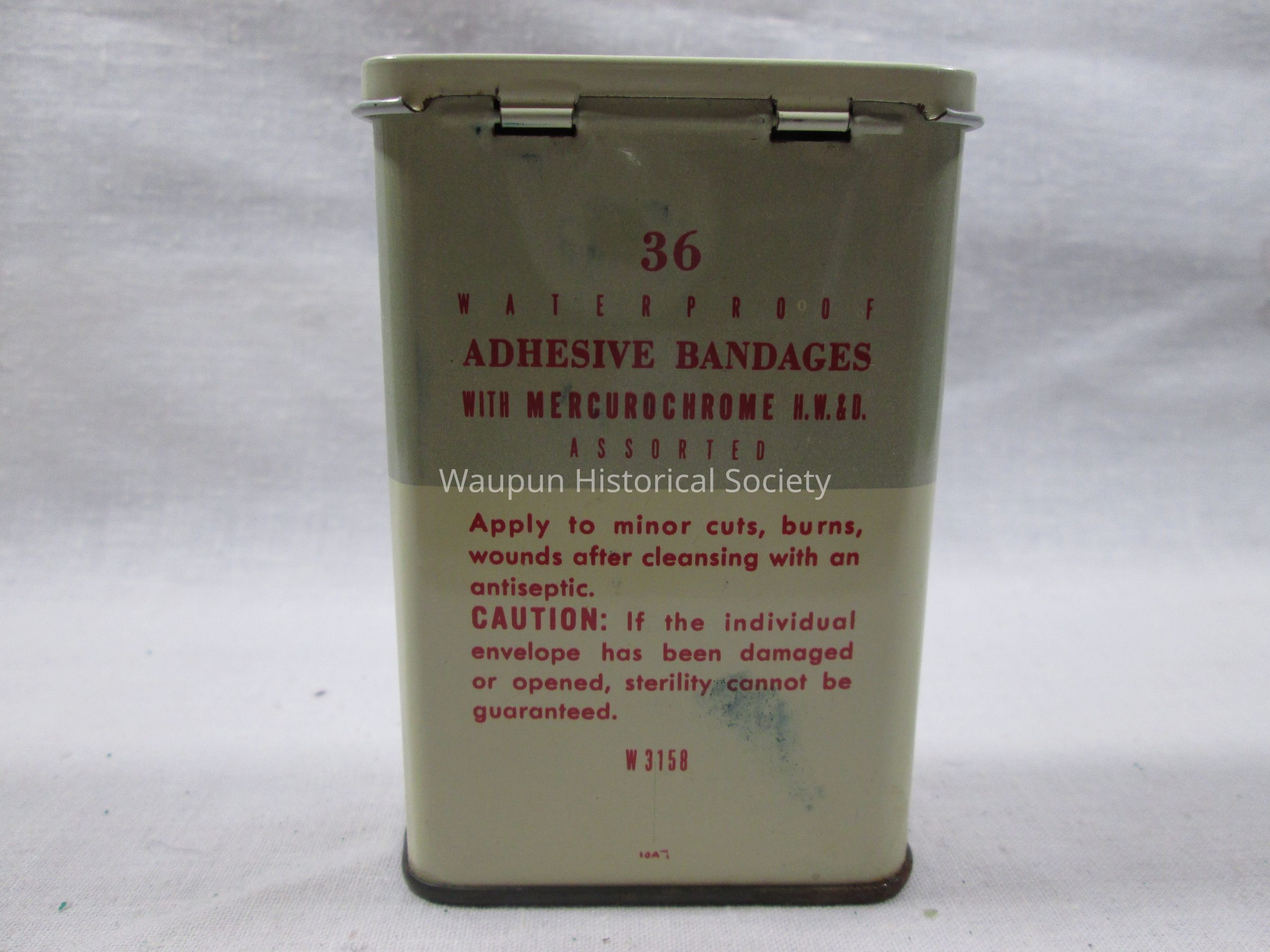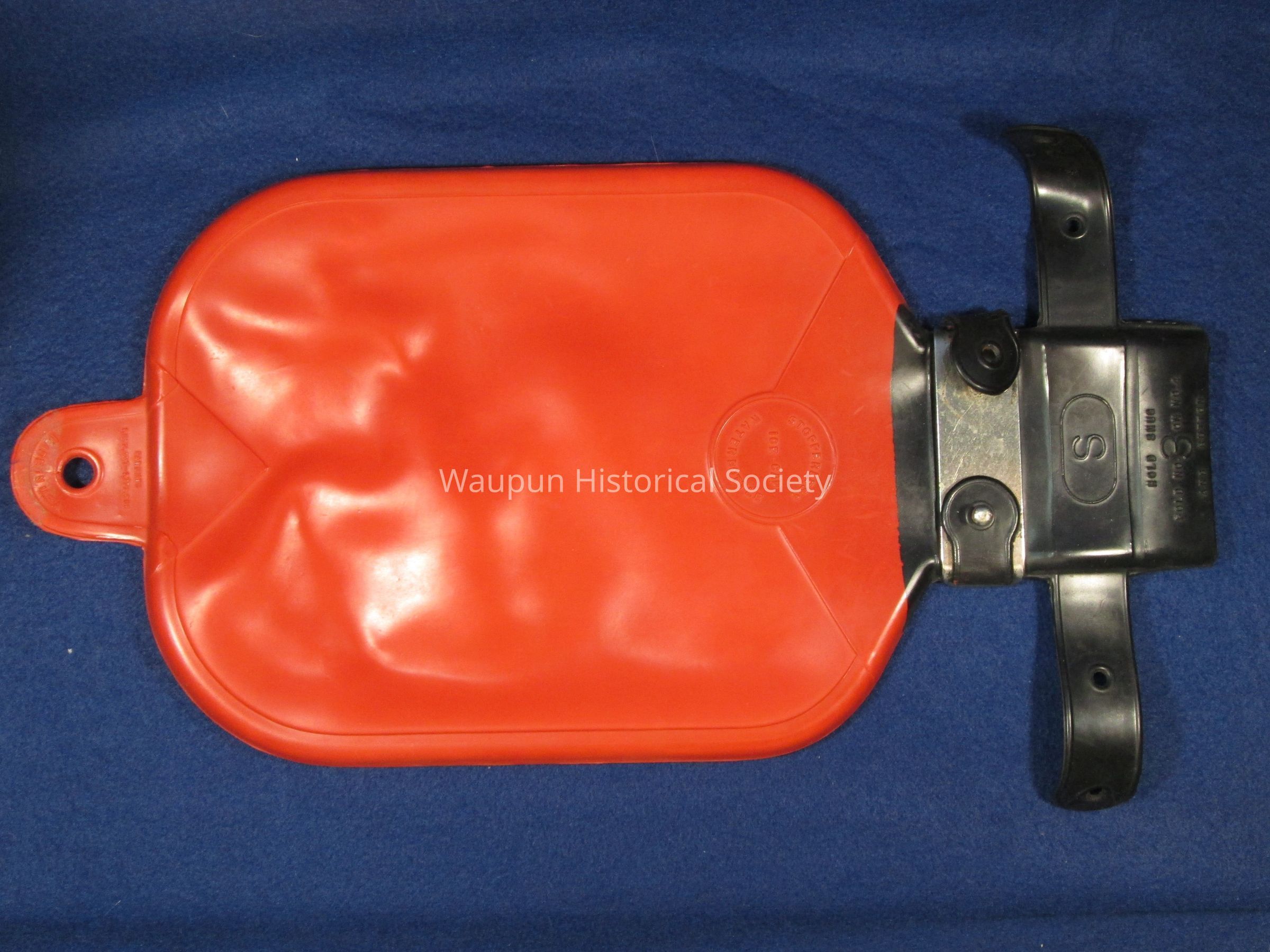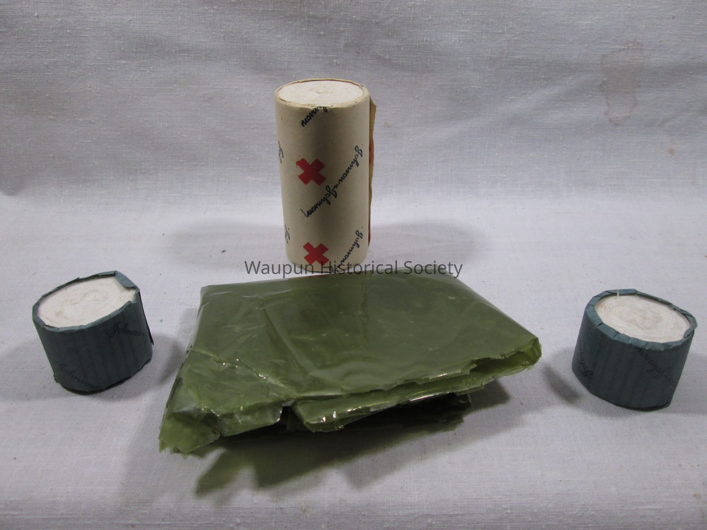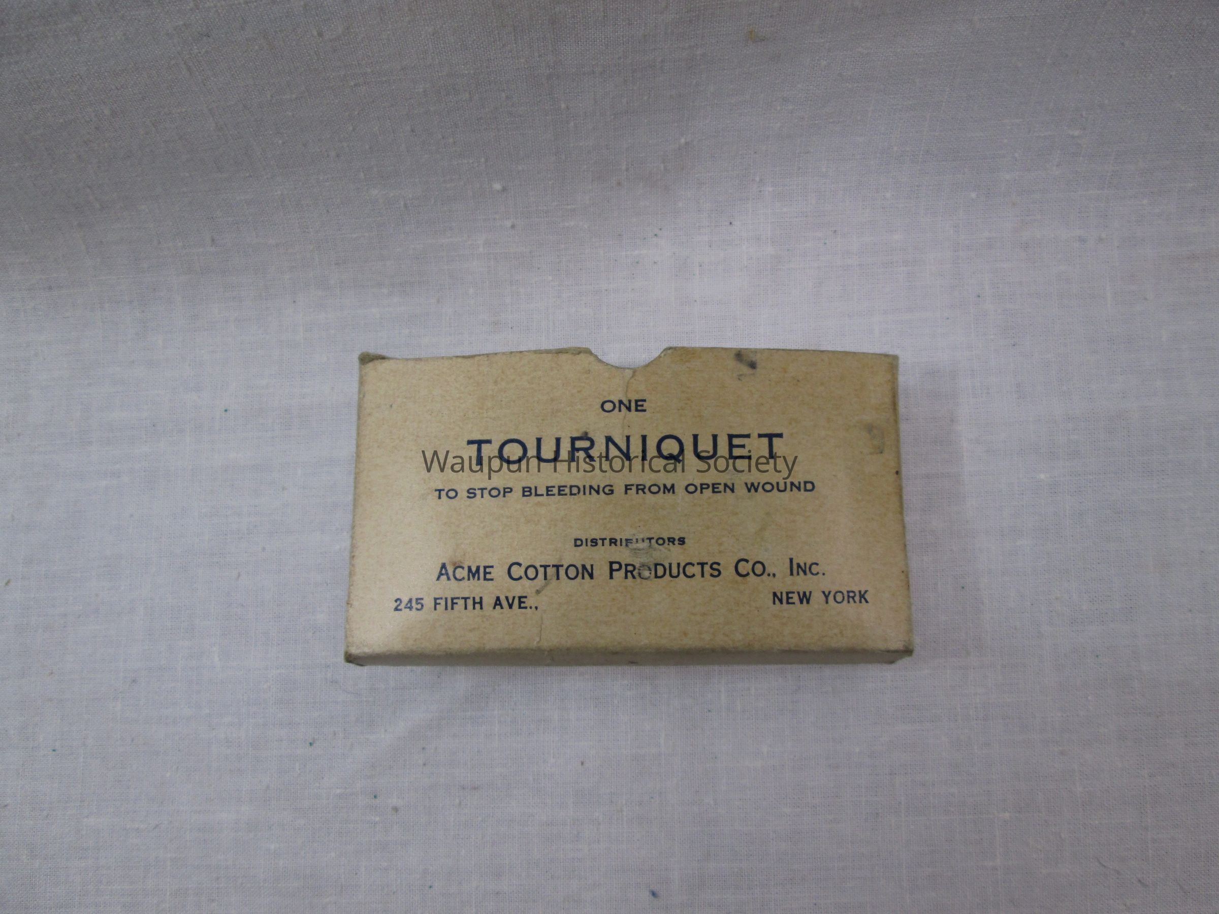 Open blade fan. Black in color, made by Westinghouse. Medical pieces including three hot water bottles and tubing. Medical pieces are red in color and made from rubber. One box of first aid items. Items include bandages, tourniquet, cleaning solutions, tongue depressor, clip, sticks, and instructions.Acquisition