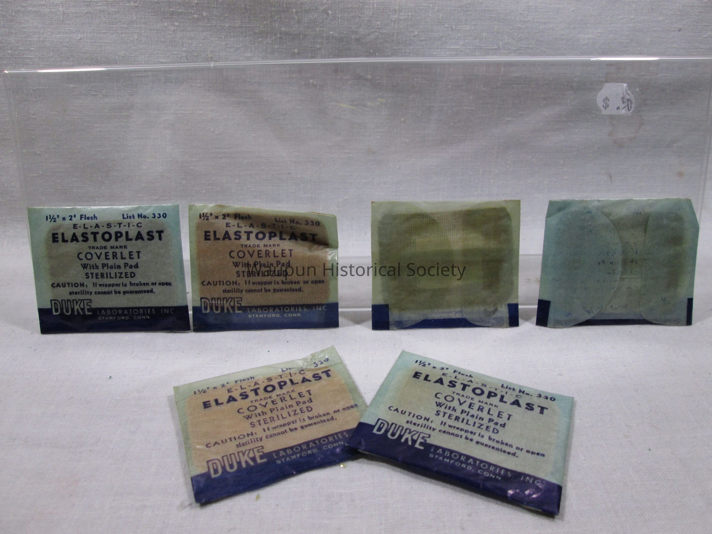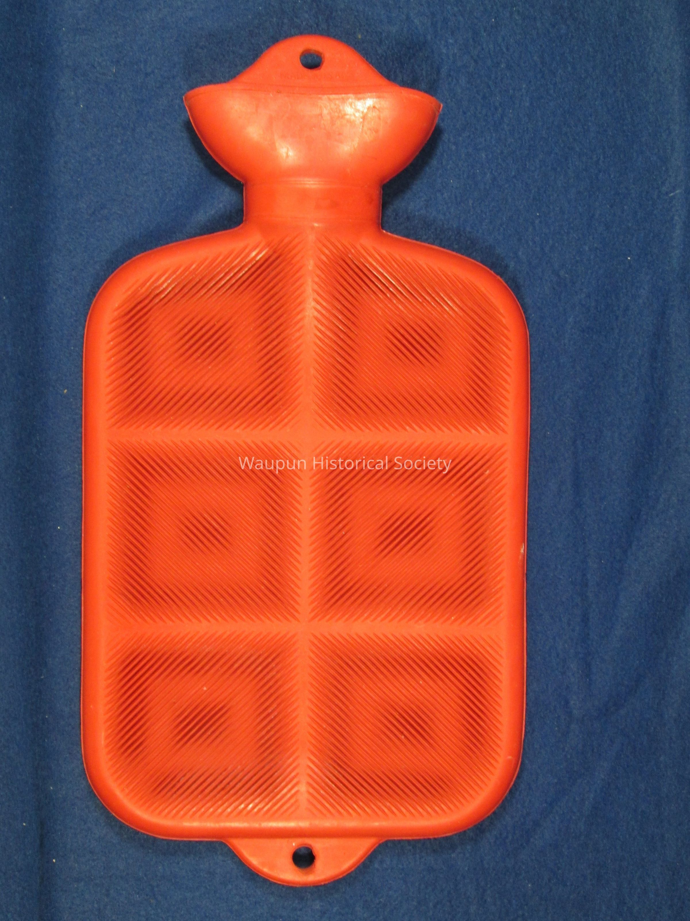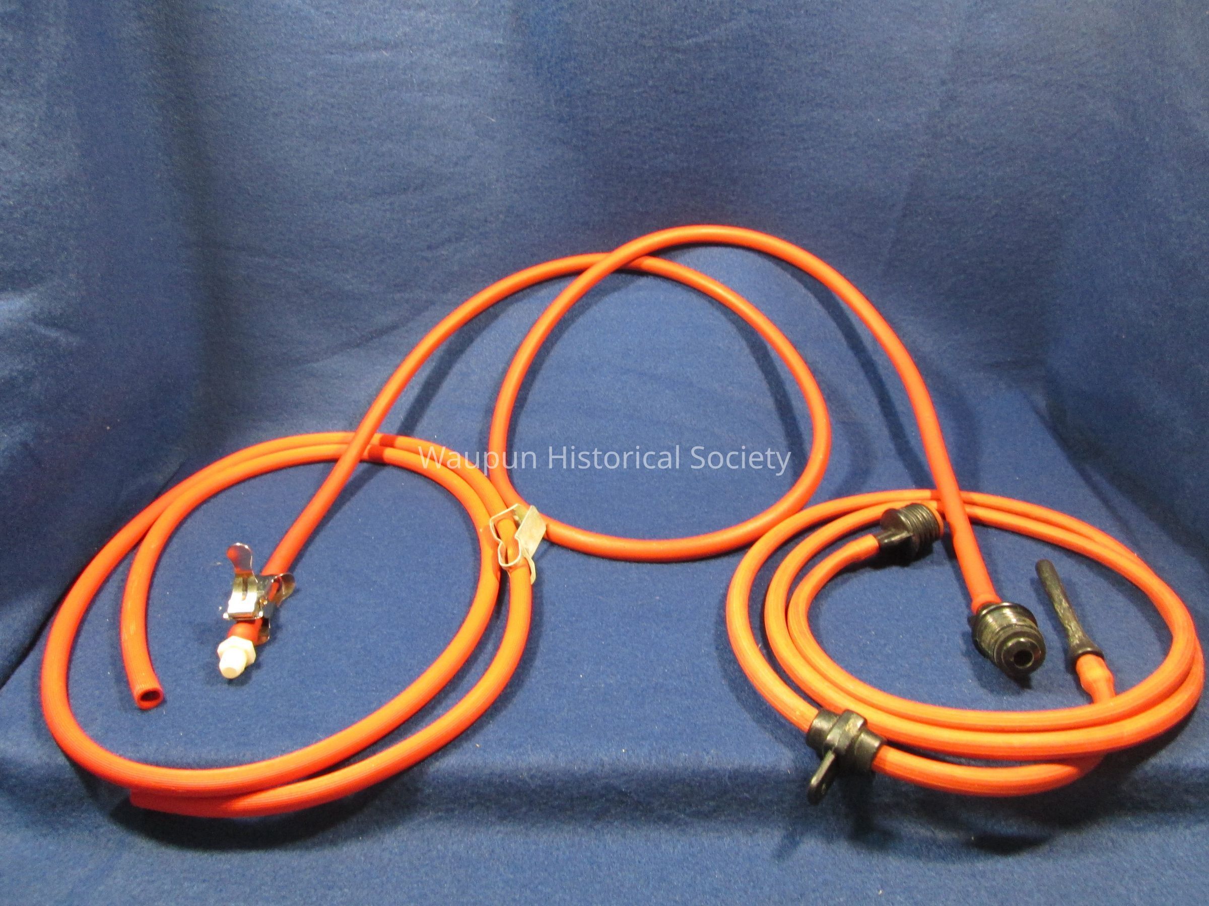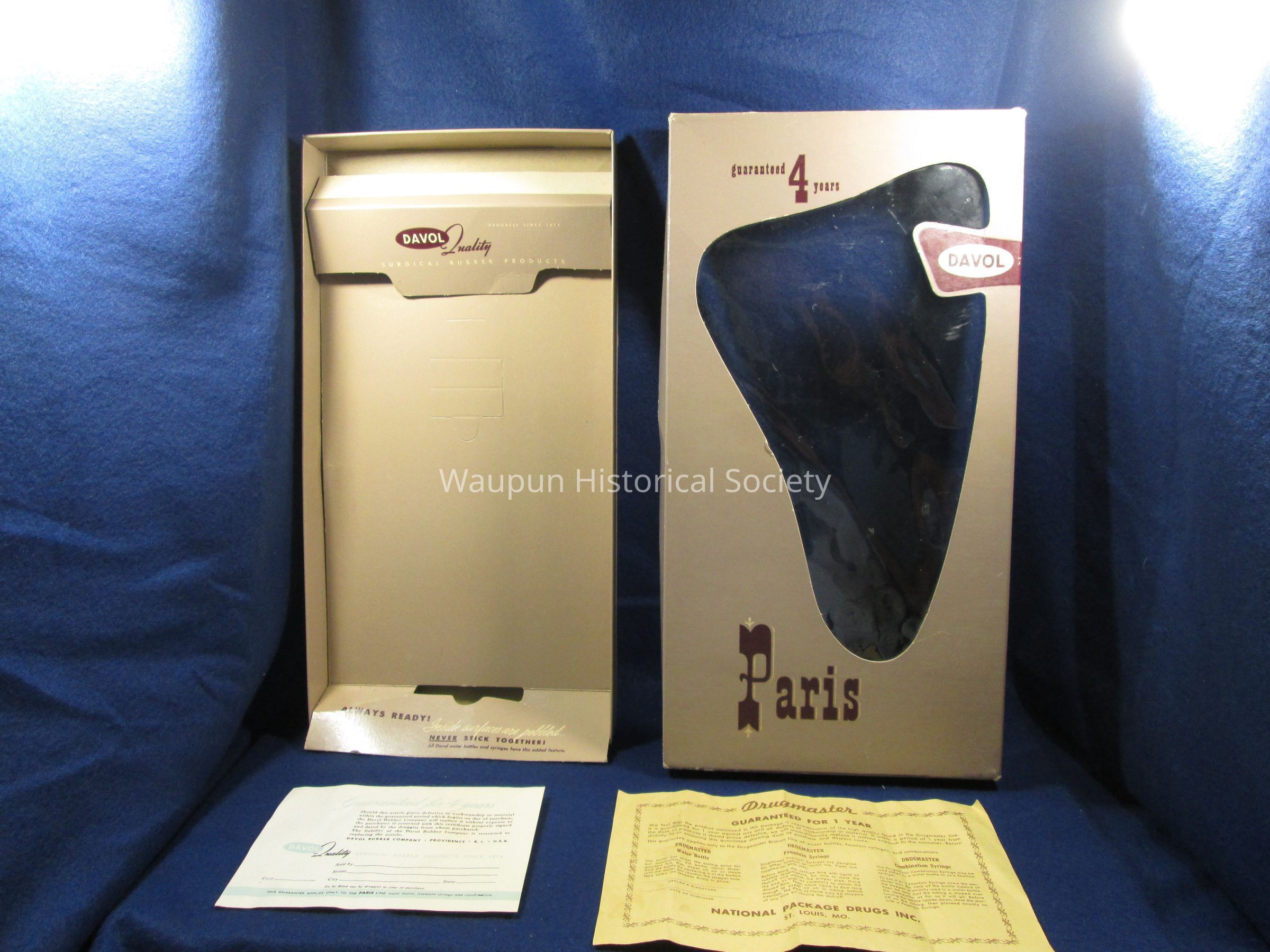 Open blade fan. Black in color, made by Westinghouse. Medical pieces including three hot water bottles and tubing. Medical pieces are red in color and made from rubber. One box of first aid items. Items include bandages, tourniquet, cleaning solutions, tongue depressor, clip, sticks, and instructions.Acquisition