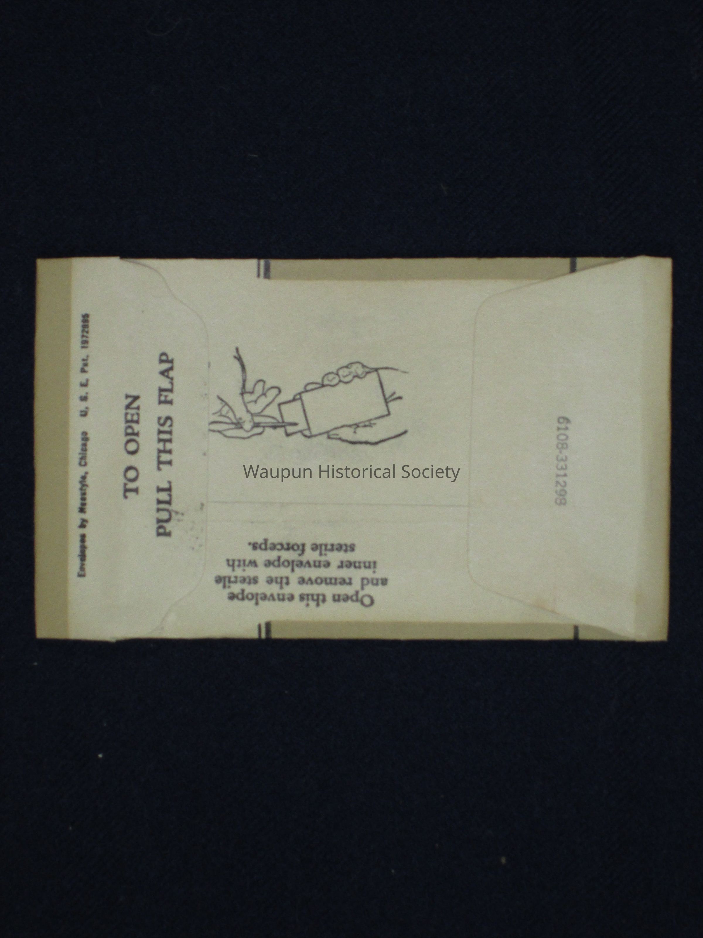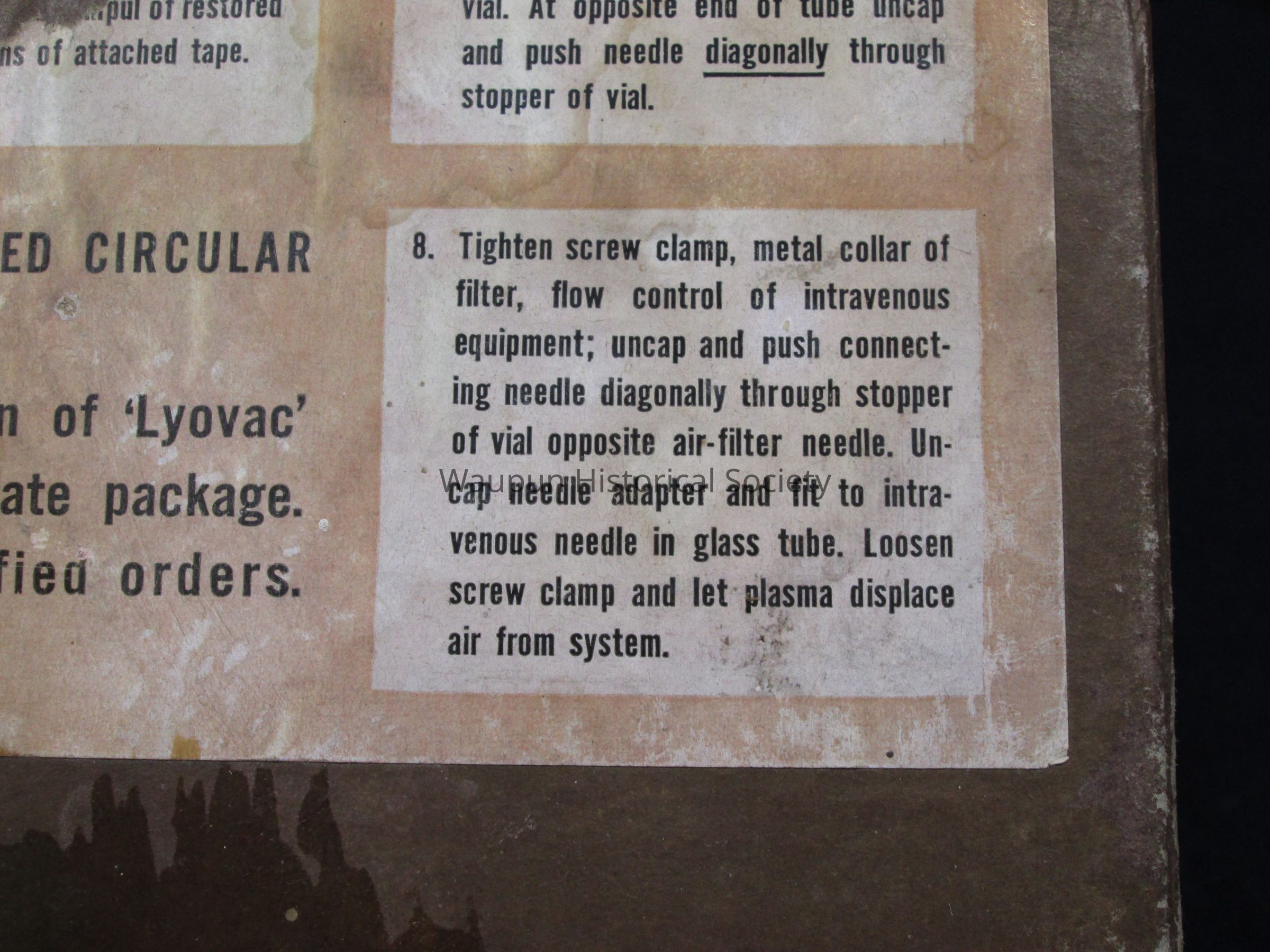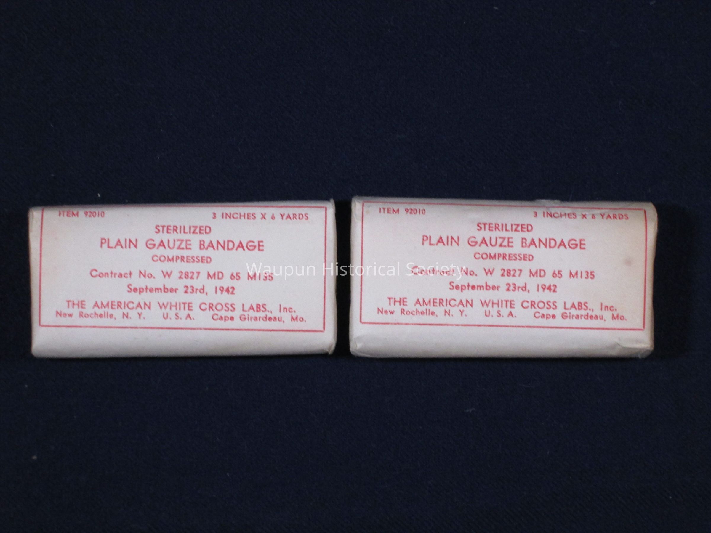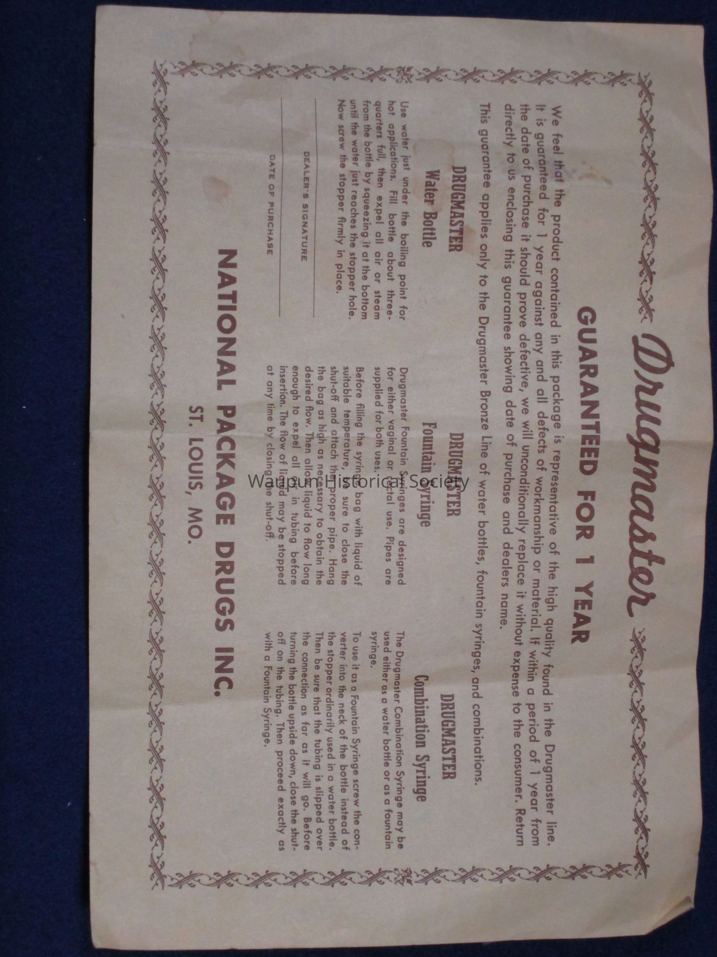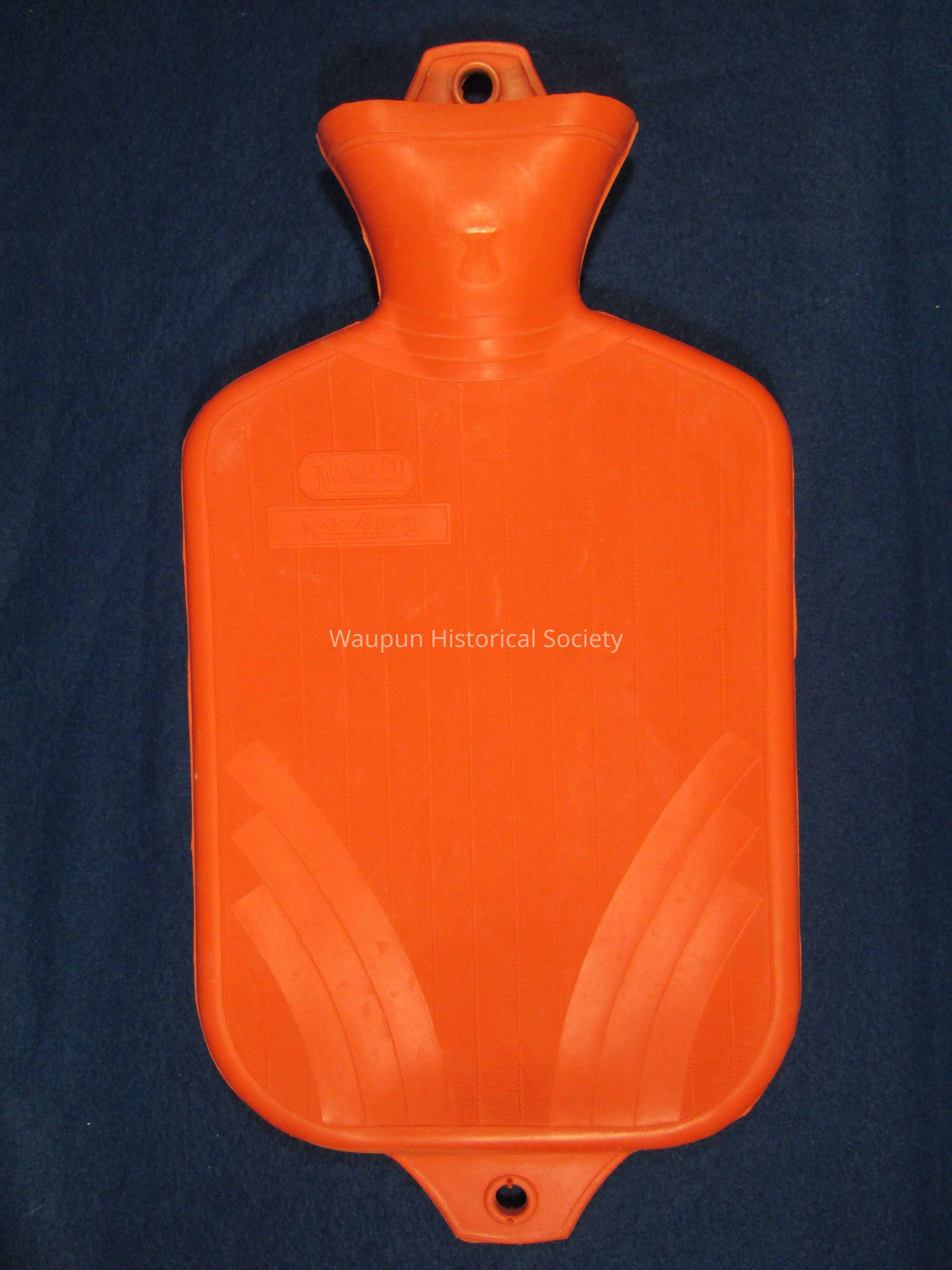 Open blade fan. Black in color, made by Westinghouse. Medical pieces including three hot water bottles and tubing. Medical pieces are red in color and made from rubber. One box of first aid items. Items include bandages, tourniquet, cleaning solutions, tongue depressor, clip, sticks, and instructions.Acquisition