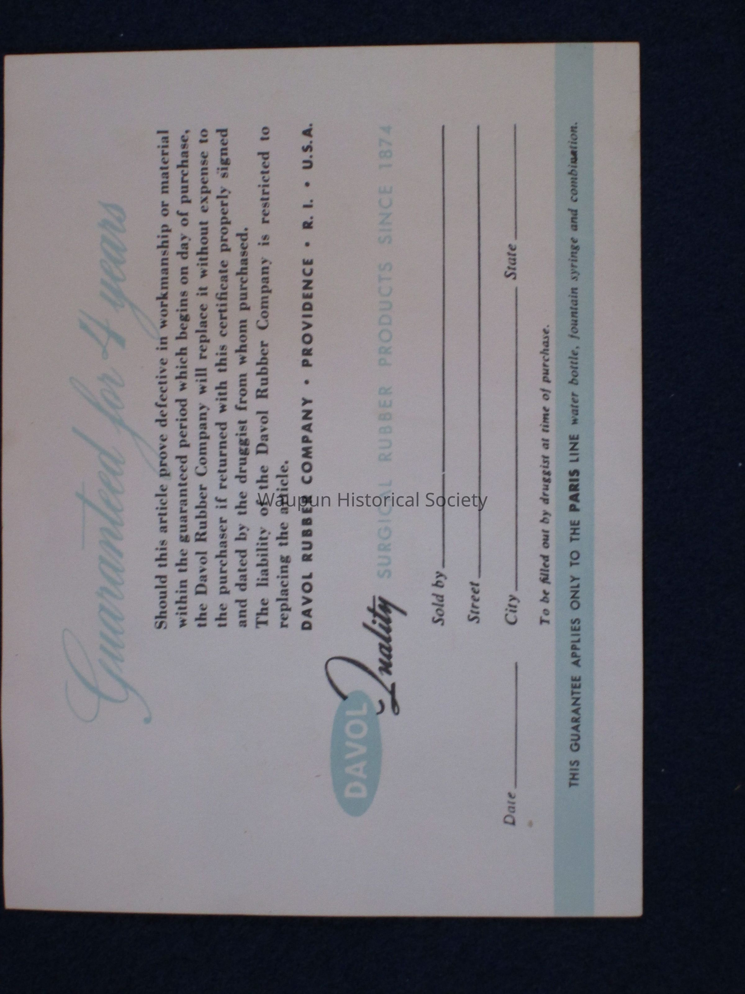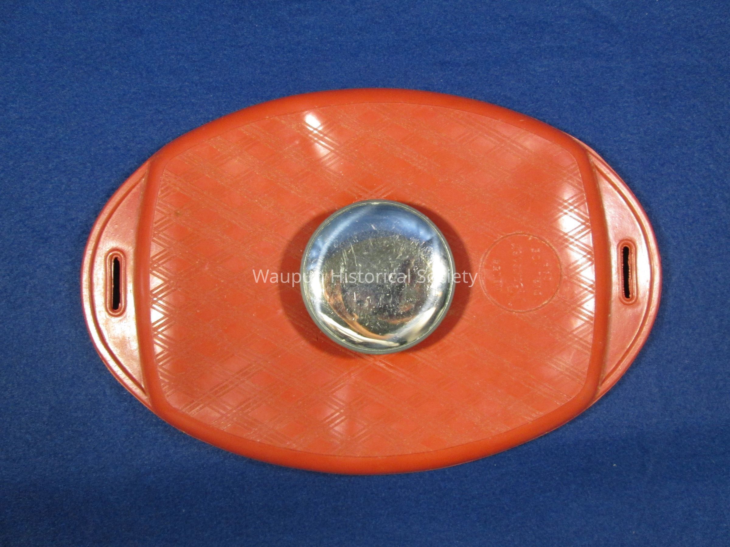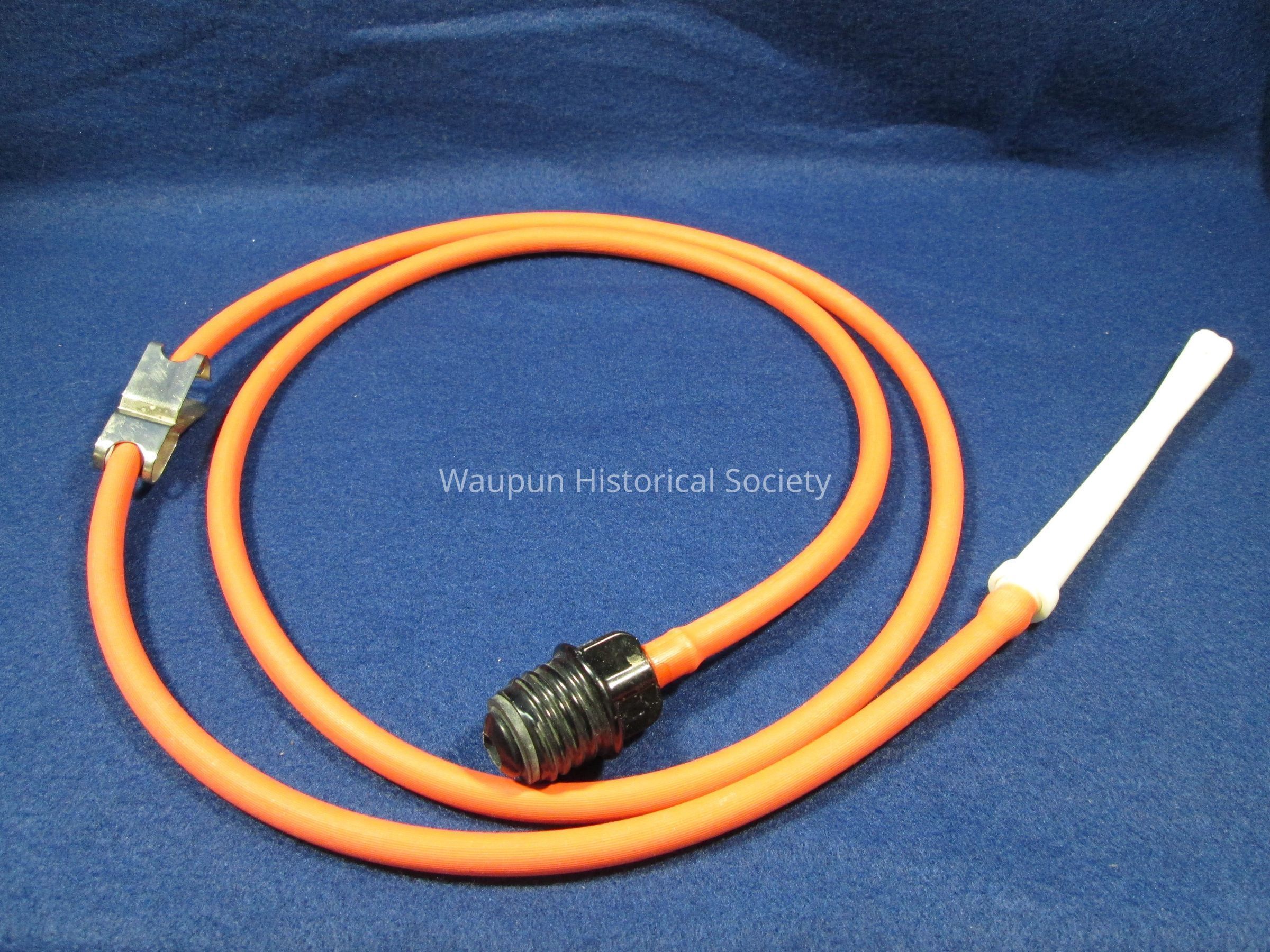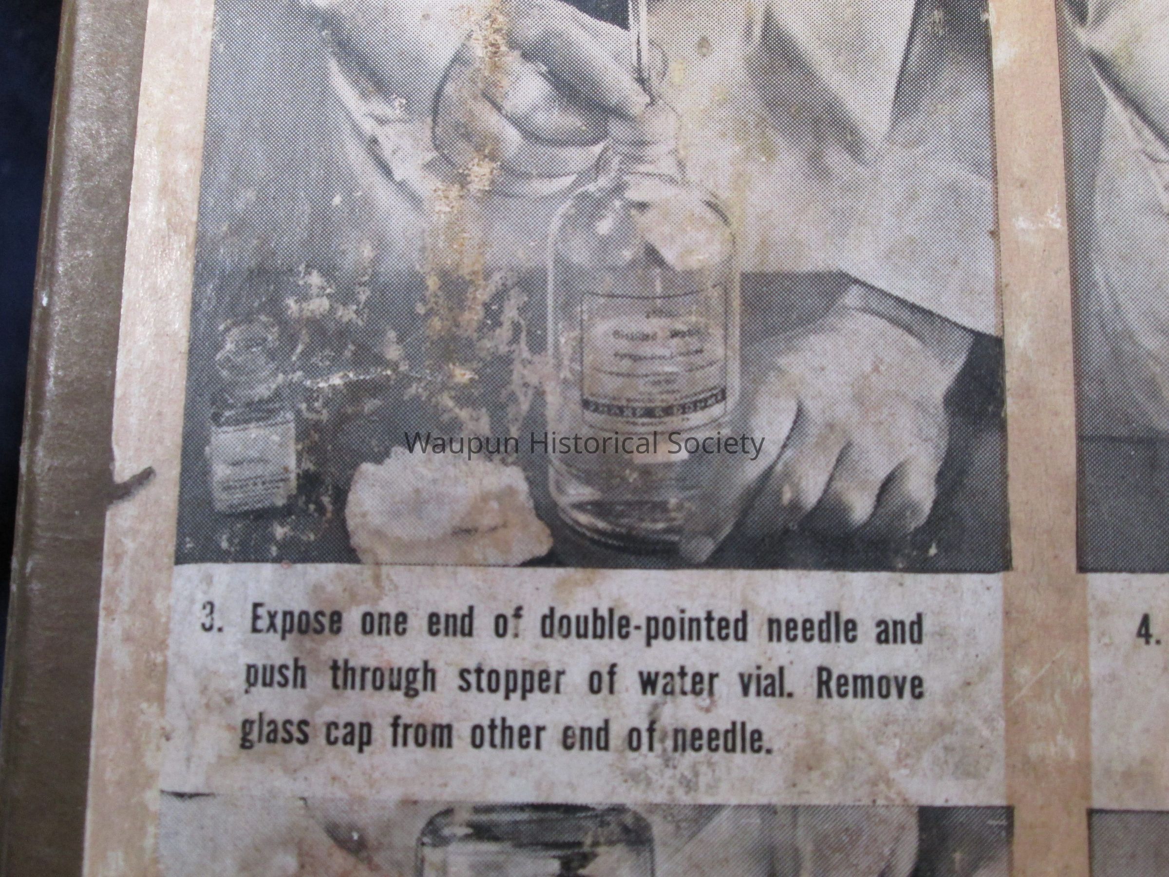 Open blade fan. Black in color, made by Westinghouse. Medical pieces including three hot water bottles and tubing. Medical pieces are red in color and made from rubber. One box of first aid items. Items include bandages, tourniquet, cleaning solutions, tongue depressor, clip, sticks, and instructions.Acquisition