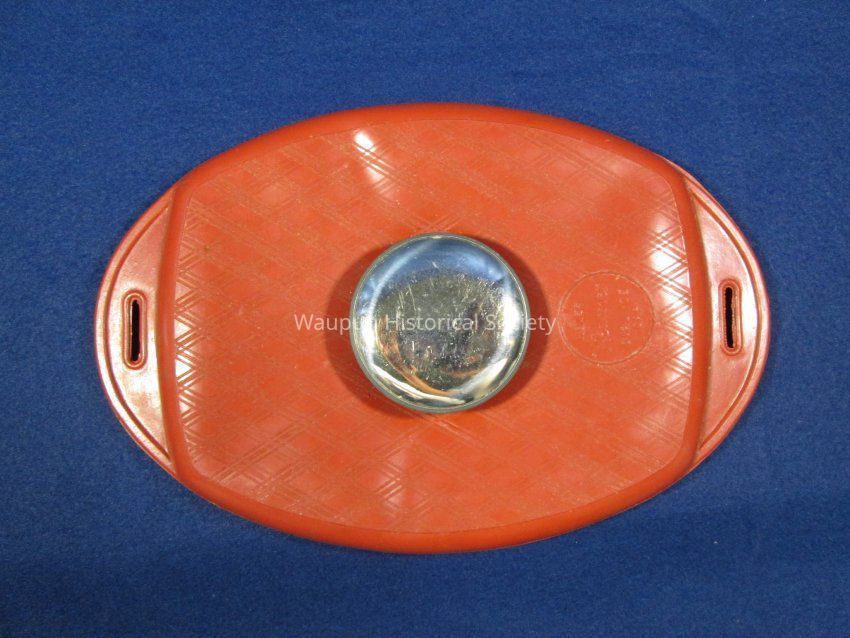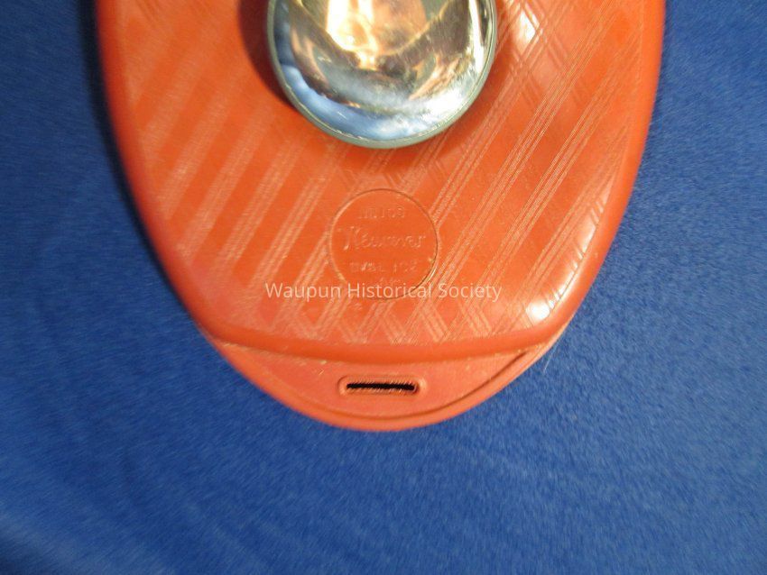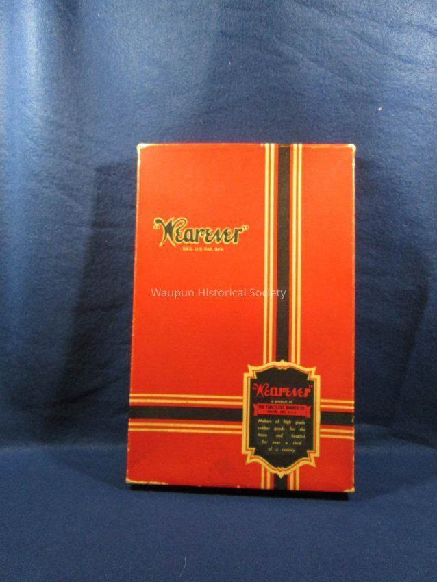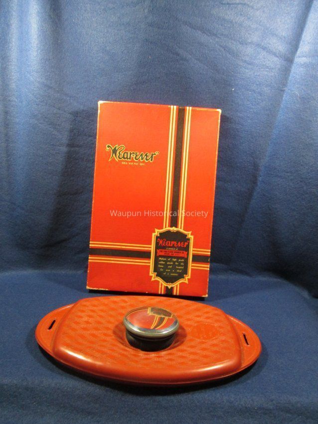 Red hot water bottle in a red box. Has a metal cap on top where the water goes in. "Wearever" Oval Ice Cap, No. 155. The Faultless Rubber Co., Ashland, Ohio.Acquisition