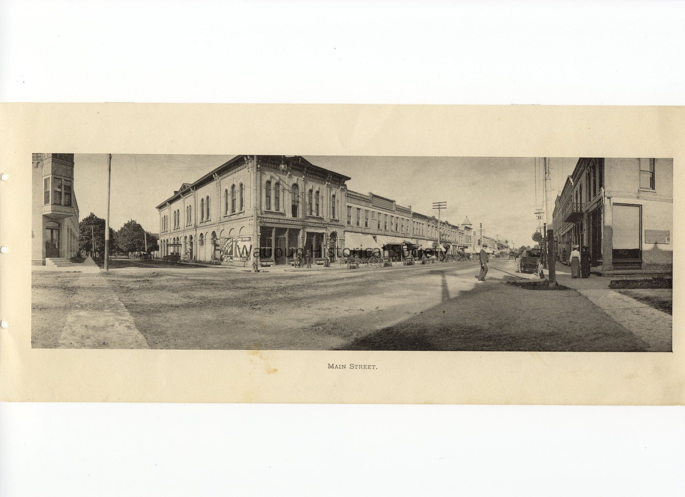 This photo is entitled "Main Street" taken at the corner of Main and North Mill Streets, and shows, 1) the corner Post Office - owned by Louis Butts, 2) Bernhardt & Hodeck grocery store, 3) Howard & Hartergrink Hardward store. If you look down N. Mill in the P.O. builiding you will see the steam laundry.Acquisition