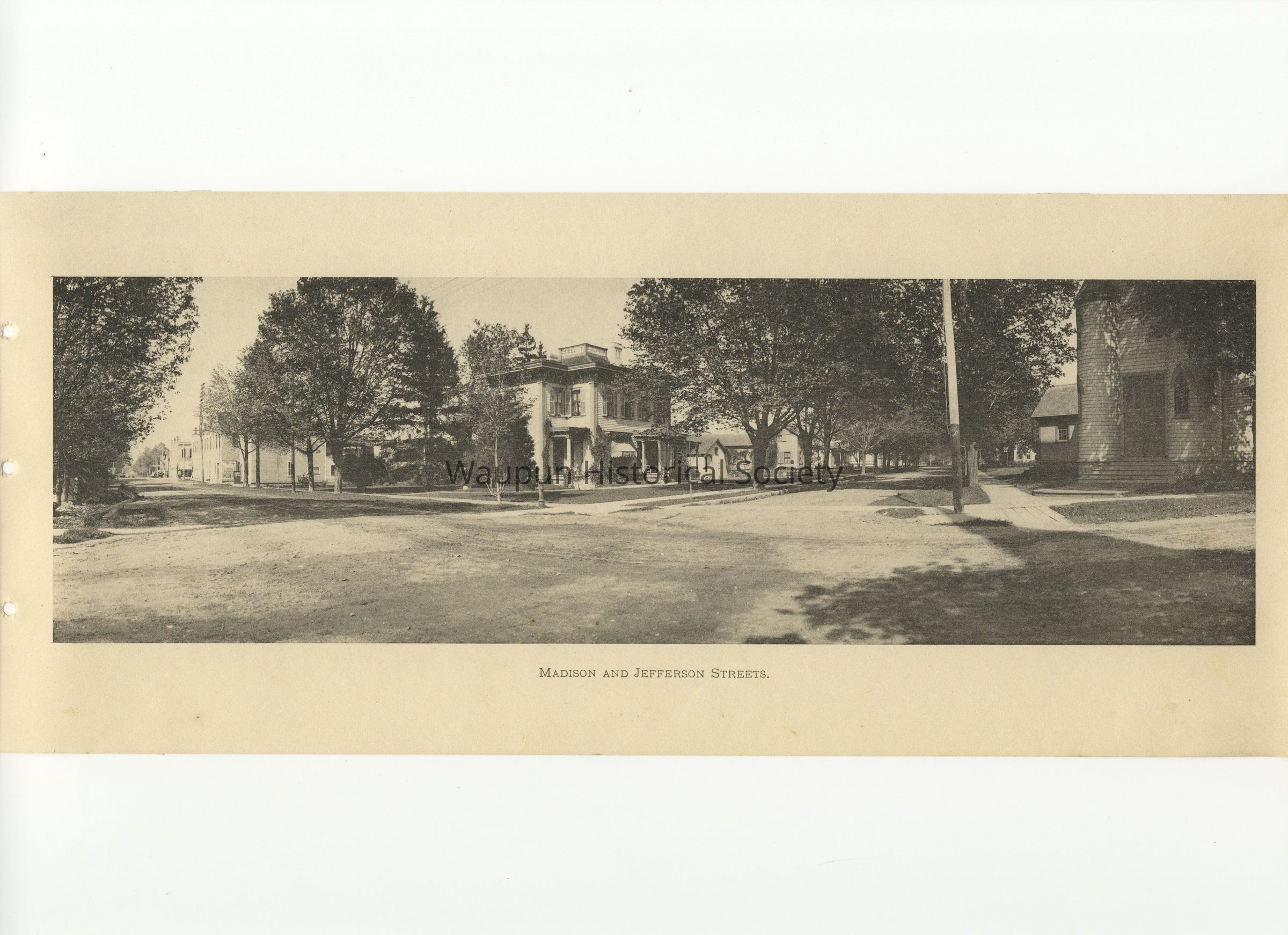 This photo is entitled: "Madison and Jefferson Streets" and shows, 1) Left - Beach home - Andrews (Old Hospital). On the Right side; 1) Trinity Church, 2) Armga house, 3) Minnie Herman 4) John TaylorAcquisition