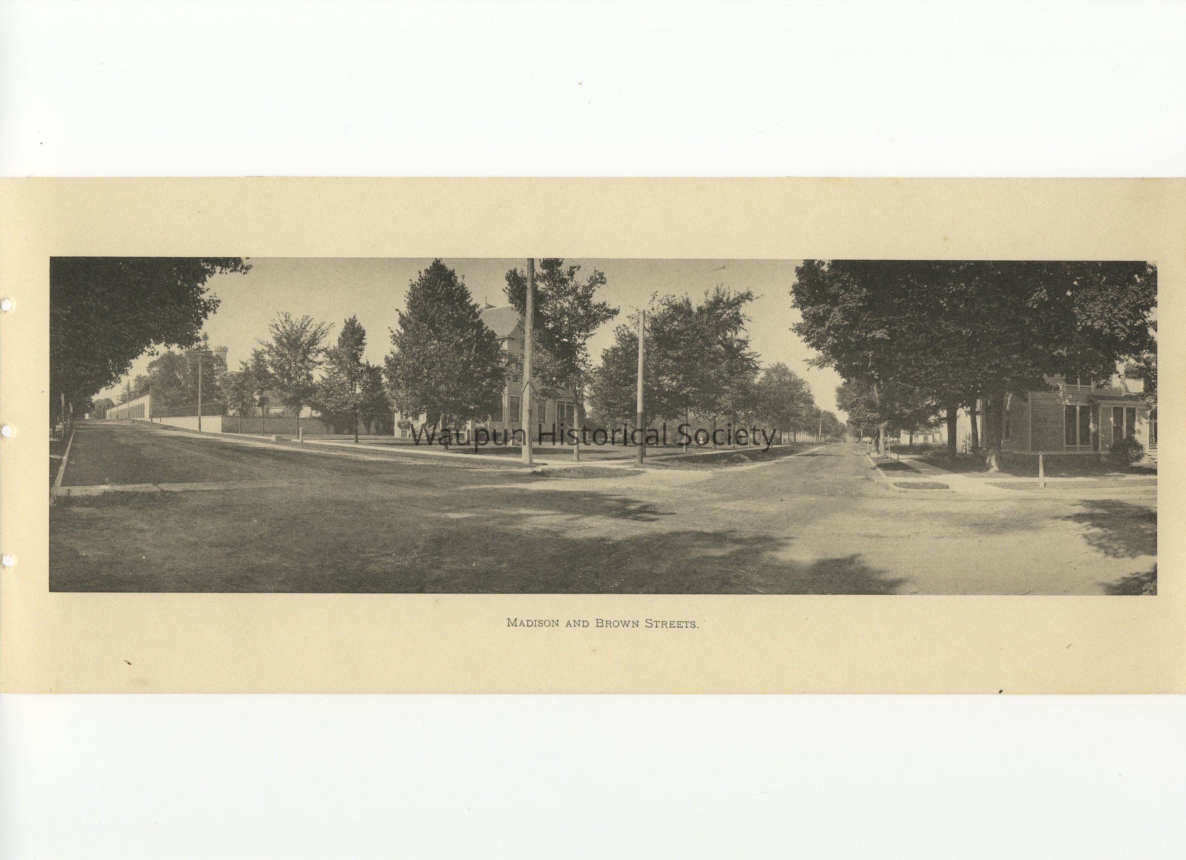 Panoram Views of Waupun. Madison & Brown Sts. This is a photo taken from a photo booklet with 17 panoramic photos of Waupun Wisconsin. The booklet is entitled "Panoram Views of Waupun, Wisconsin" copyright date of 1906, by J.A. Kastein, Jr. Waupun, Wisconsin, and published by "The Albertype Co., Brooklyn, N.Y.