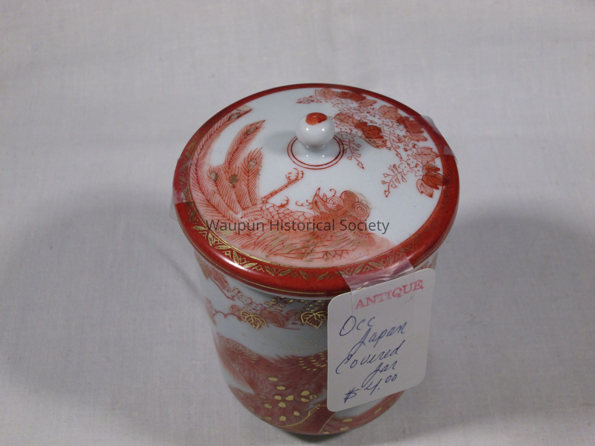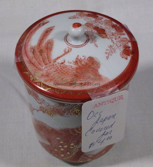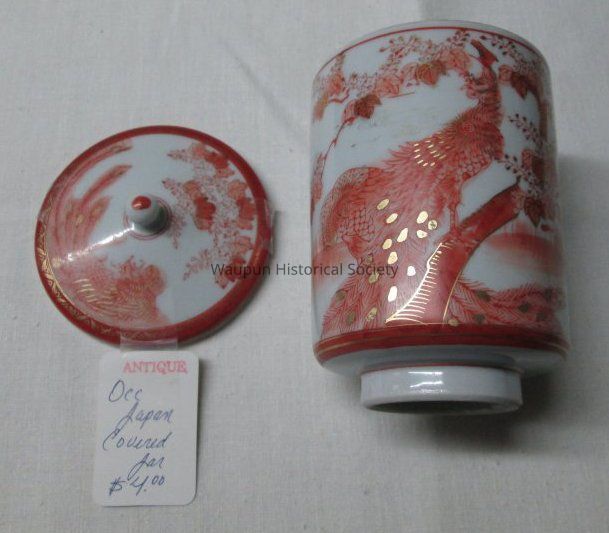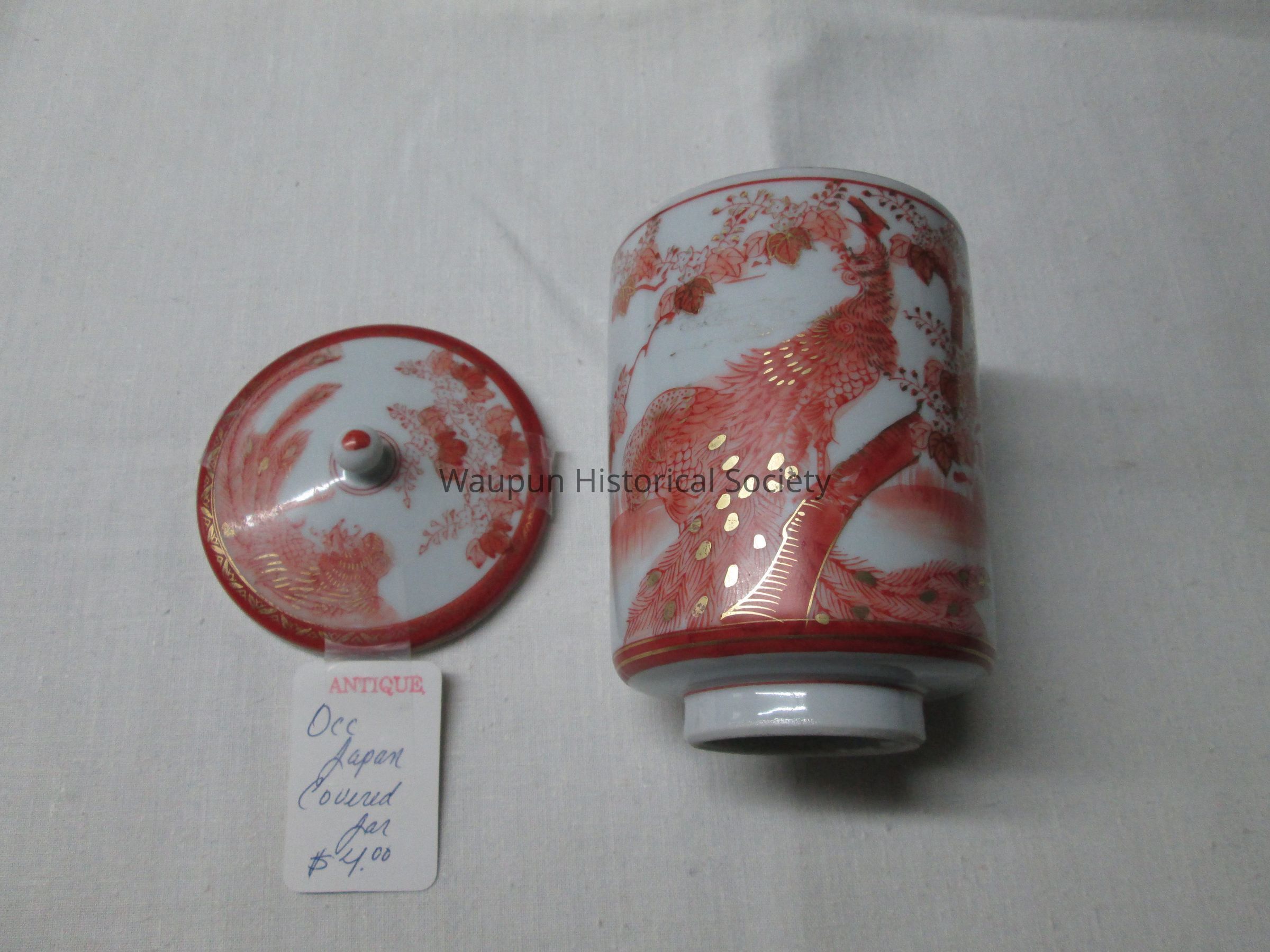 1 - Occ Japan Covered Jar with price of $4.00 tag. Jim purchased this at the Thrift Store in Waupun. Indicated as an antique.Acquisition
