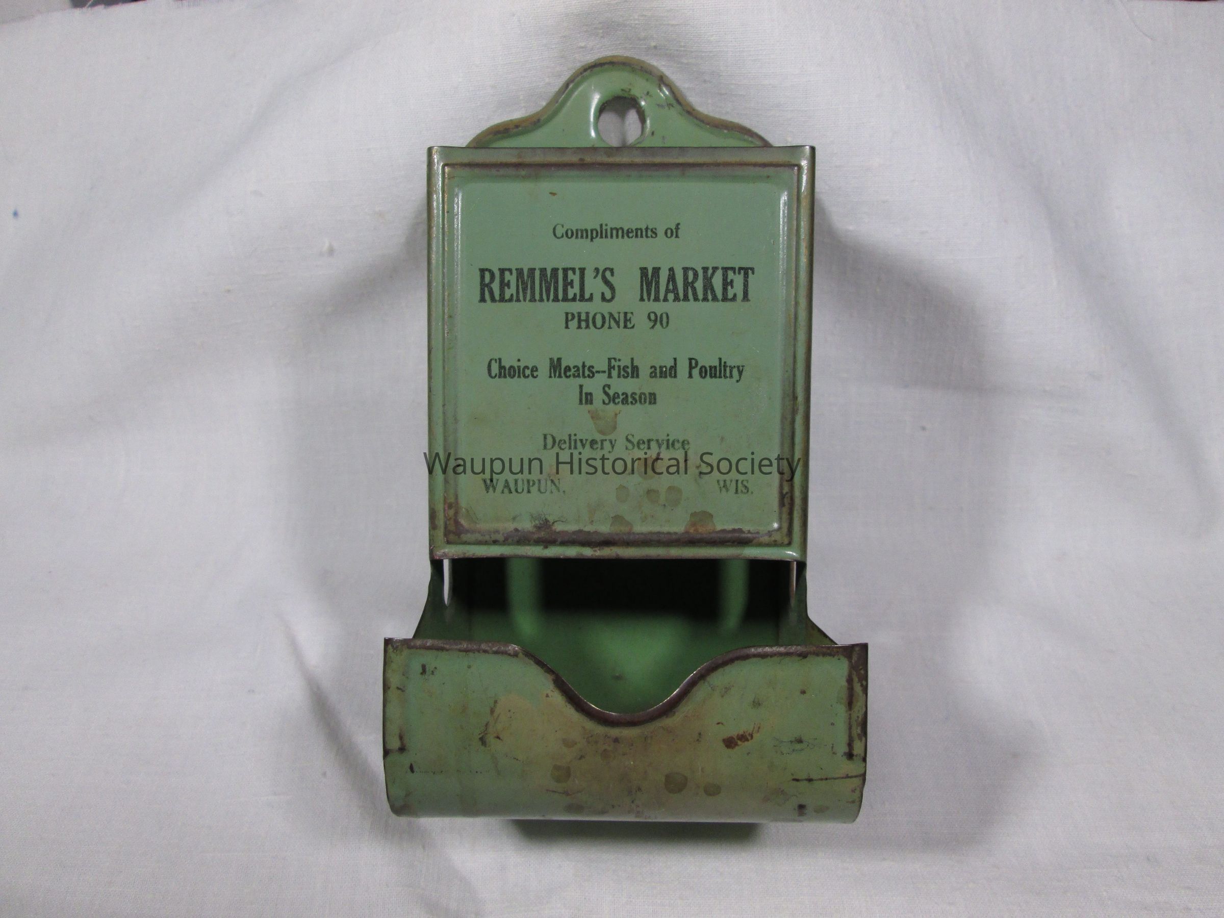 Match Box/holder from Remmel's Market, Waupun, WI. Green in color and metal.
