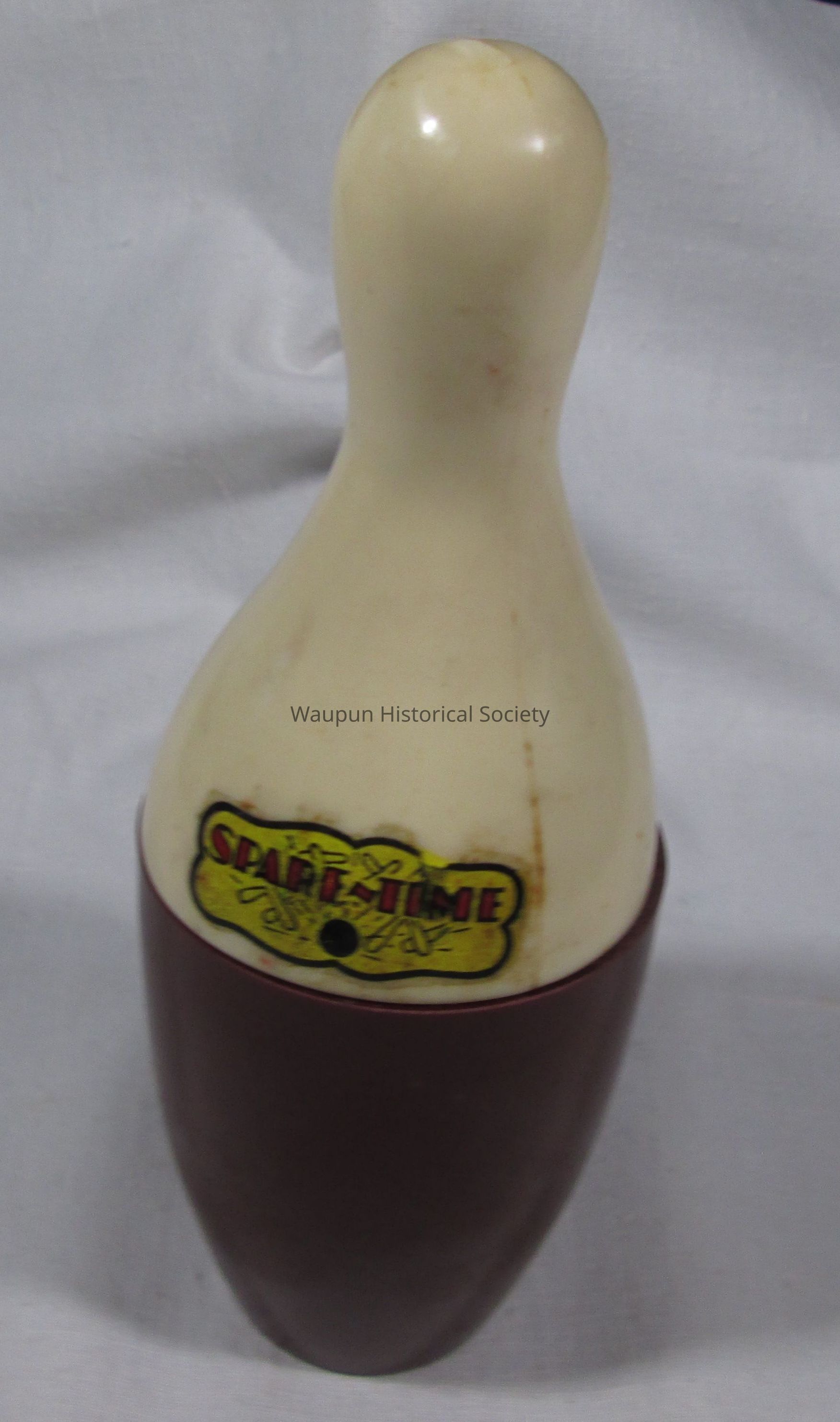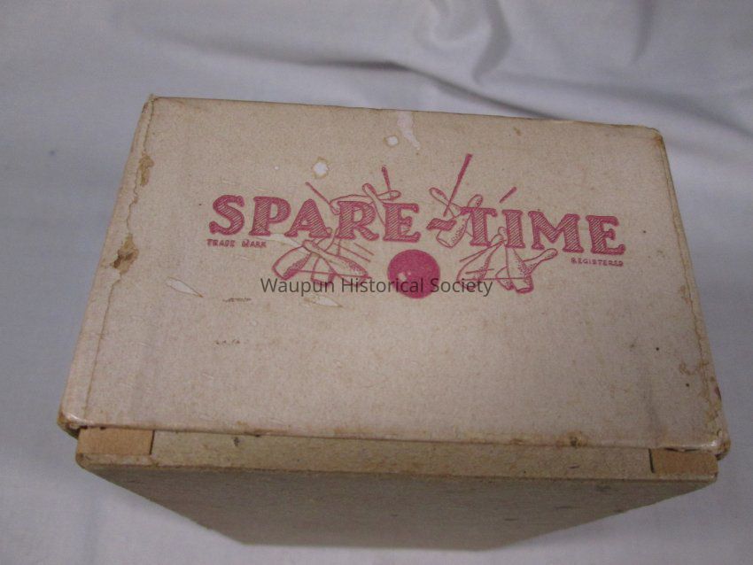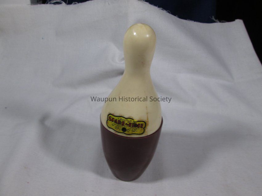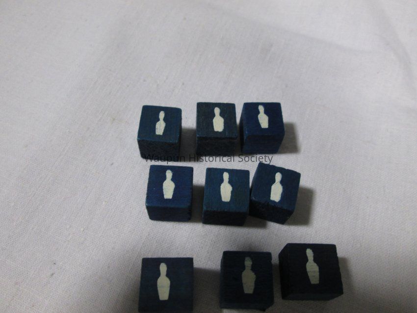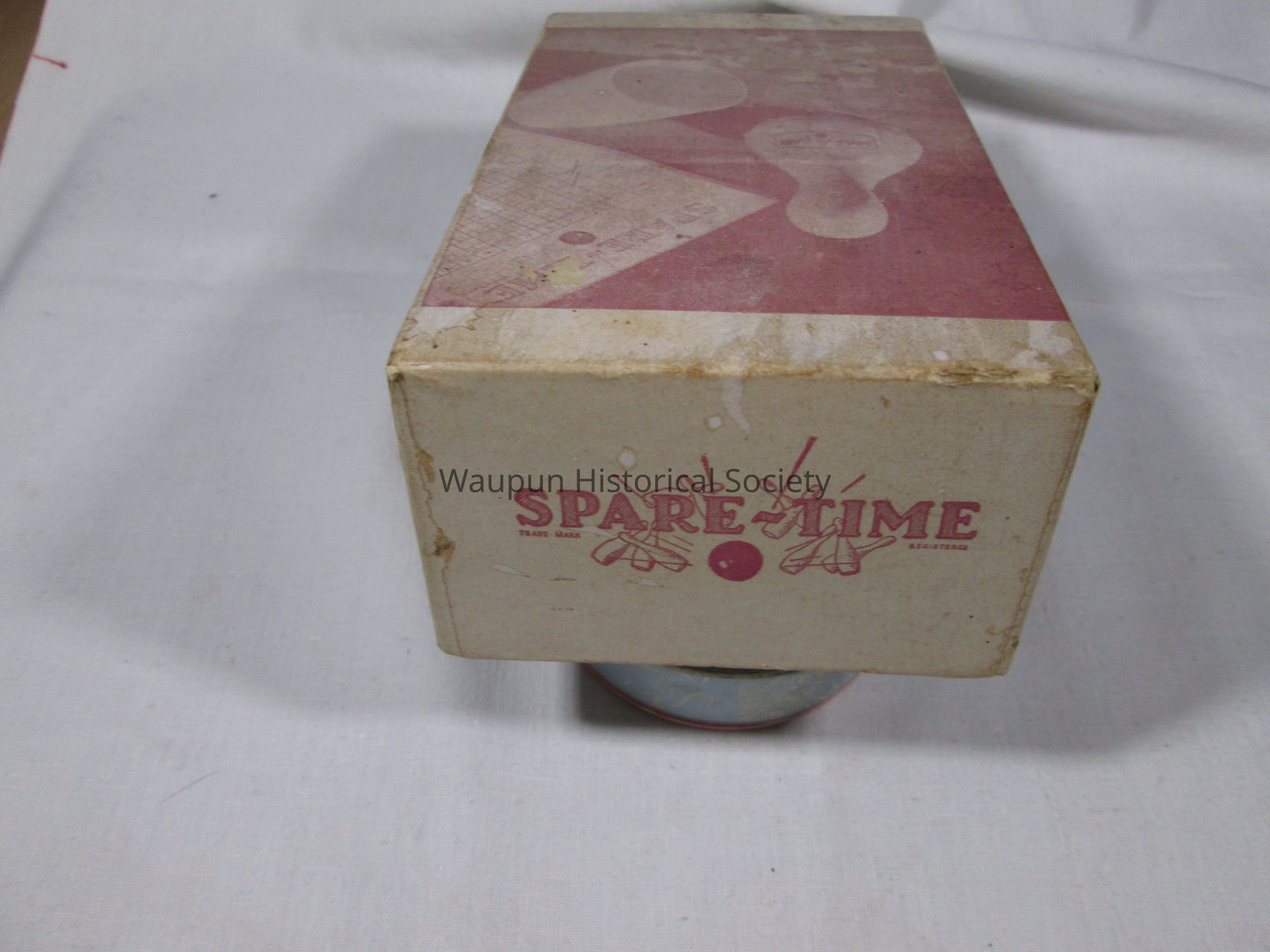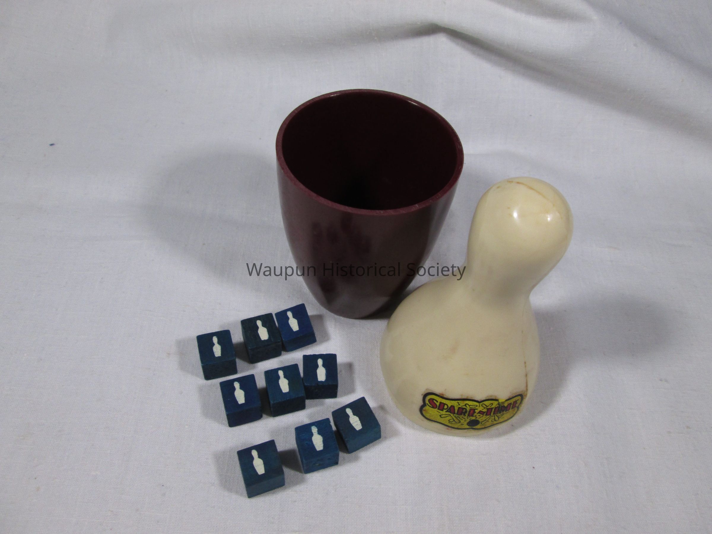 1 - child game entitled Spare time in box. It consists of a bowling pin containing 9 blue cubes with a bowling pin on one side . Also contained in the box are several score keeping sheets with directions on the back. The box has a picture of the game printed on it.Acquisition