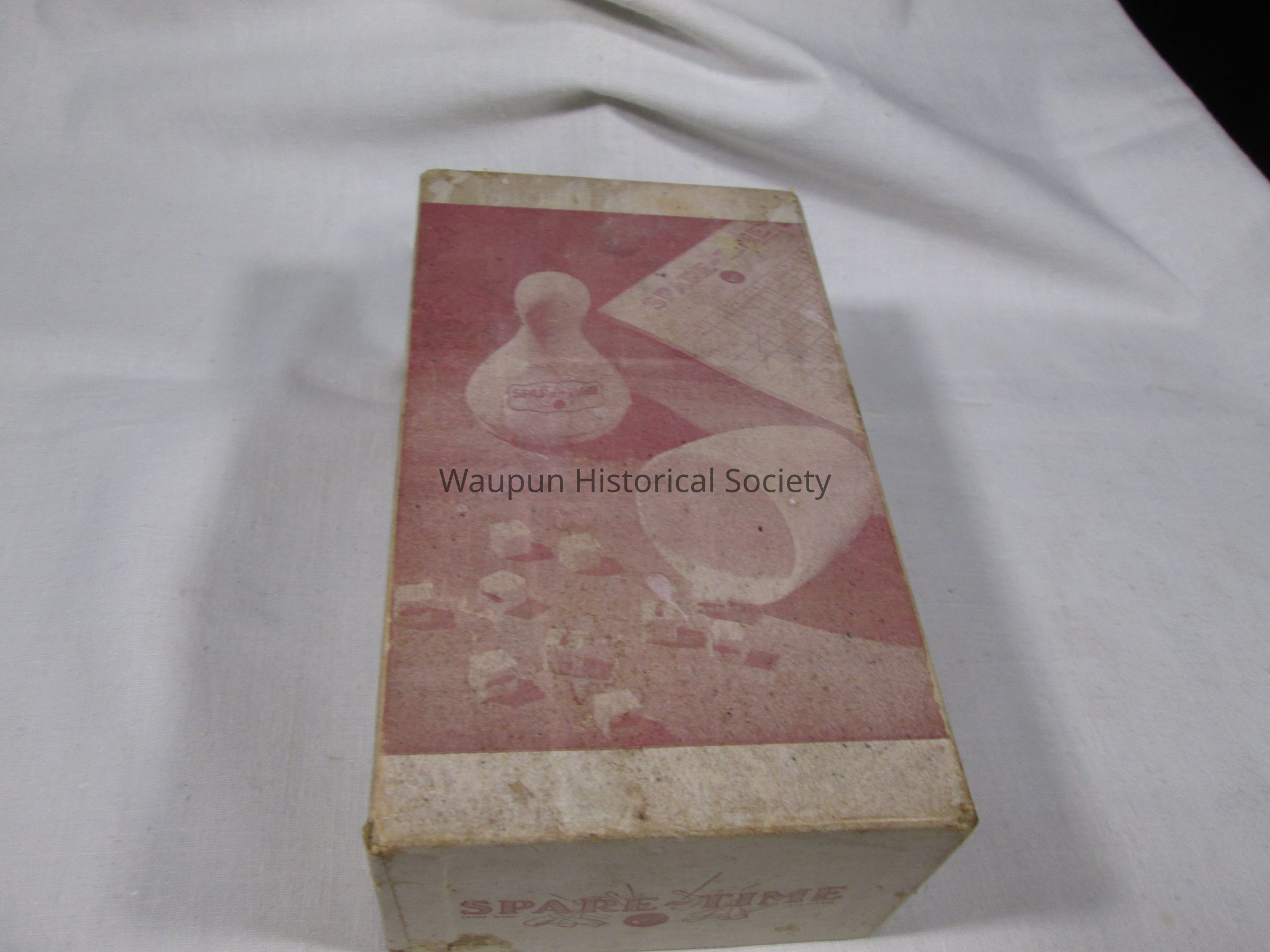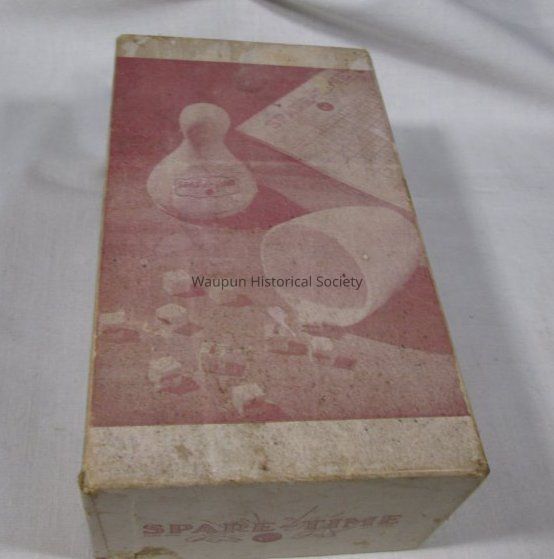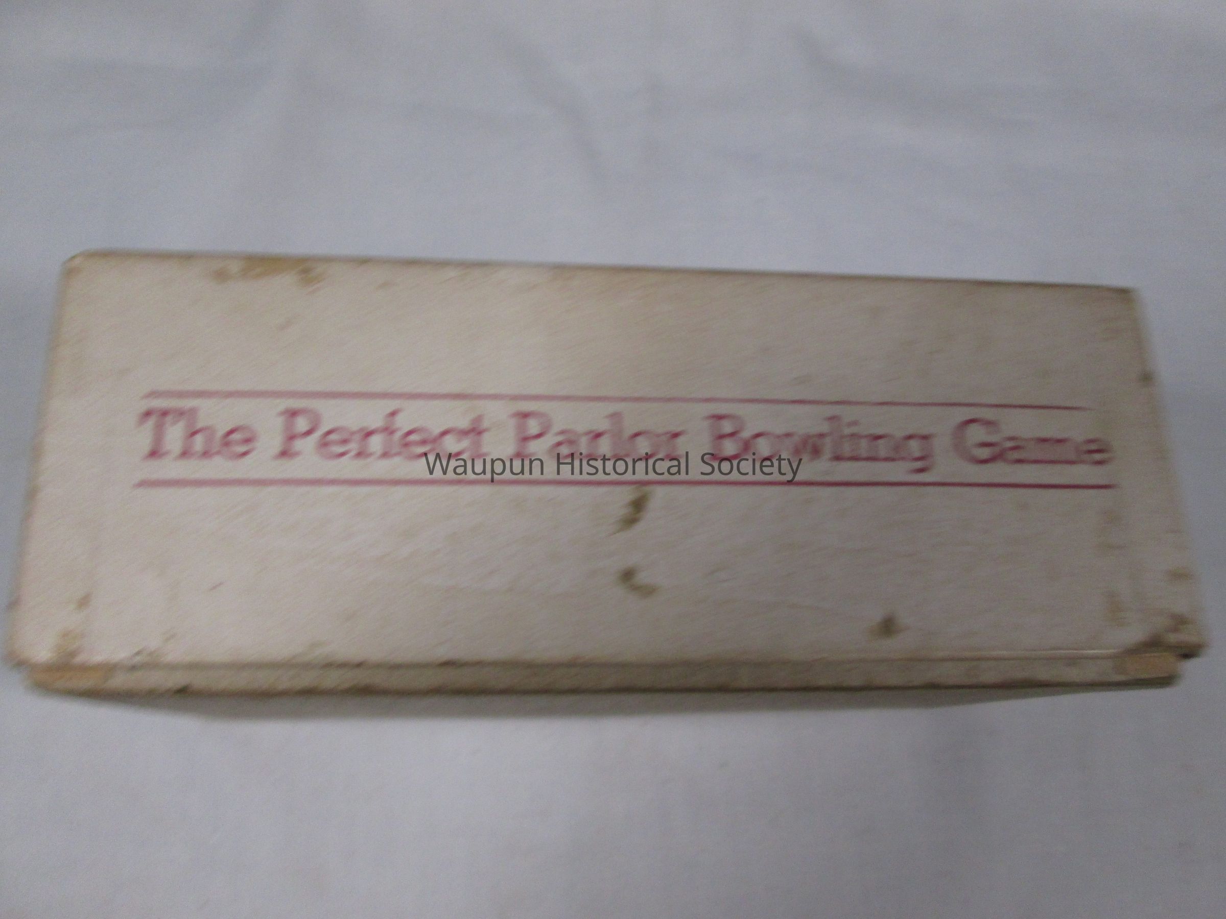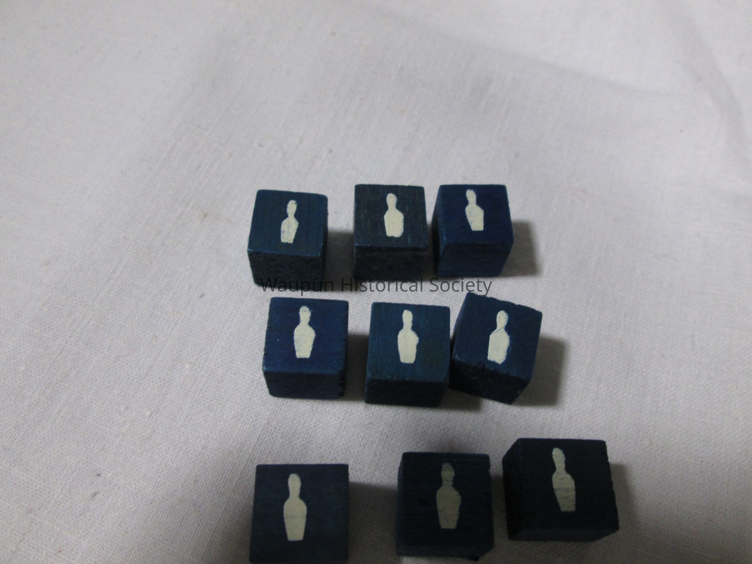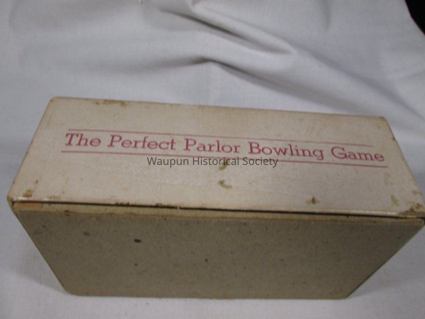 1 - child game entitled Spare time in box. It consists of a bowling pin containing 9 blue cubes with a bowling pin on one side . Also contained in the box are several score keeping sheets with directions on the back. The box has a picture of the game printed on it.Acquisition