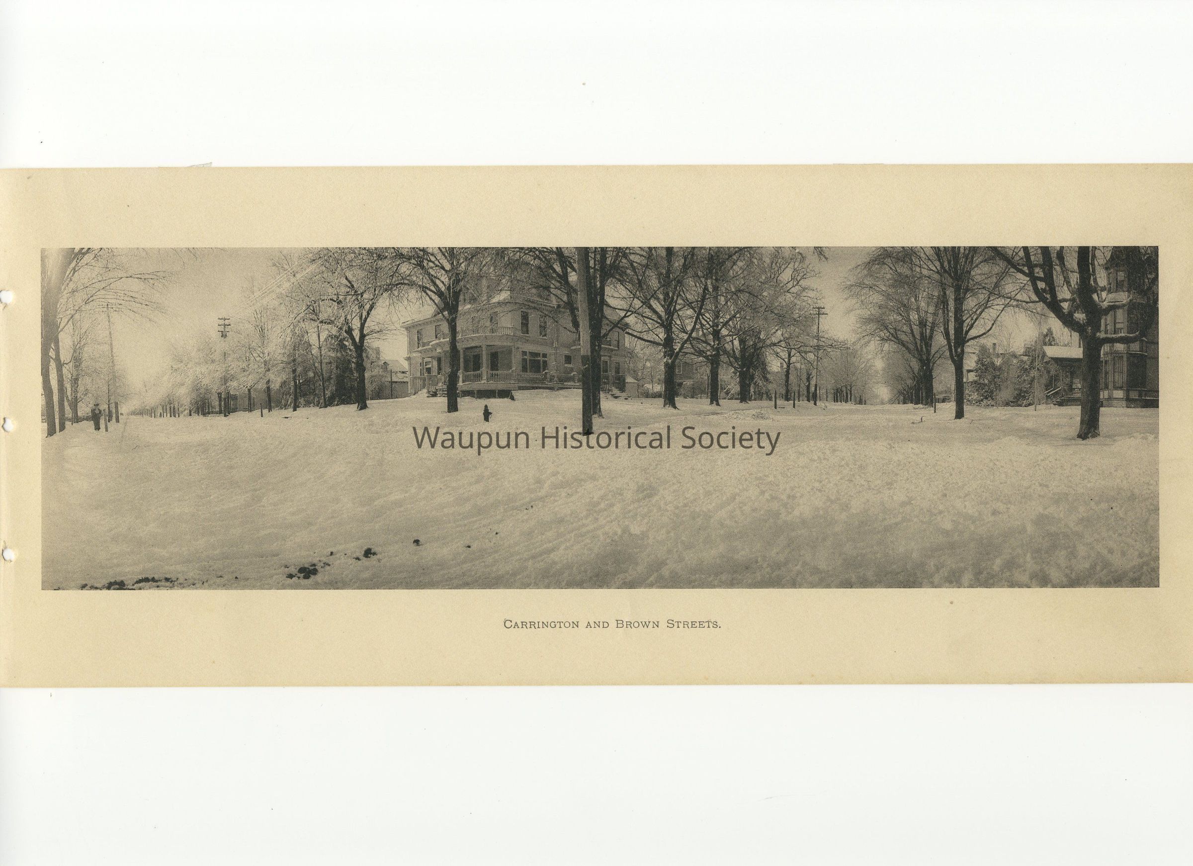 Panoram Views of Waupun. "Carrington and Brown Streets" This is a photo taken from a photo booklet with 17 panoramic photos of Waupun Wisconsin. The booklet is entitled "Panoram Views of Waupun, Wisconsin" copyright date of 1906, by J.A. Kastein, Jr. Waupun, Wisconsin, and published by "The Albertype Co., Brooklyn, N.Y.