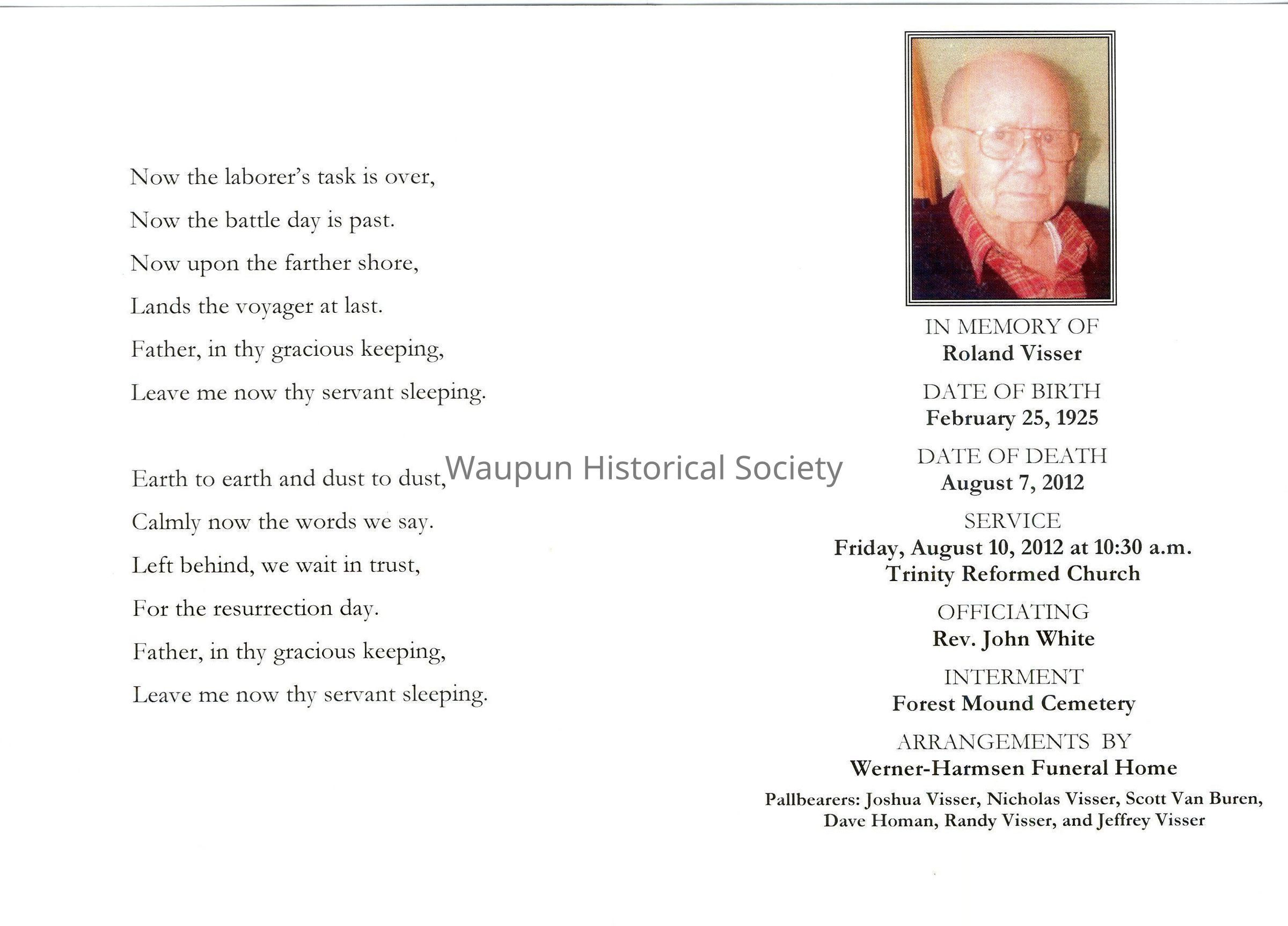 Funeral card for Roland Visser from Werner-Harmsen Funeral Home of August 10, 2012.