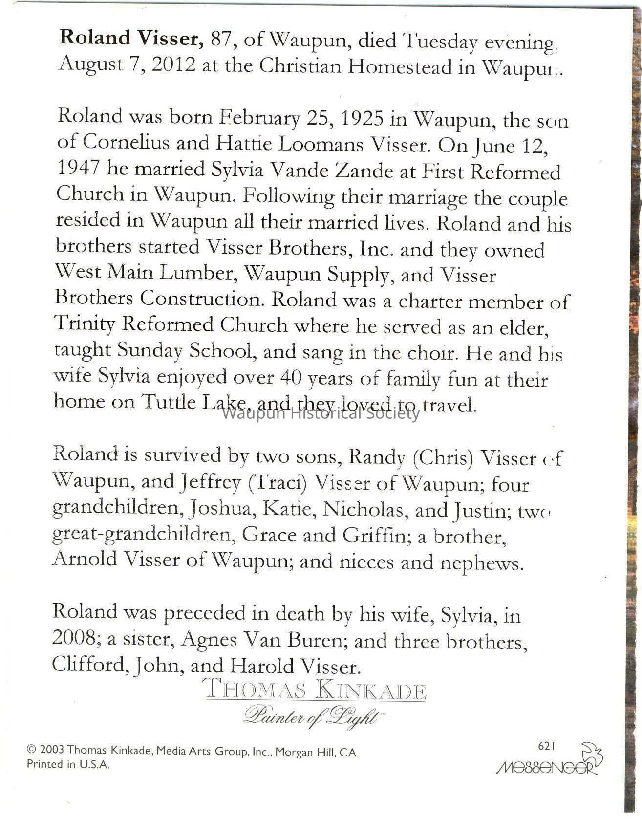 Funeral Card for Roland VisserEntry/Object ID