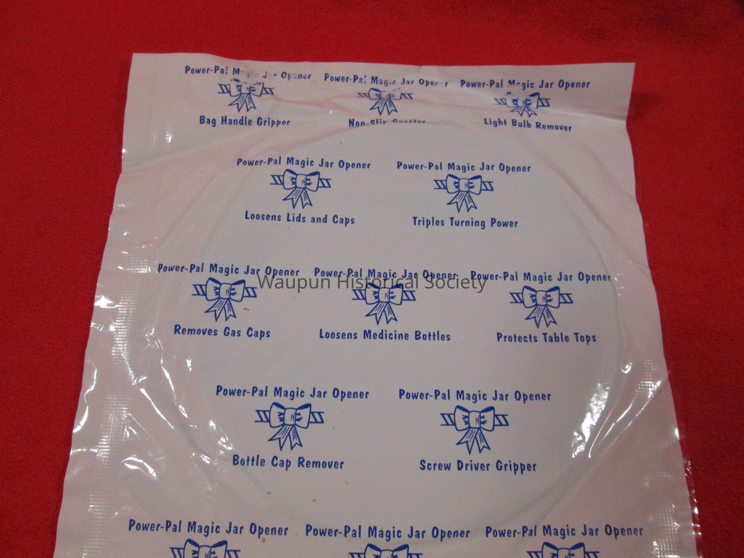 Power- Pal Magic Jar Opener with a variety of uses. From Bluemkes of Waupun, Ripon, Rosendale. "Great Brands, low prices, nice folks". Made of rubber and blue in color.