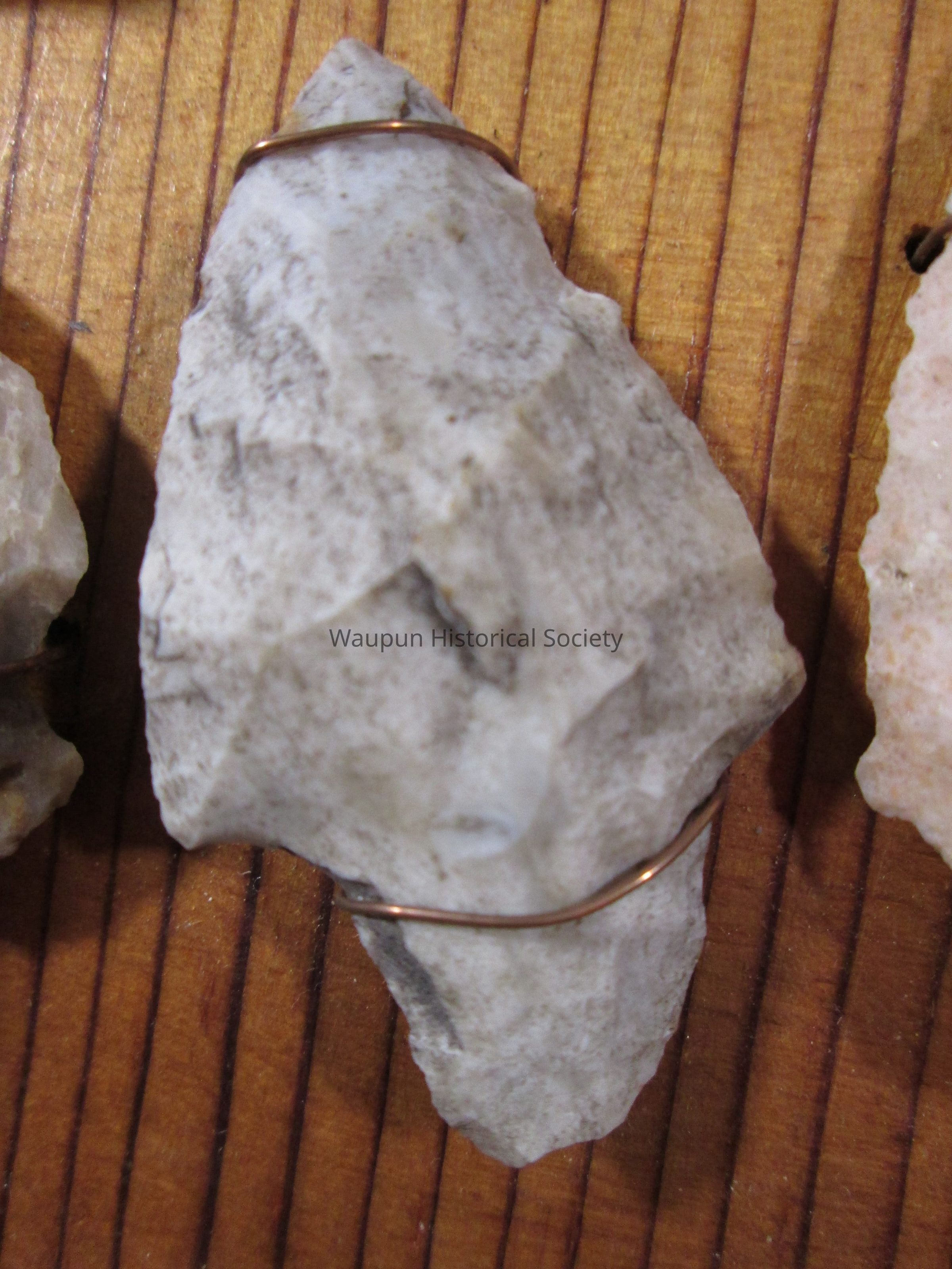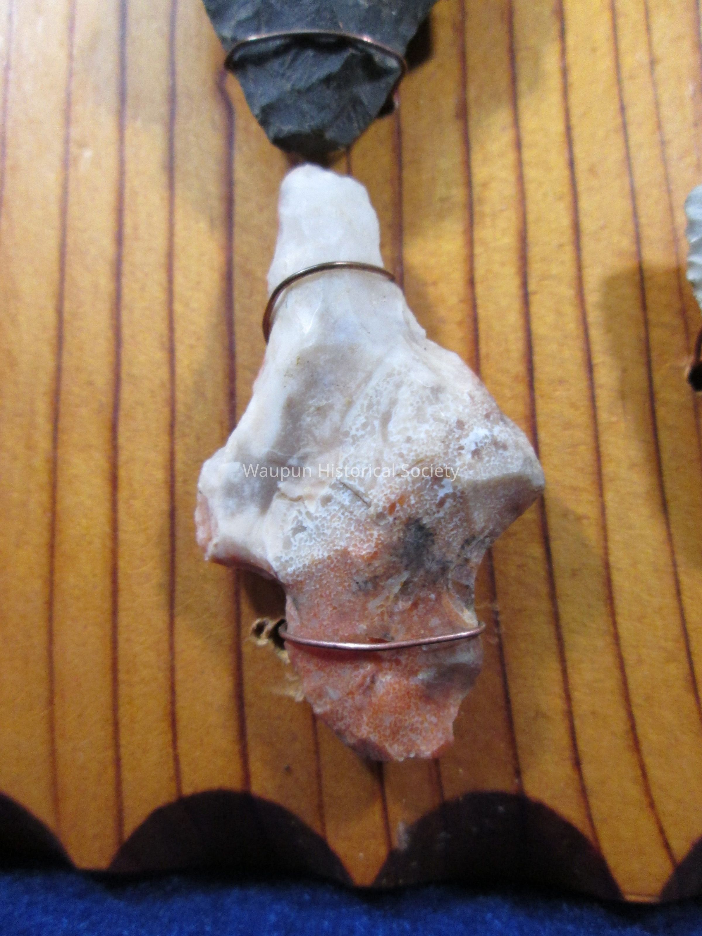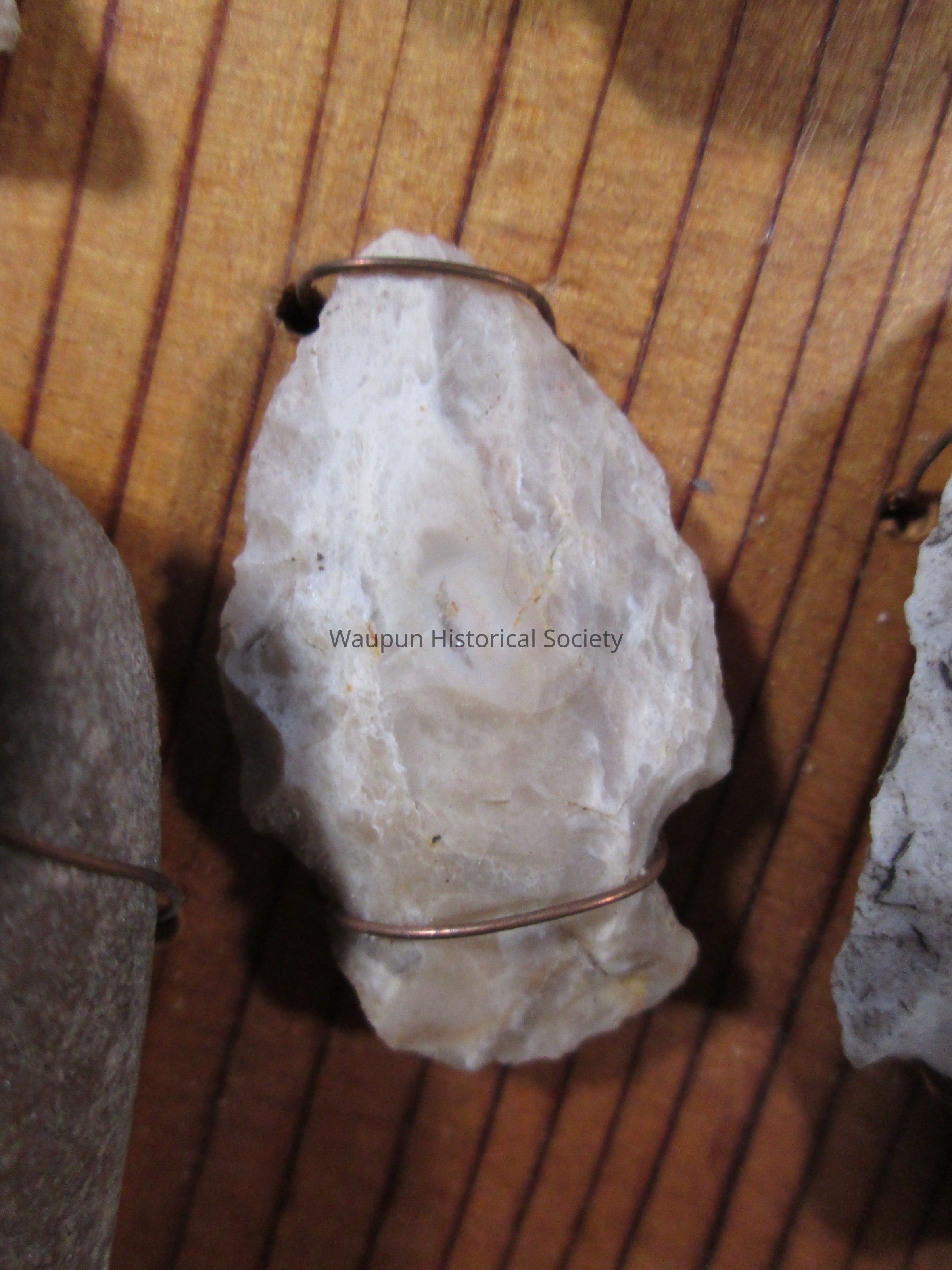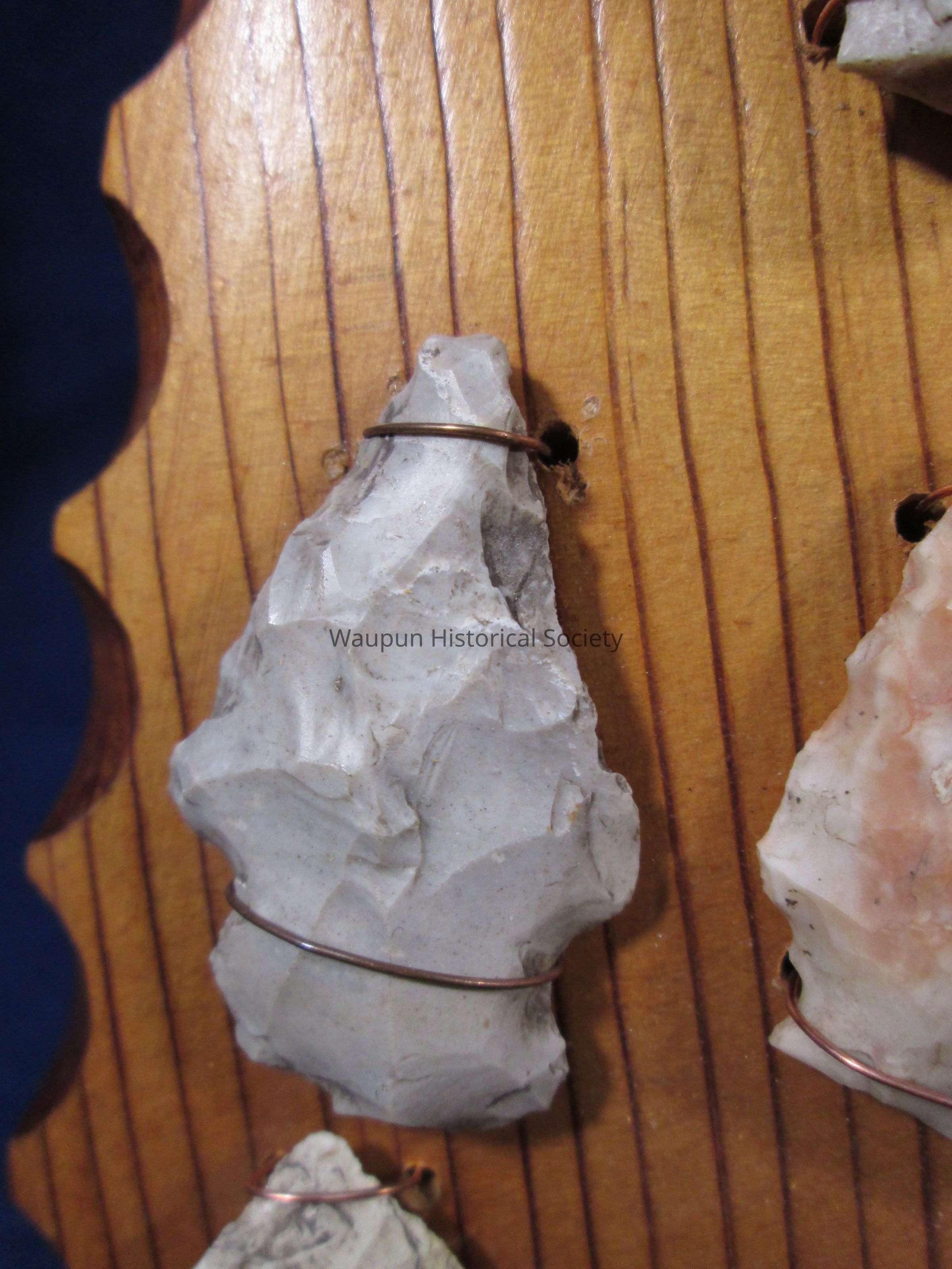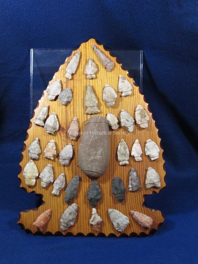 Recieved 28 groups of Native American artifacts. The artifacts are mounted on wood frames or located in a wooden box. Artifacts include axes, hammers, knives, points, arrowheads, scrappers, and drills.Acquisition