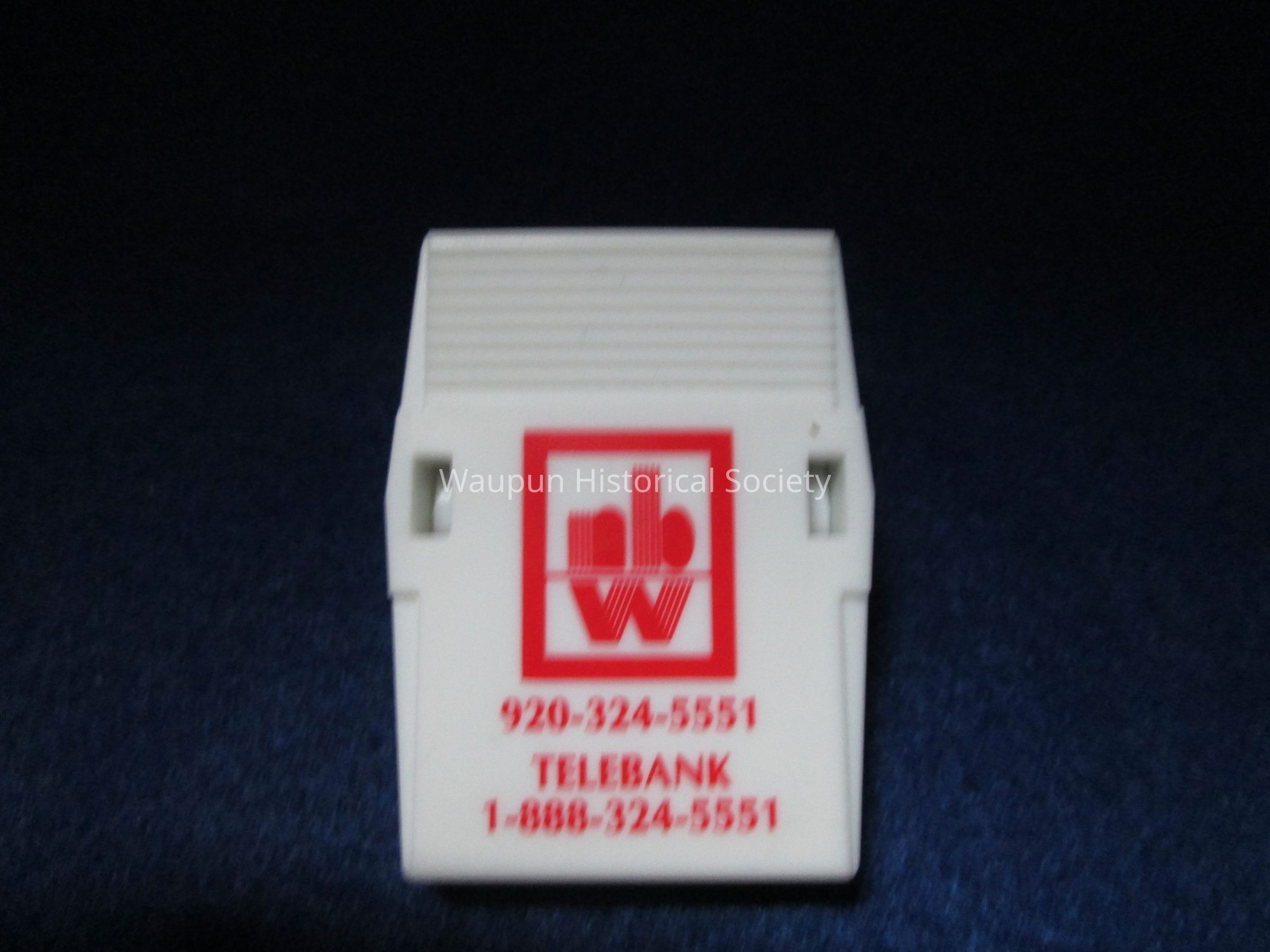 A magnet Clip White in color with Red writing on it saying TELEBANK ( 1-888-324-5551) use for Banking Paper.Acquisition
