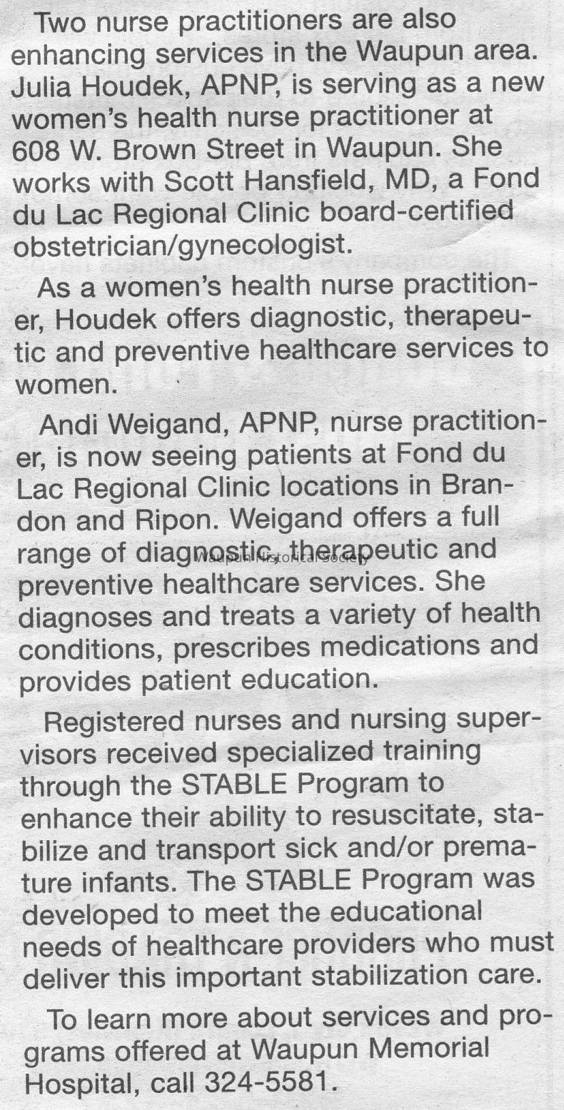 Two nurse practitioners are also enhancing services in the Waupun area. Julia Houdek, APNP, is serving as a new women's health nurse practitioner at 608 W. Brown Street in Waupun. She works with Scott Hansfield, MD, a Fond du Lac Regional Clinic board-certified obstetrician/gynecologist.