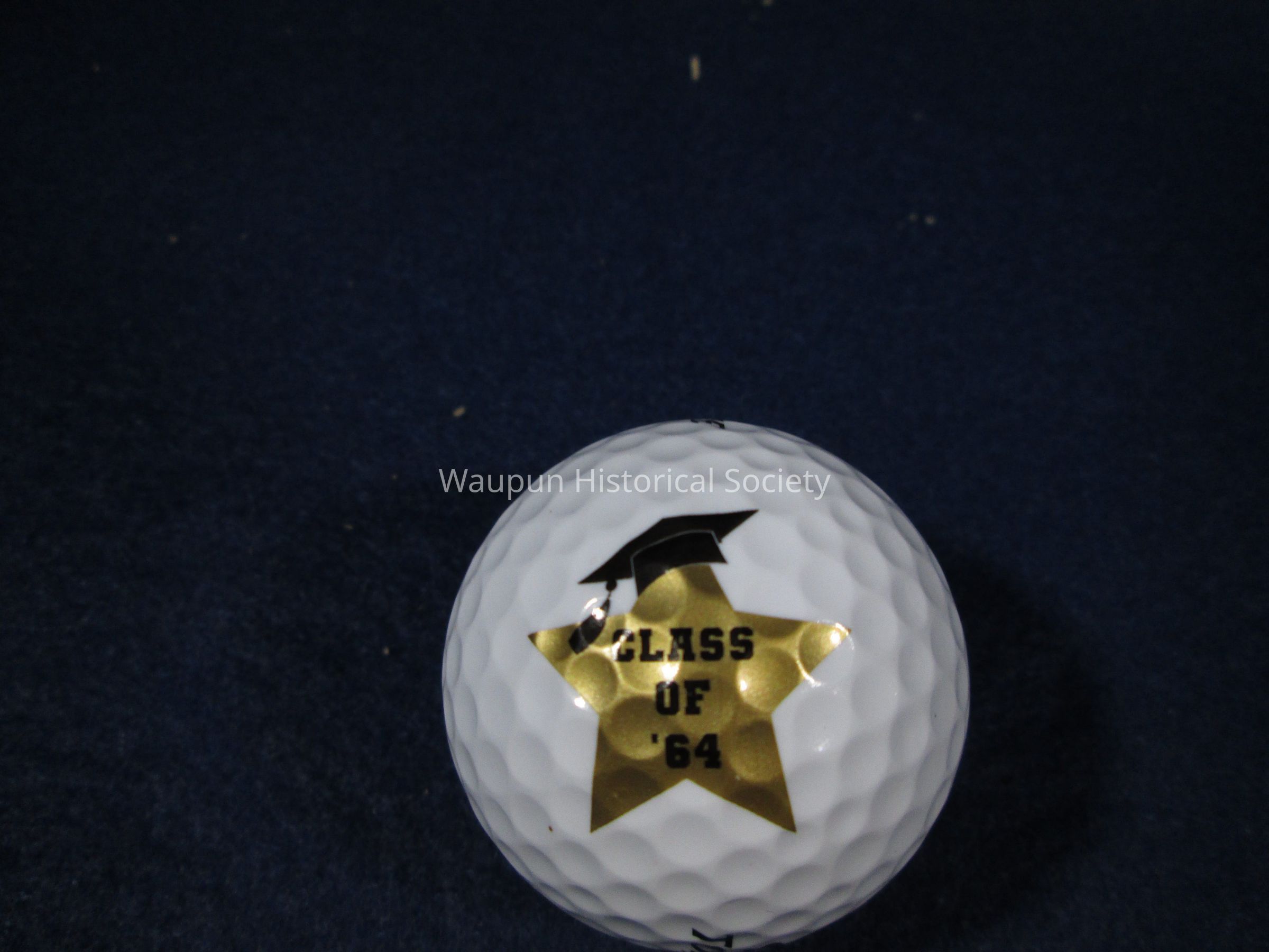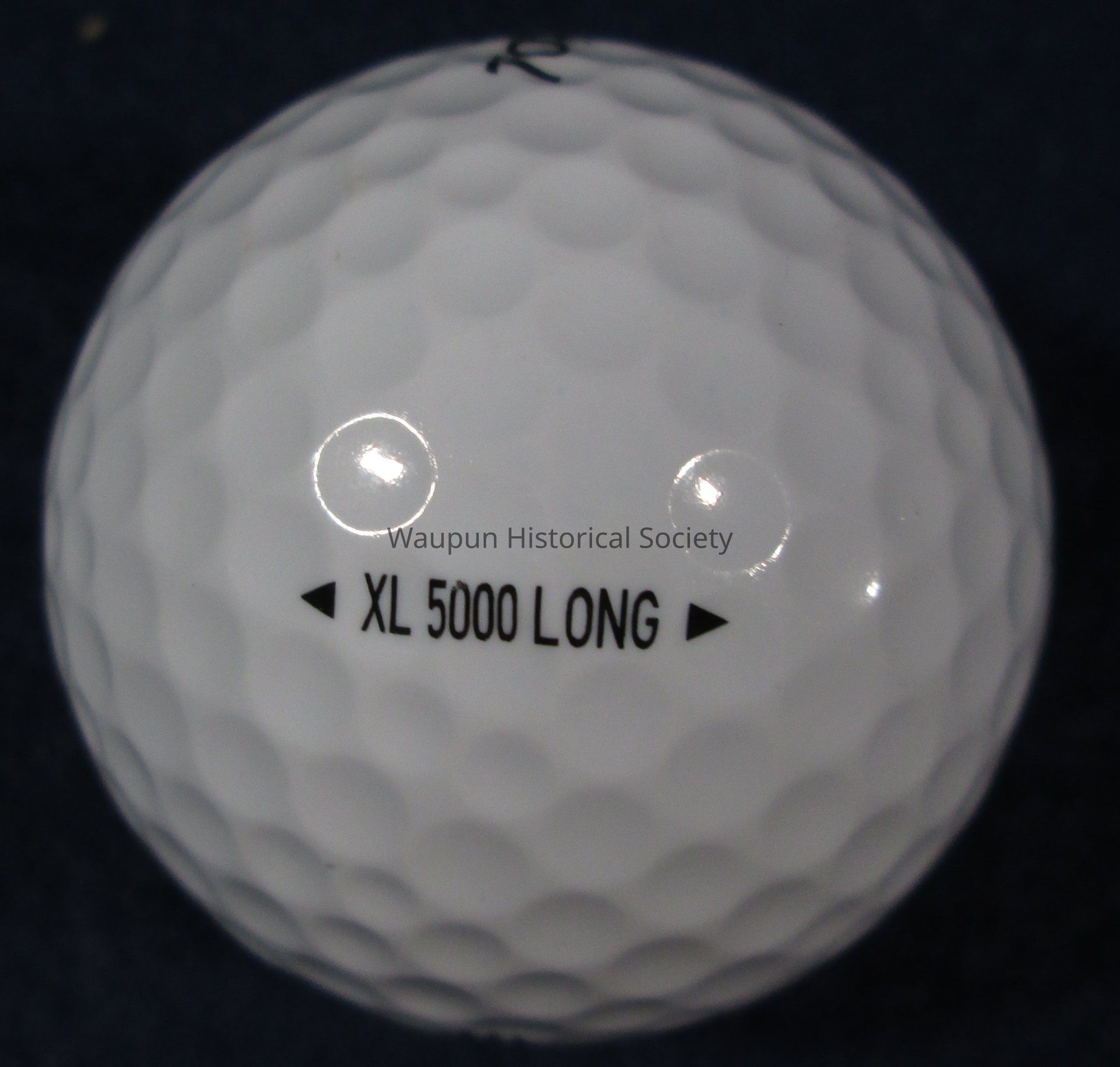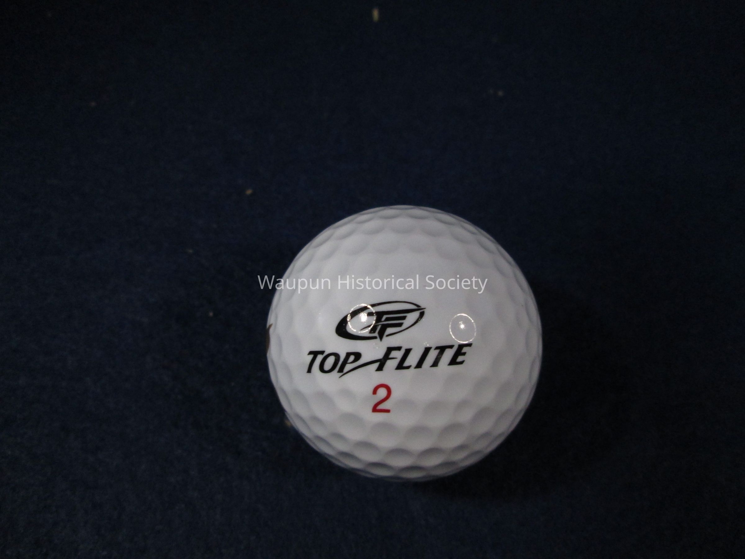 Ball, golf from Class of '64. TF Top Flite 2, < XL 5000 LONG >, stamped on golf ball. It is white with black print and the 2 is red.Acquisition