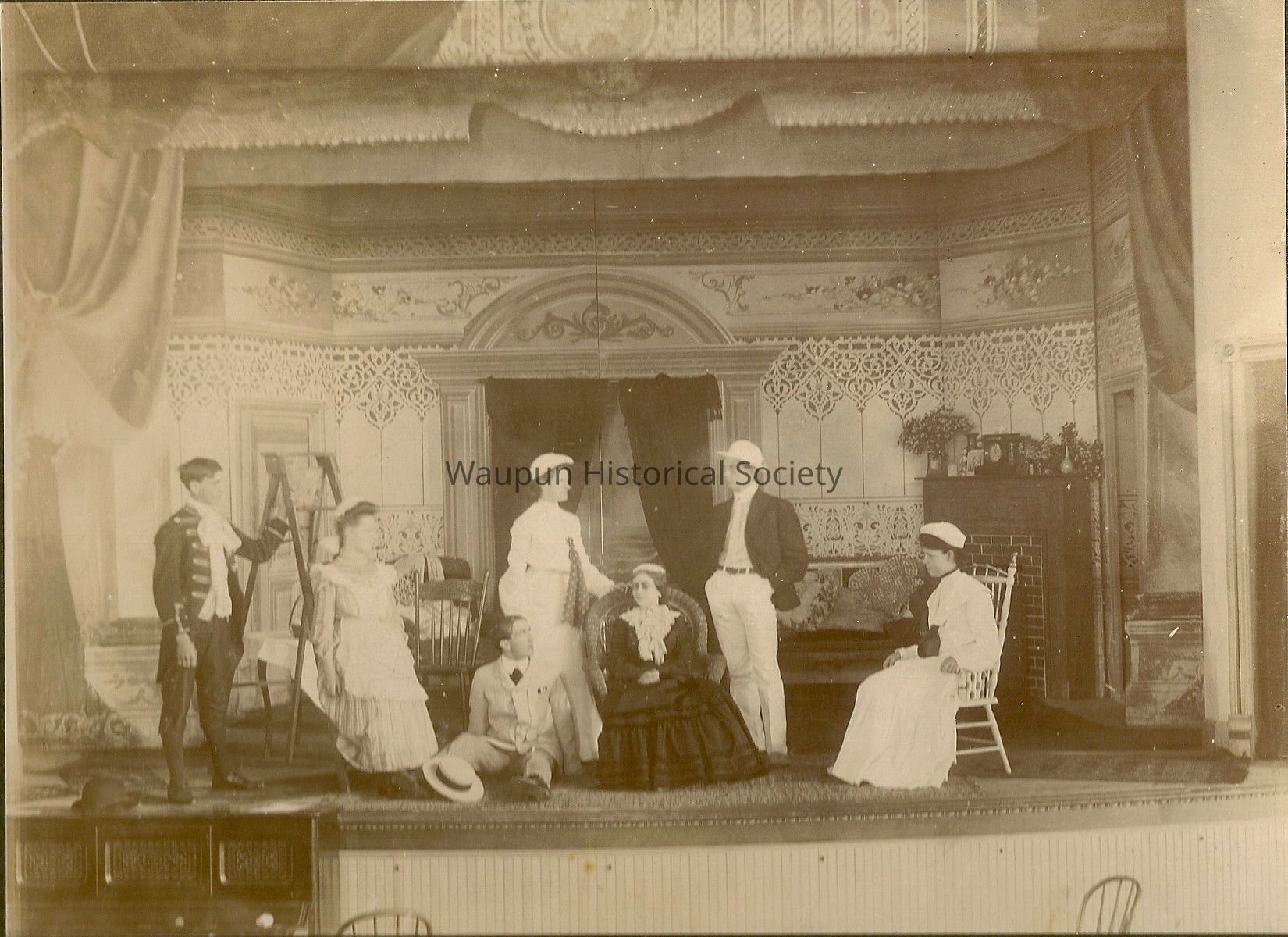 Photo of play. Unsure of the name of the play or the location. May be on the stage in the Fond du Lac Street school. Appears to the be the same play as in 2011.0005.0003. Both plays have the same furniture, fireplace and set.Acquisition