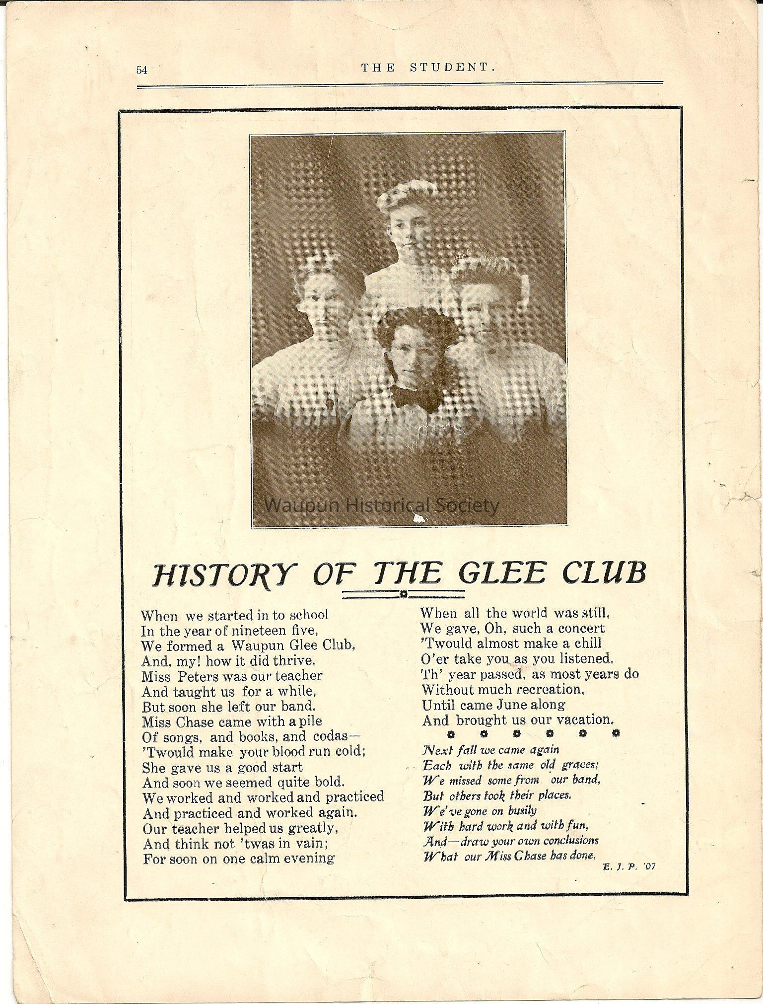 Page 54 is entititled "History Of The Glee Club." It has the picture of four young women. The history indicates 1905 and was printed in 1907.
