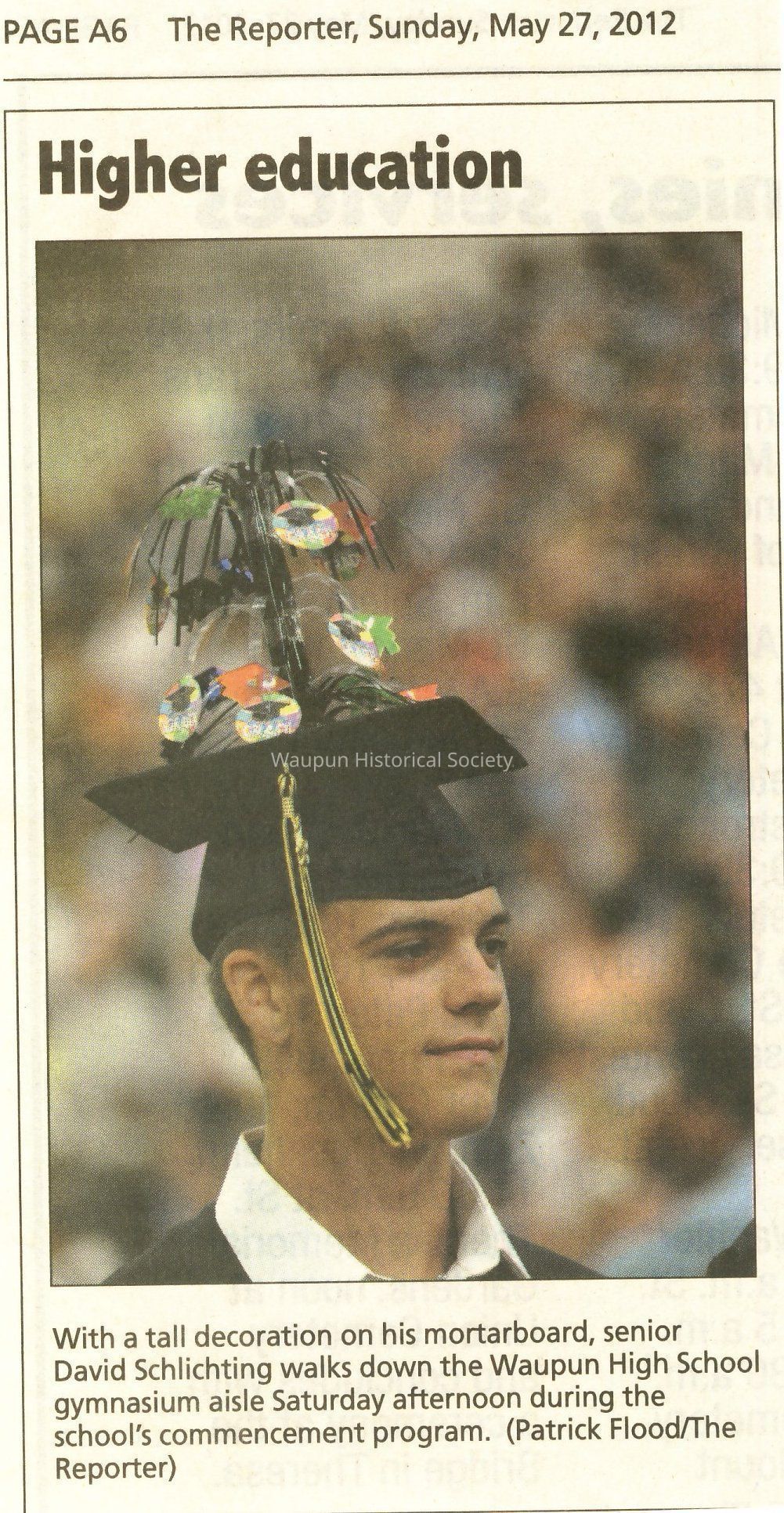 With a tall decoration on his mortarboard, senior David Schlichting walks down the Waupun High School gymnasium aisle Saturday afternoon during the school's commencement program. (Patrick Flood/The Reporter)Acquisition