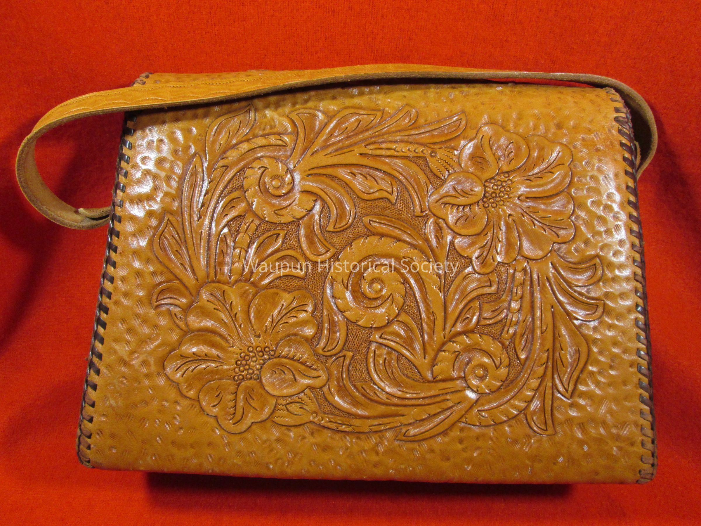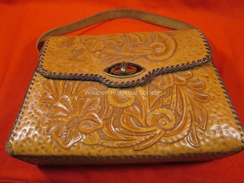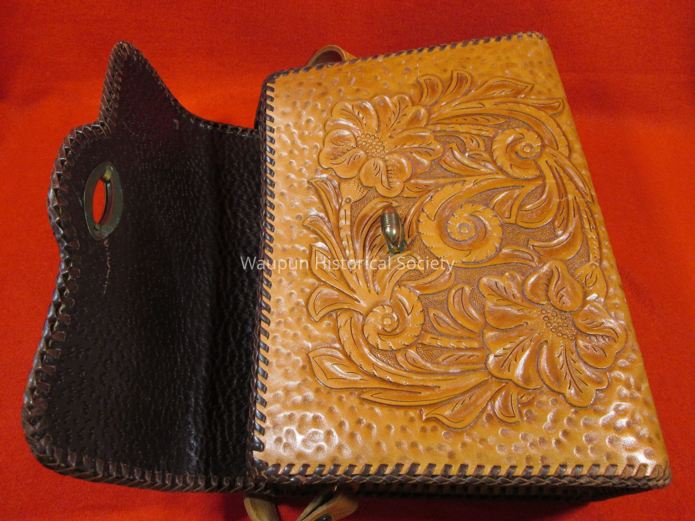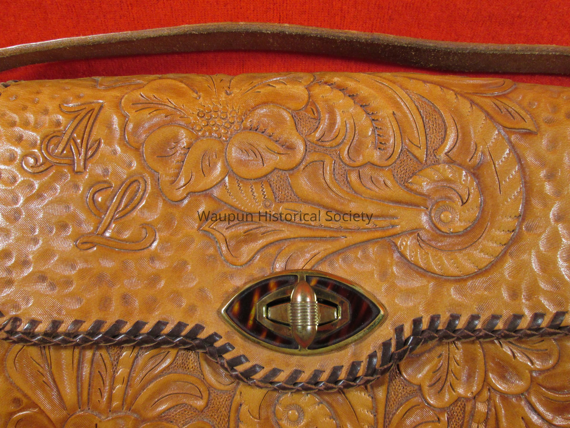 Tan leather purse, with hand strap, made by inmates at the Waupun Prison. The initials A L are carved on the front (which could have been an inmate). There is a floral design carved on front and back. The inside of the purse is a dark brown leather. The clasp, to open and close, is oval and gold with a brown swirl inlay.Acquisition