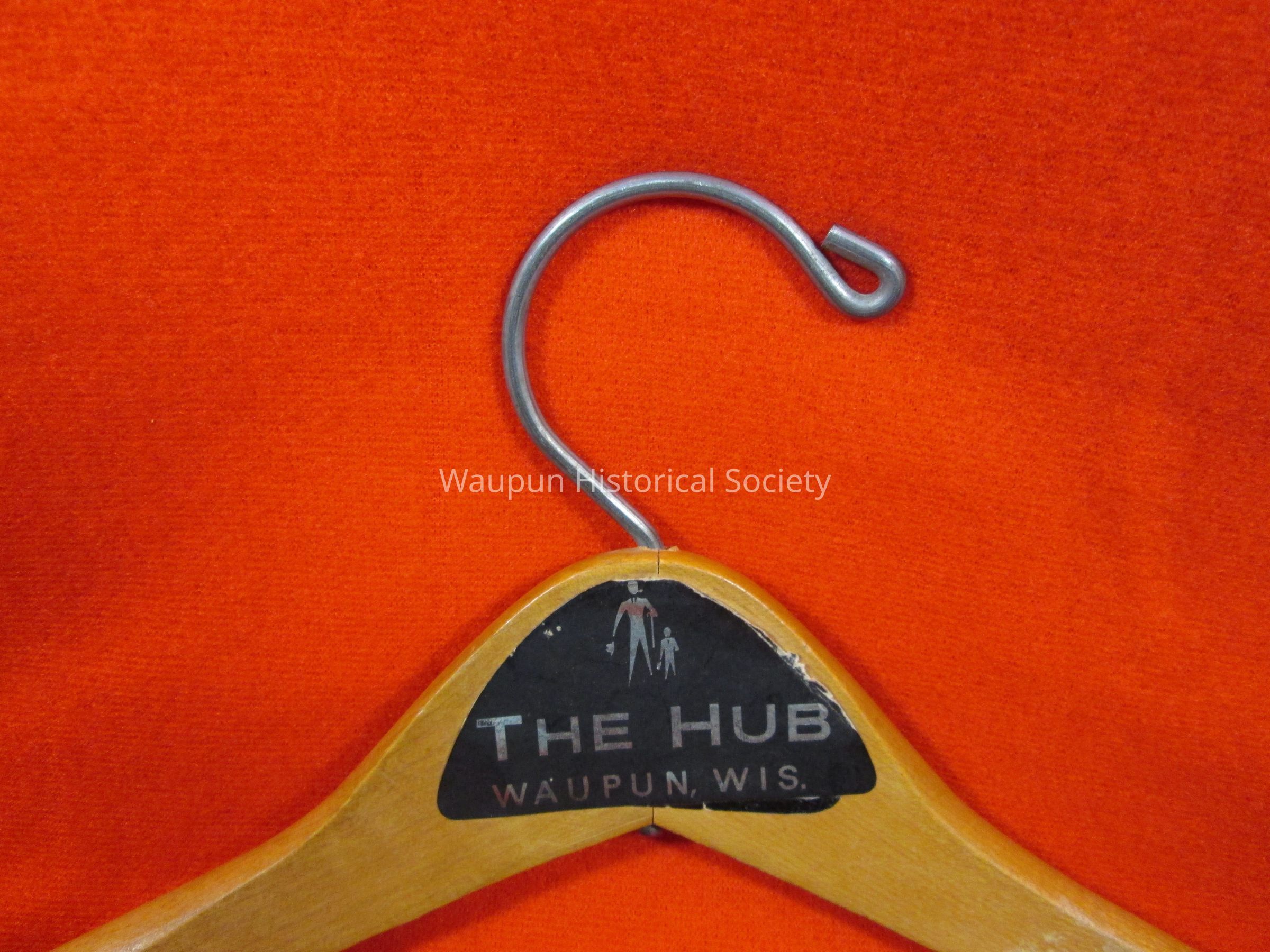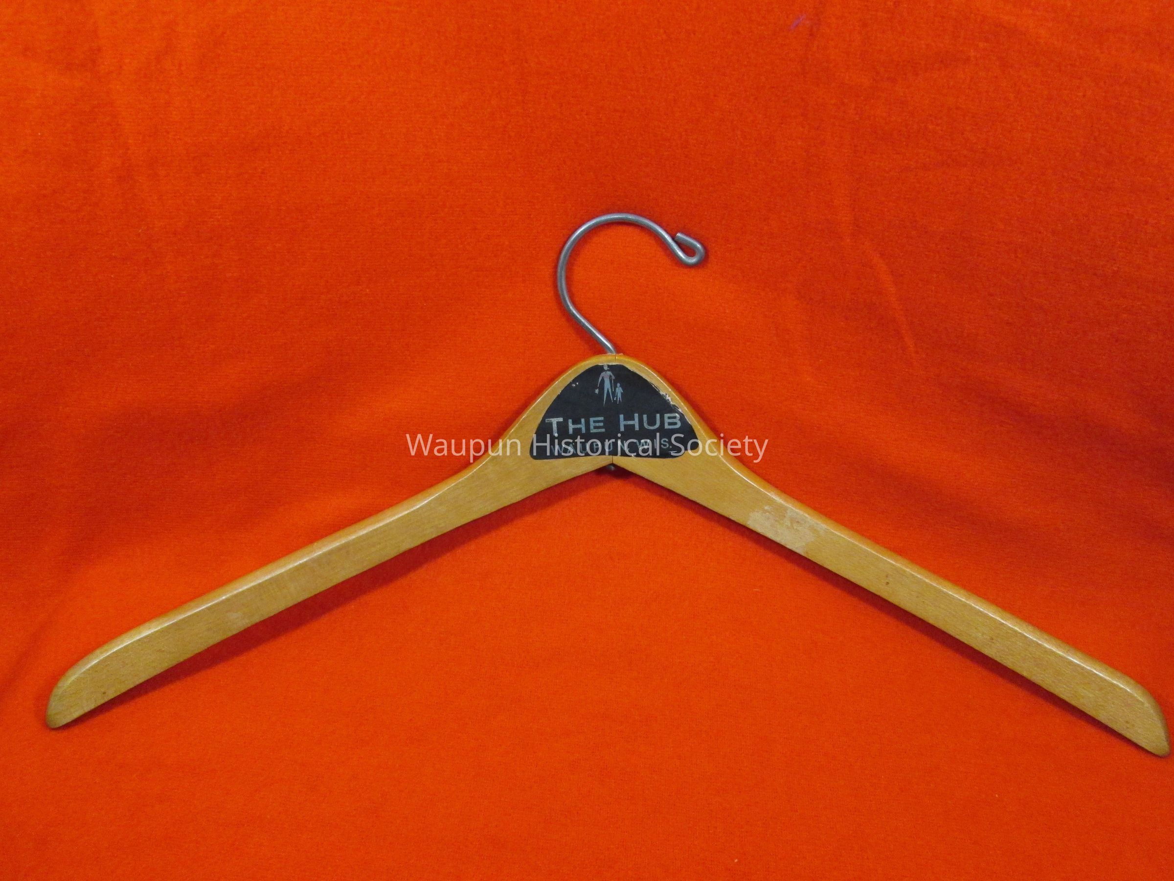 Wooden clothes hanger from THE HUB, Waupun, Wis. The label is black with gold print and a figure of a man with cane and top hat in hand and a pipe- (1 small and 1 large)Acquisition