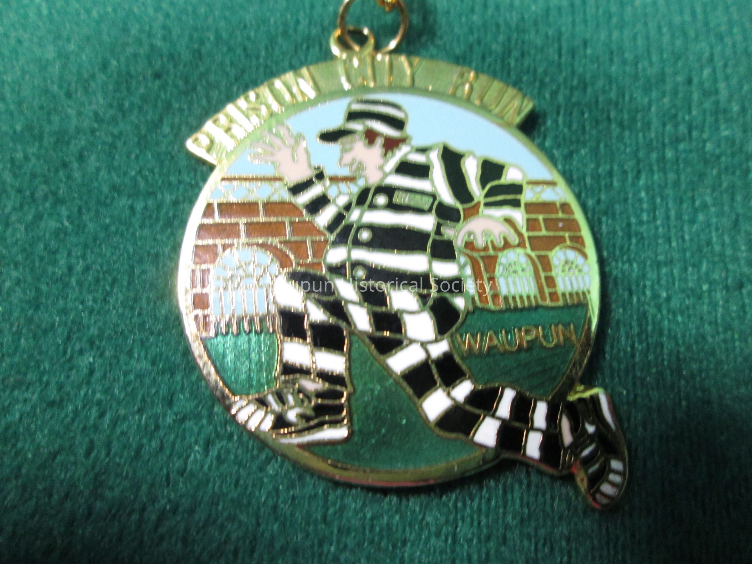 Charm(necklace) a round charm of prison city run with a picture of a prisoner running in Black& white Stripe and prison picture in the charm with a gold chain.Acquisition