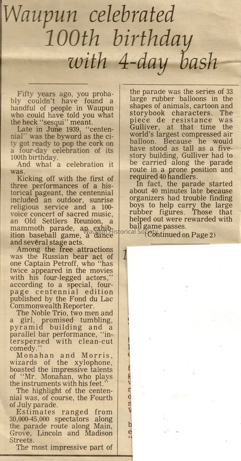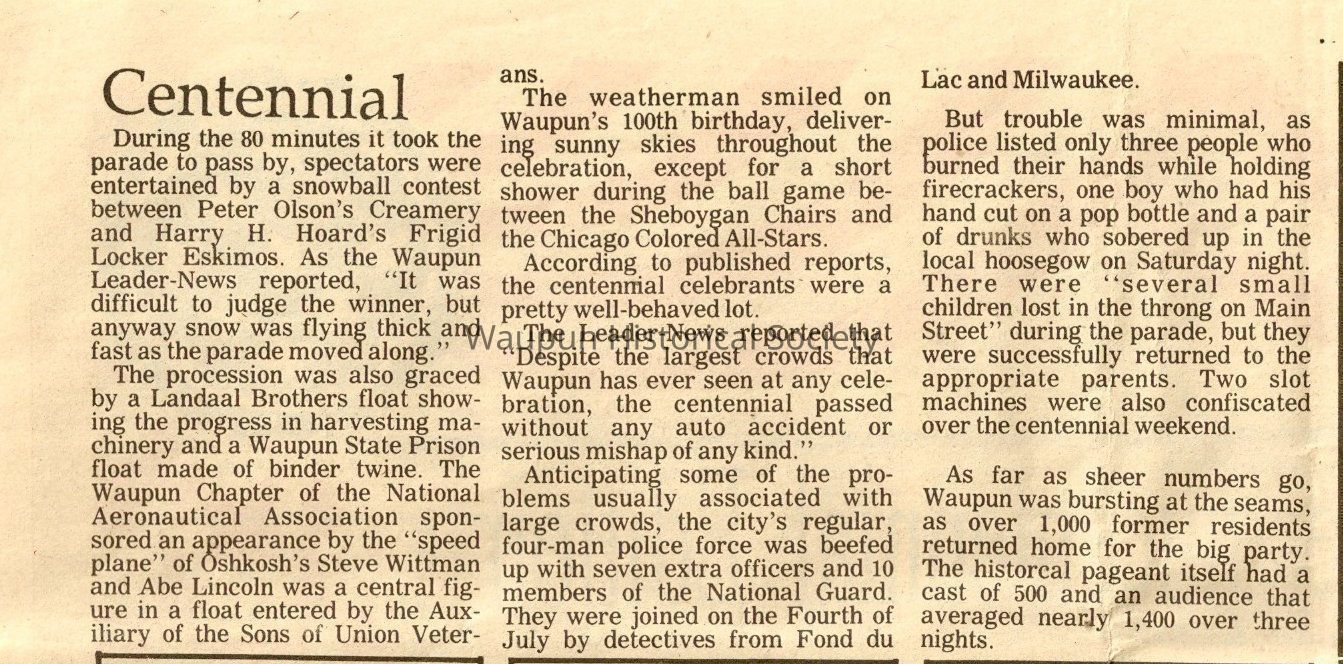 The Leader-News reported that "Despite the largest crowds that Waupun has ever seen at any celebration, the centennial passed without any auto accident or serious mishap of any kind."