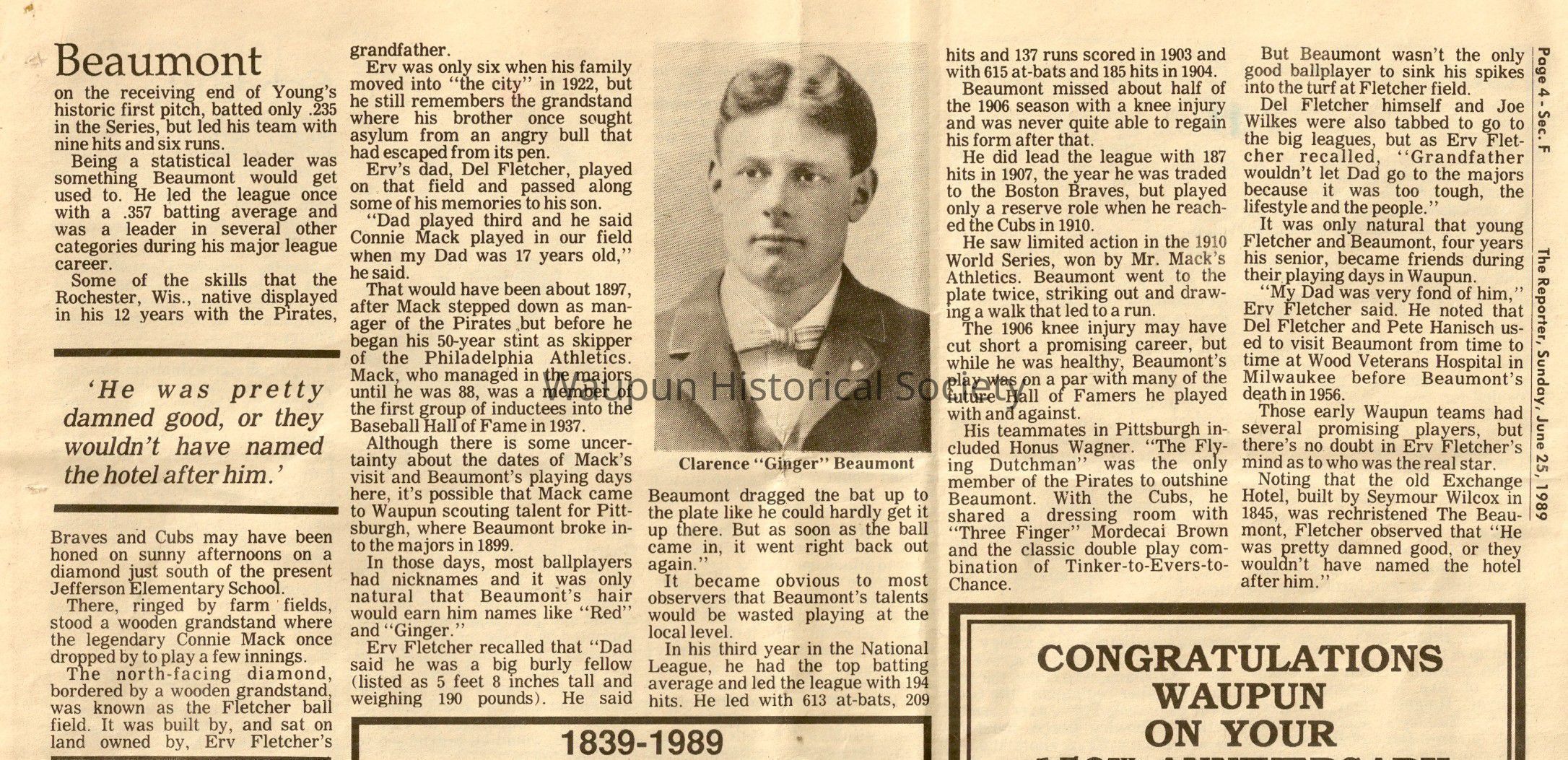 Although there is some uncertainty about the dates of Mack's visit and Beaumont's playing days here, it's possible that Mack came to Waupun scouting talent for Pittsburgh, where Beaumont broke into the majors in 1899.