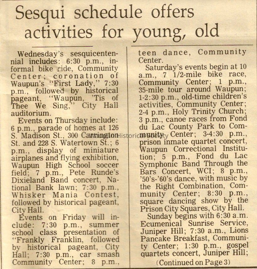 Wednesday's sesquicentennial includes: 6:30 p.m., informal bike ride, Community Center; coronation of Waupun's "First Lady," 7:30 p.m., followed by historical pageant, "Waupun, 'Tis of Thee We Sing," City Hall auditorium.