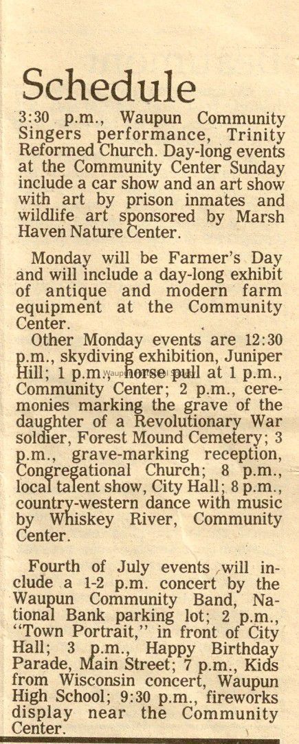 Fourth of July events will include a 1-2 p.m. concert by the Waupun Community Band, National Bank parking lot; 2 p.m., "Town Portrait," in front of City Hall; 3 p.m., Happy Birthday Parade, Main Street; 7 p.m., Kids from Wisconsin concert, Waupun High School; 9:30 p.m., fireworks display near the Community Center.