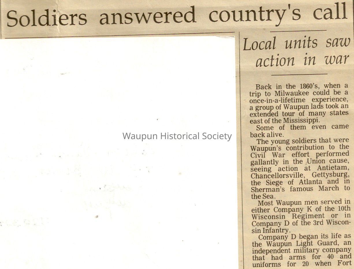 Most Waupun men served in either Company K of the 10th Wisconsin Regiment or in Company D of the 3rd Wisconsin Infantry.