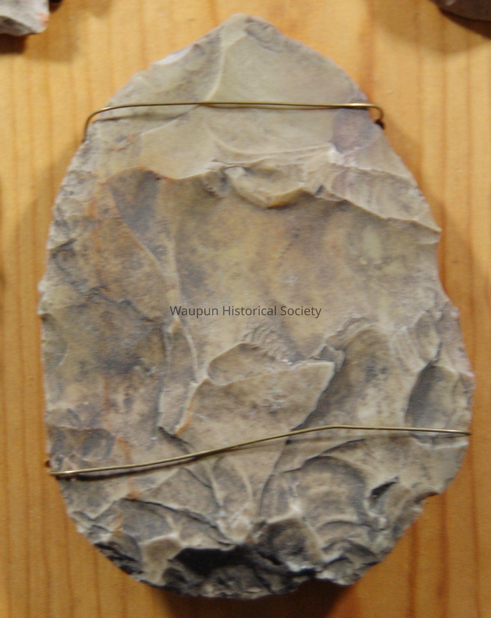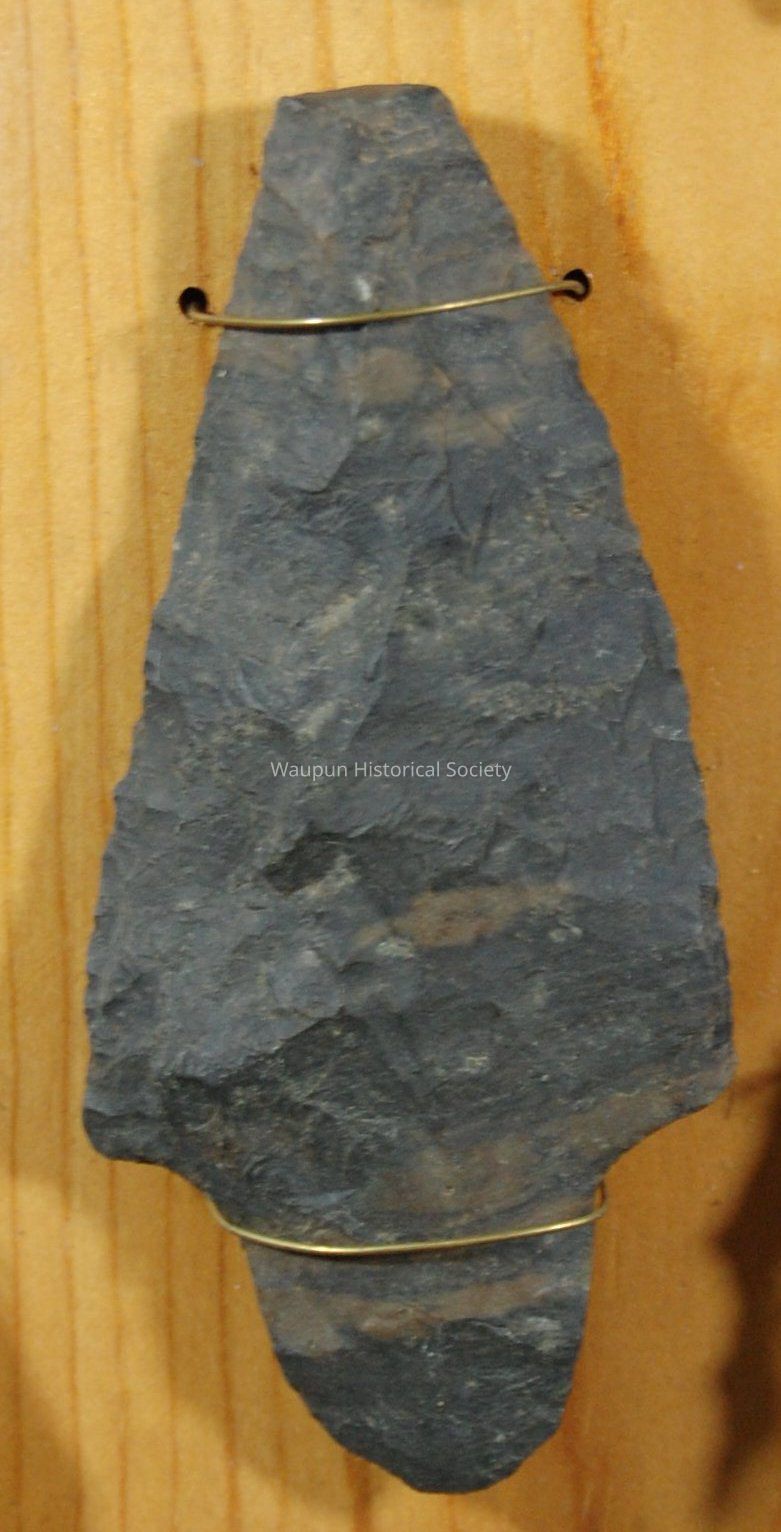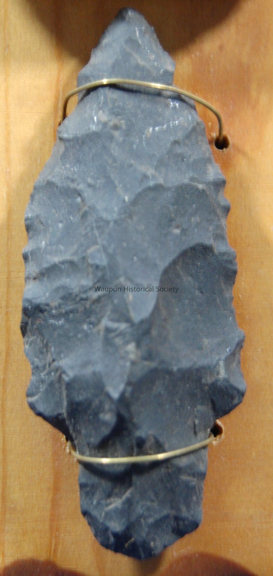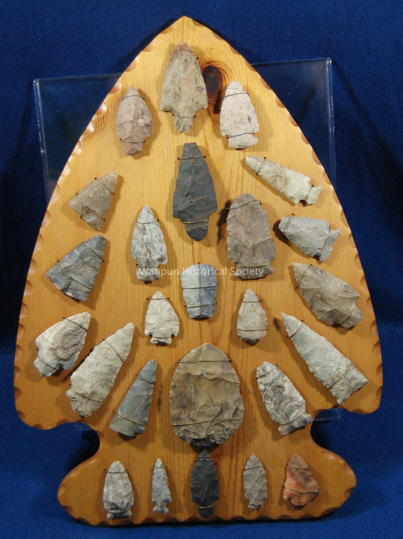 Recieved 28 groups of Native American artifacts. The artifacts are mounted on wood frames or located in a wooden box. Artifacts include axes, hammers, knives, points, arrowheads, scrappers, and drills.Acquisition