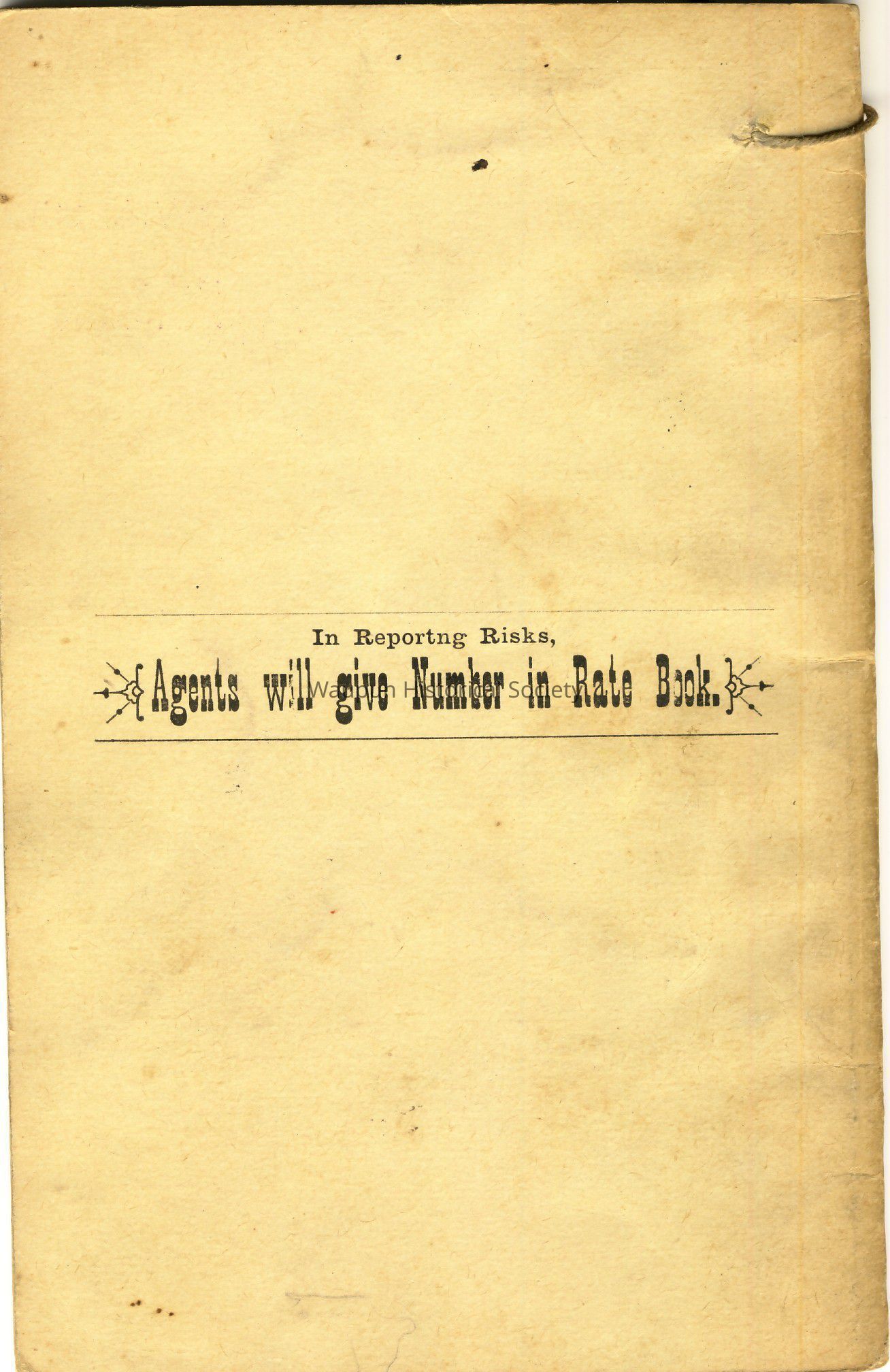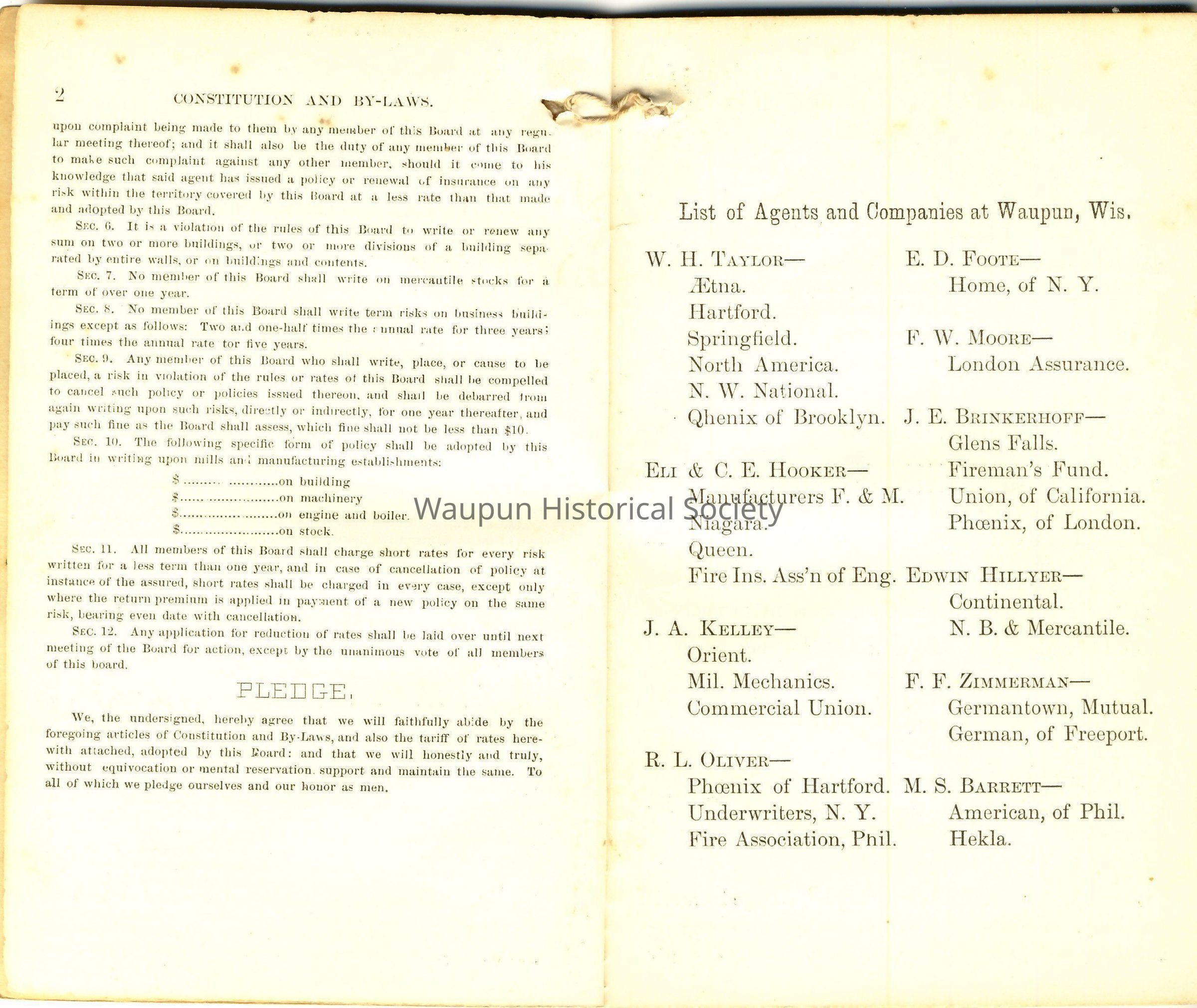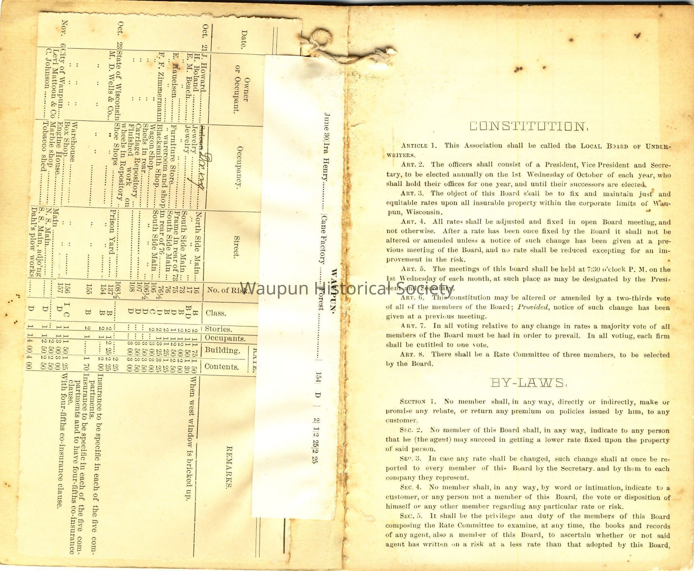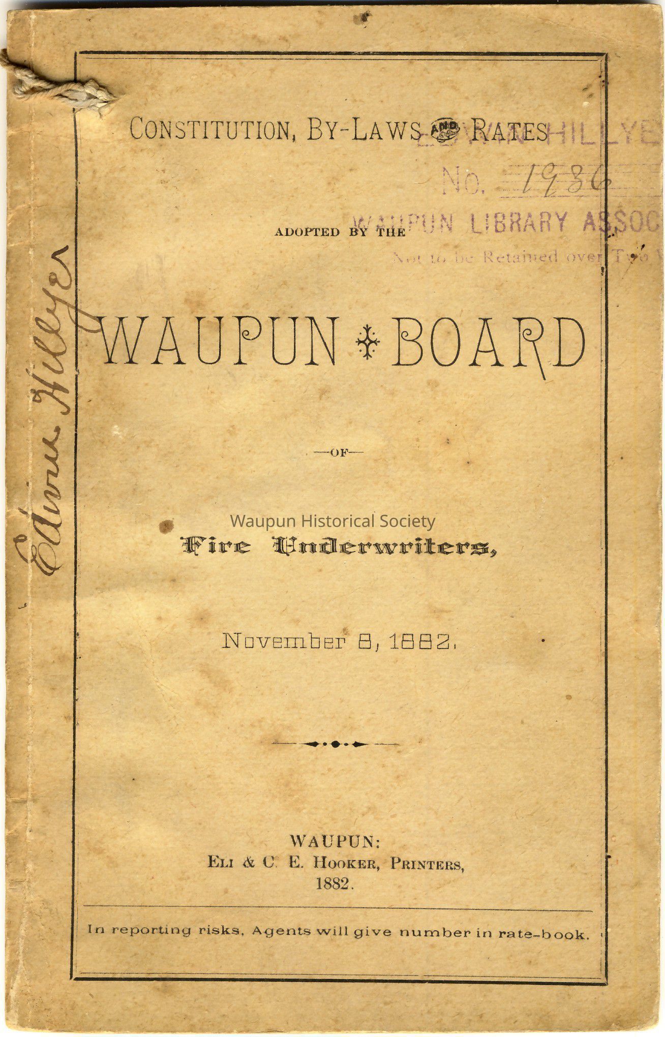 Extended Description: Booklet on Constitution, By-Laws and Rates, Adopted by the WAUPUN - BOARD of Fire Underwriters, November 8, 1882. The name Edwin Hillyer is hand written and stamped on the cover. This belonged to the Waupun Library Assoc. at one time, was numbered 1986.