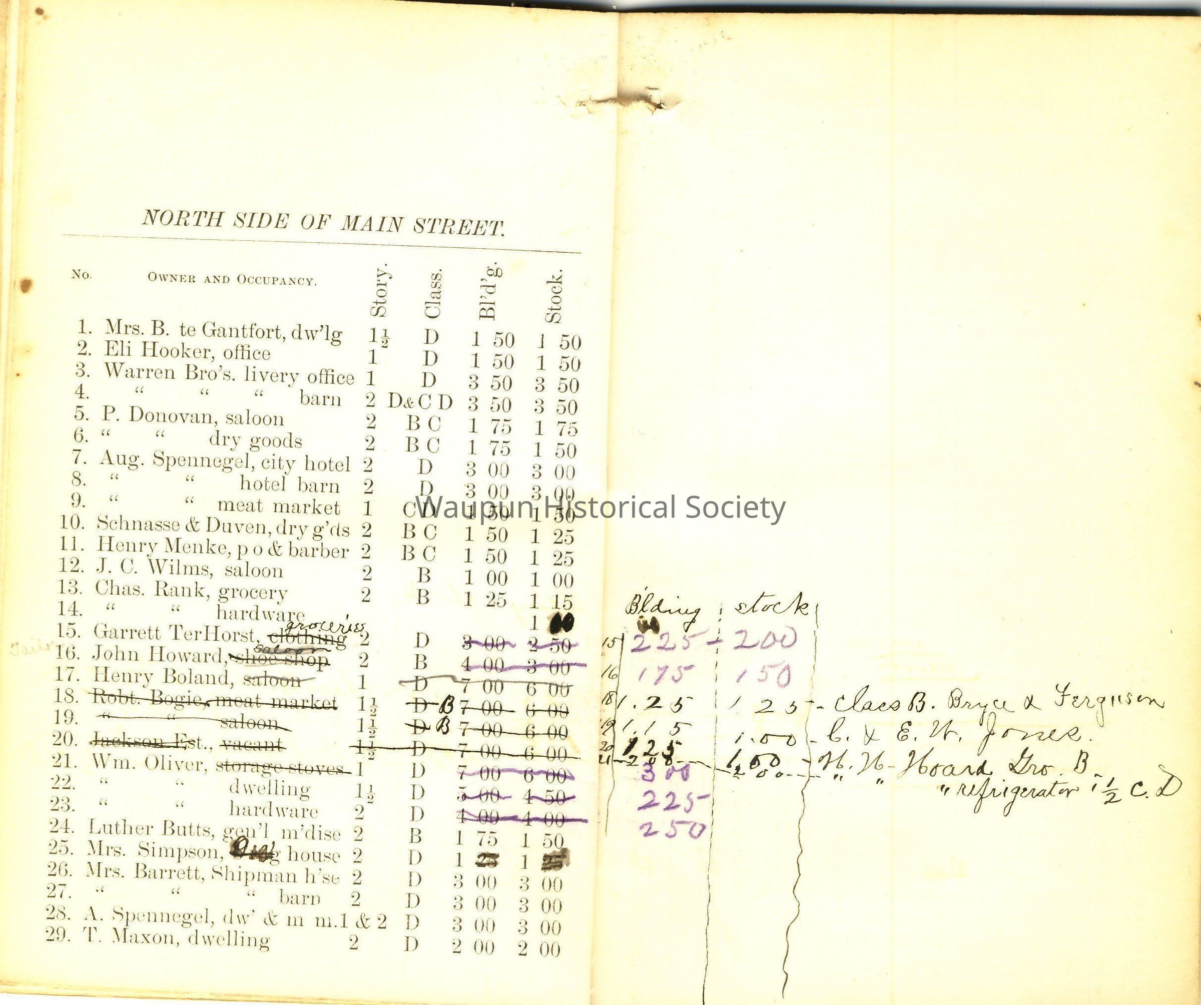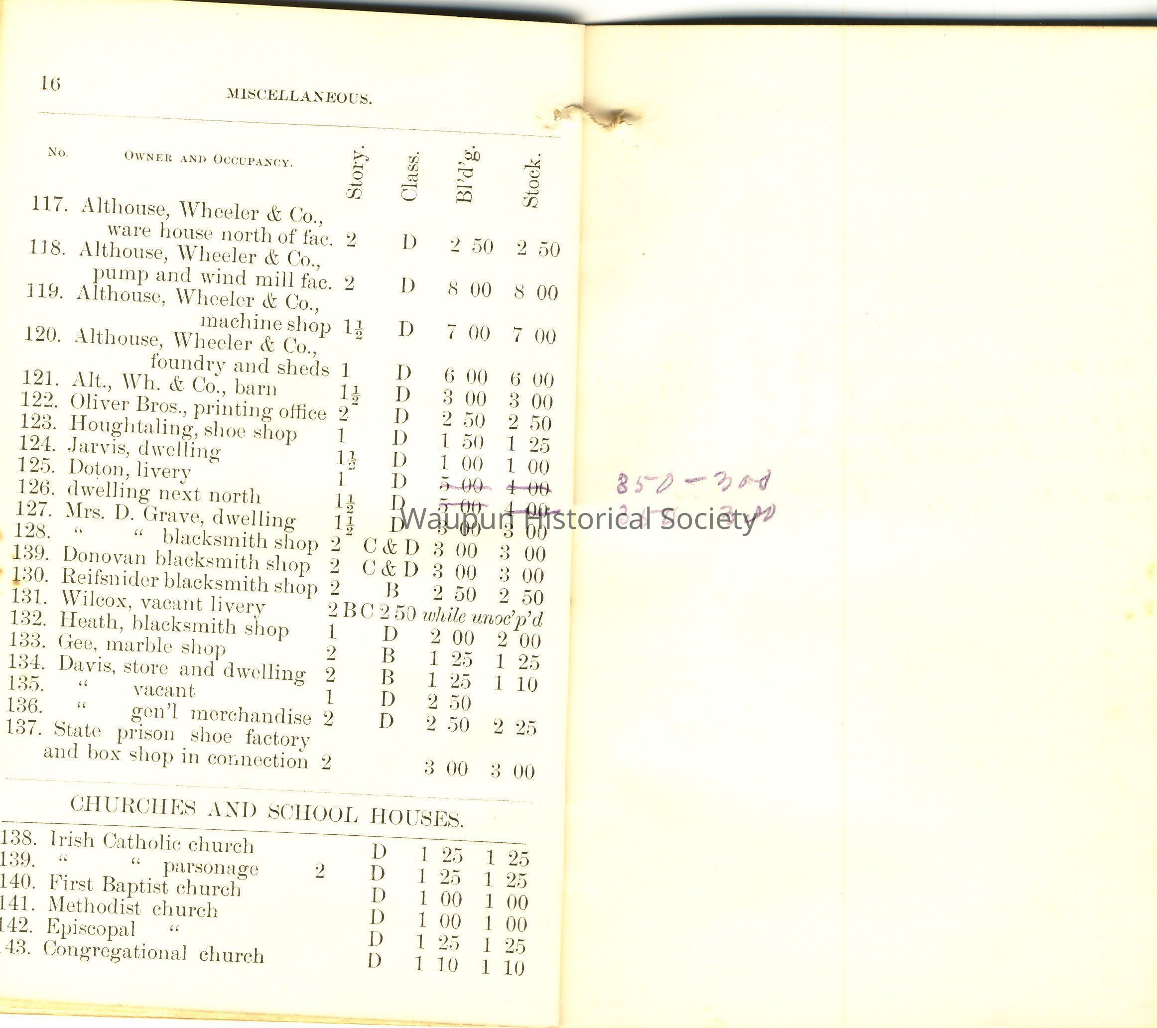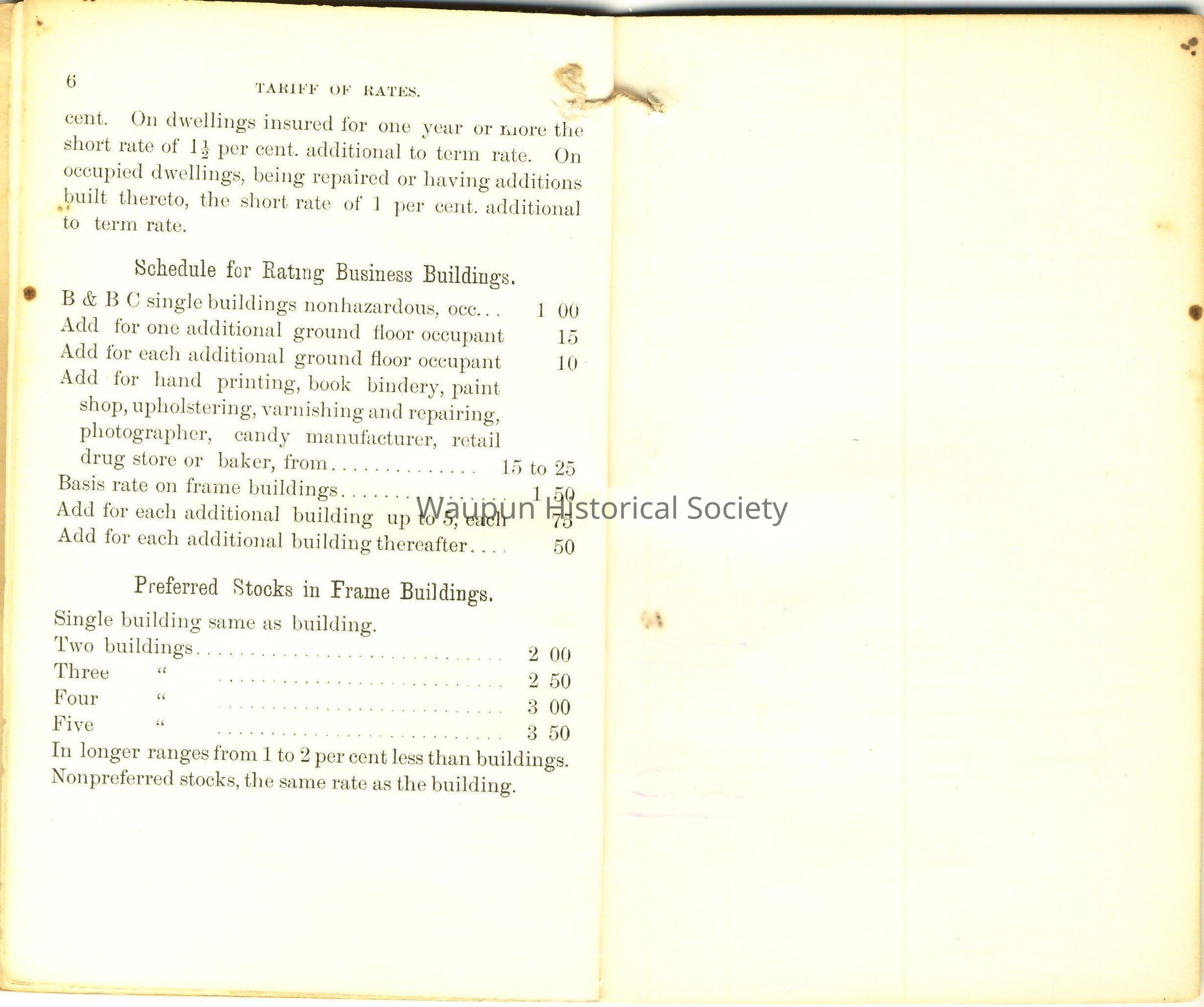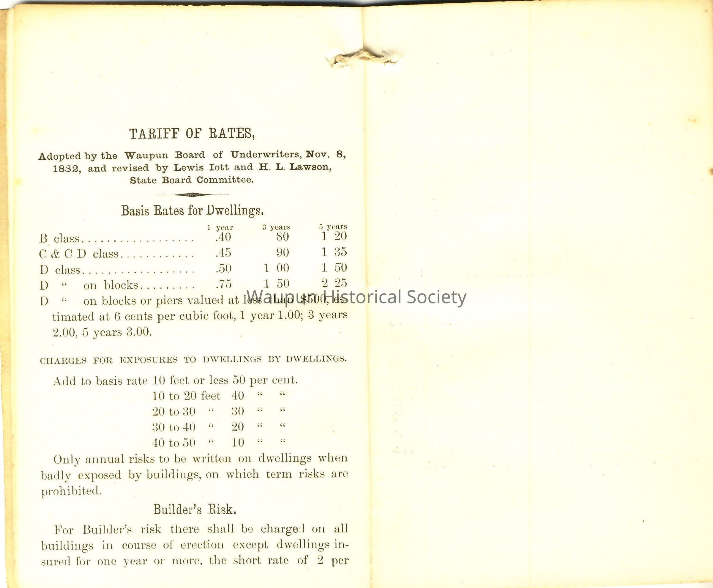 Booklet on Constitution, By-Laws and Rates, Adopted by the WAUPUN - BOARD of Fire Underwriters, November 8, 1882. The name Edwin Hillyer is hand written and stamped on the cover. This belonged to the Waupun Library Assoc. at one time, was numbered 1986.