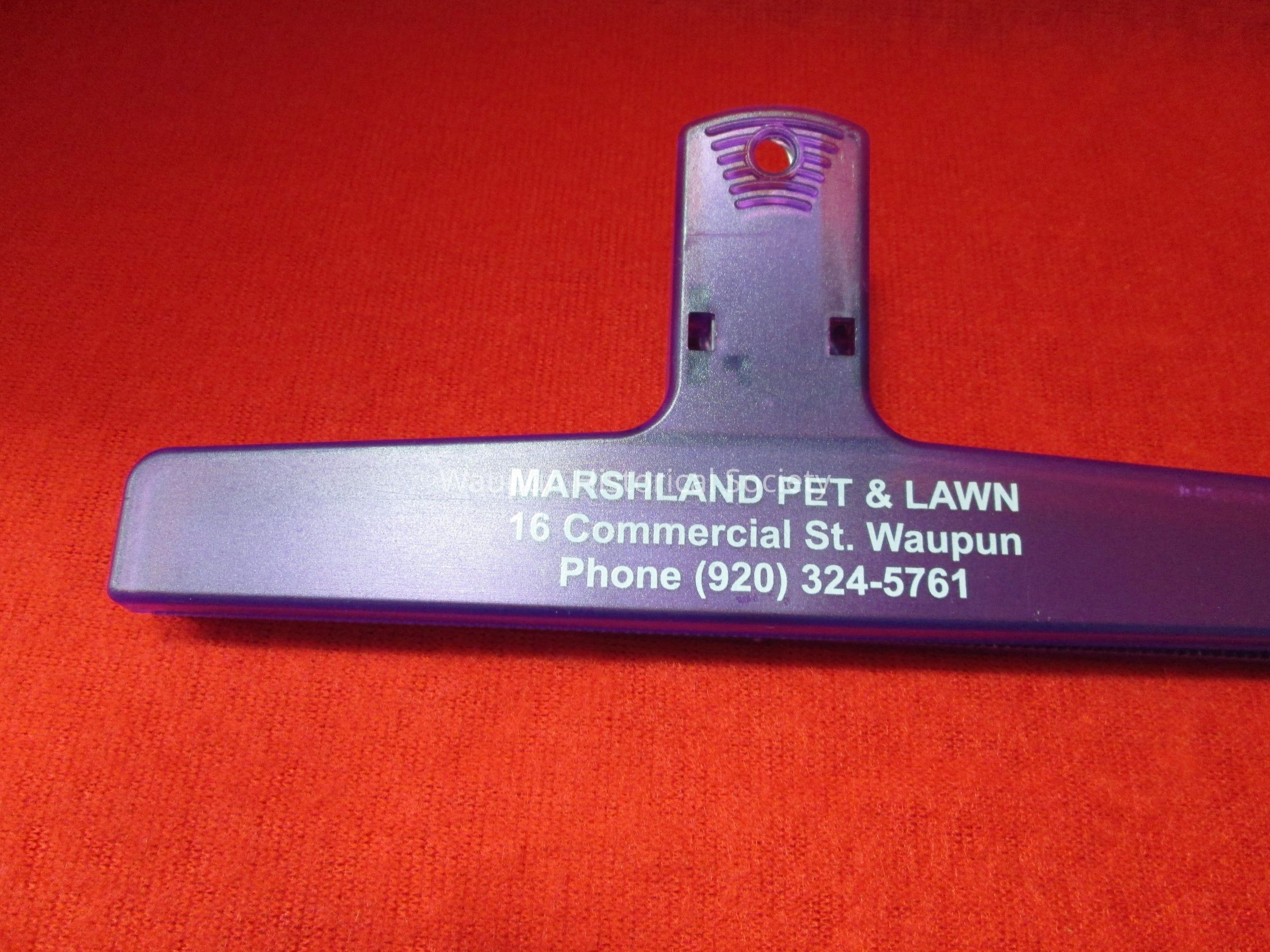 A Bag Clip 6 inch long Purple in color with the Marshland Pet& Lawn on the front 16 commercial ST. Waupun with a vatiety of use.Acquisition