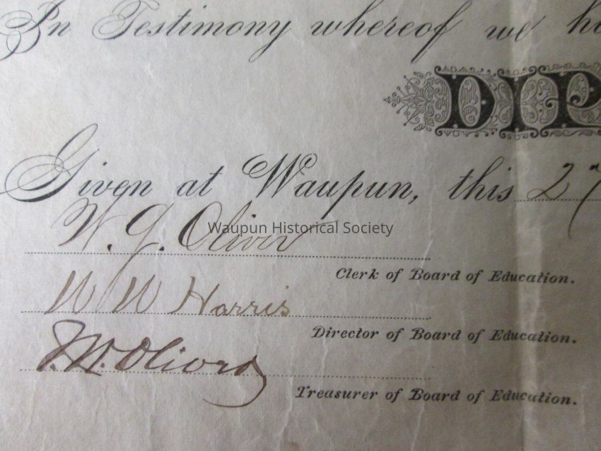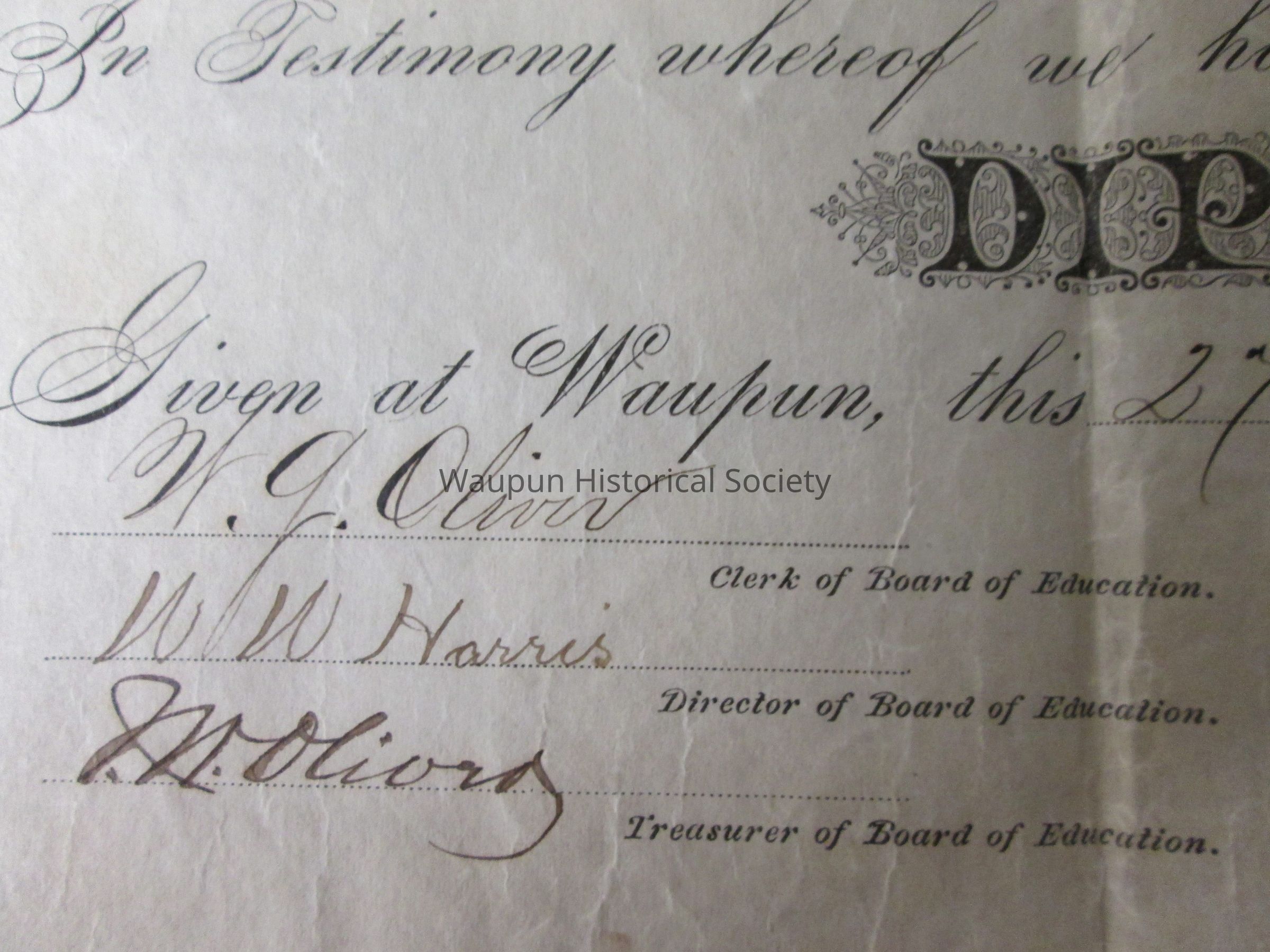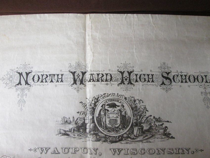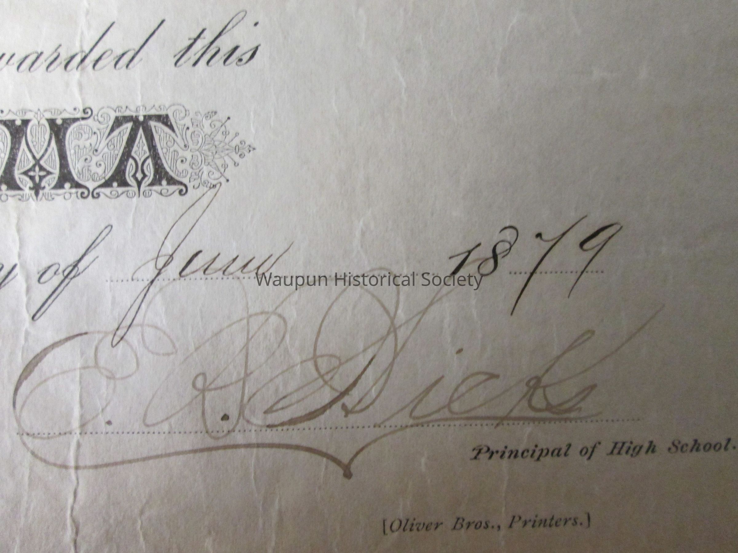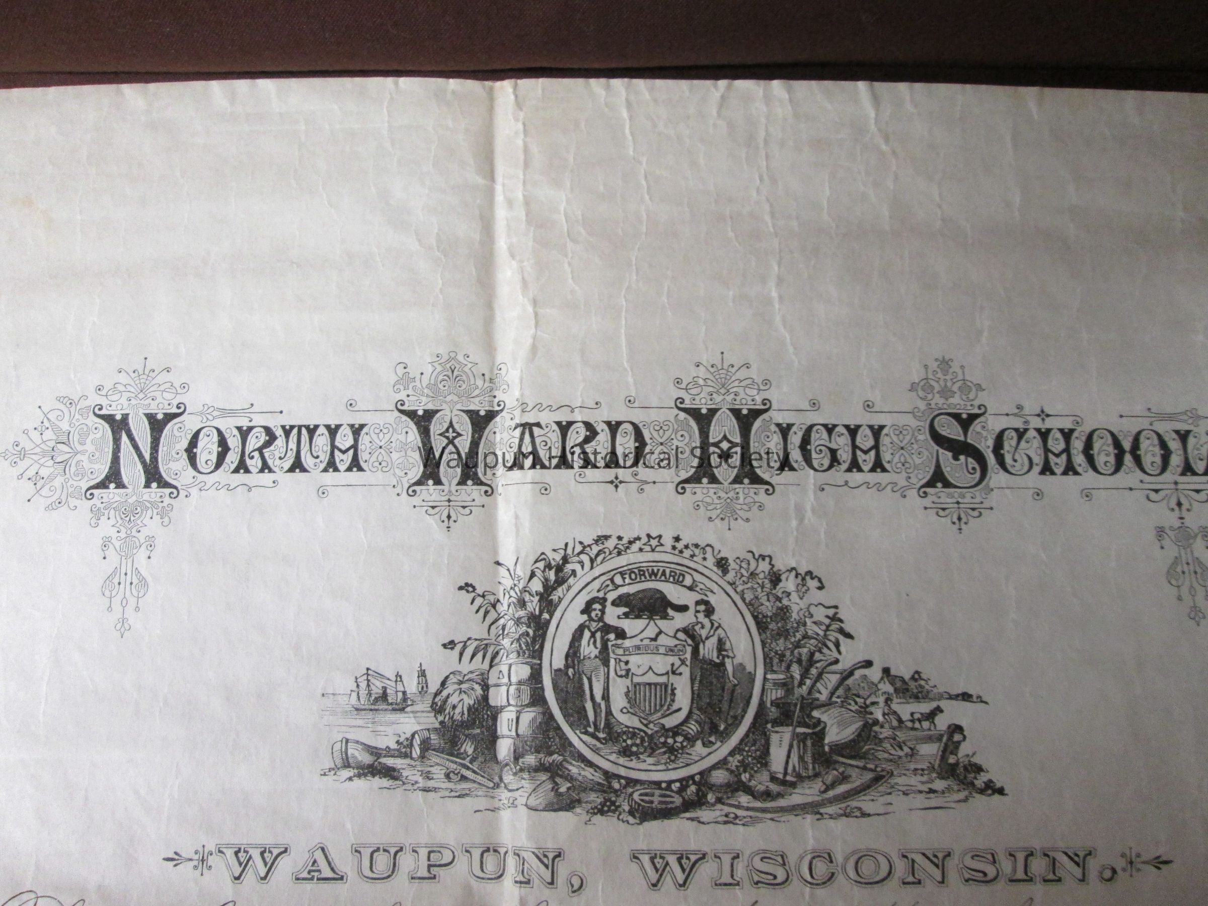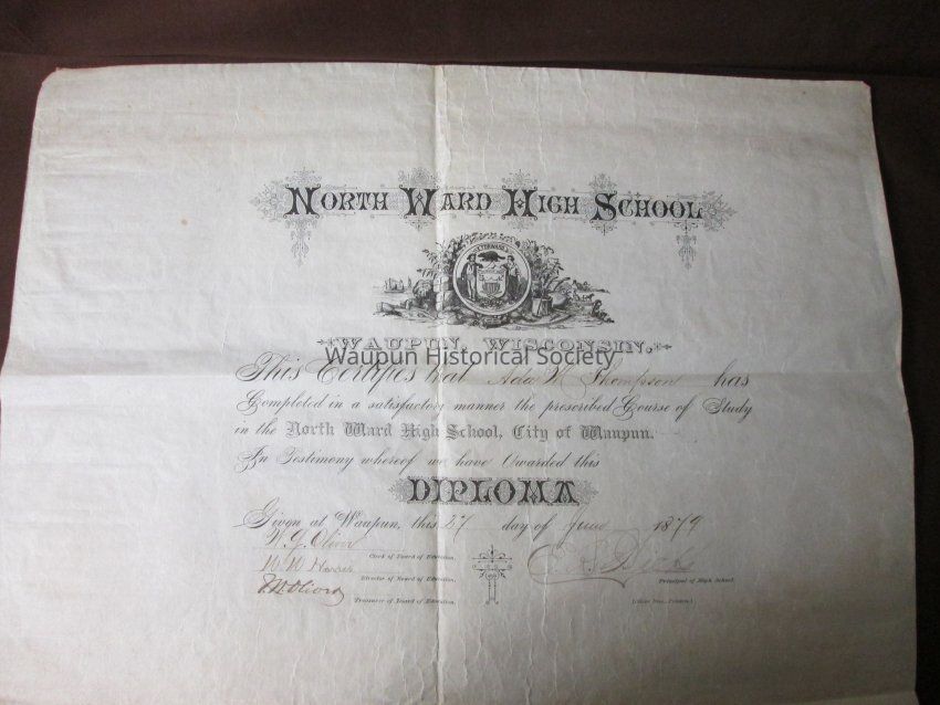 Diploma from North Ward High School, Waupun, Wisconsin, 1879.