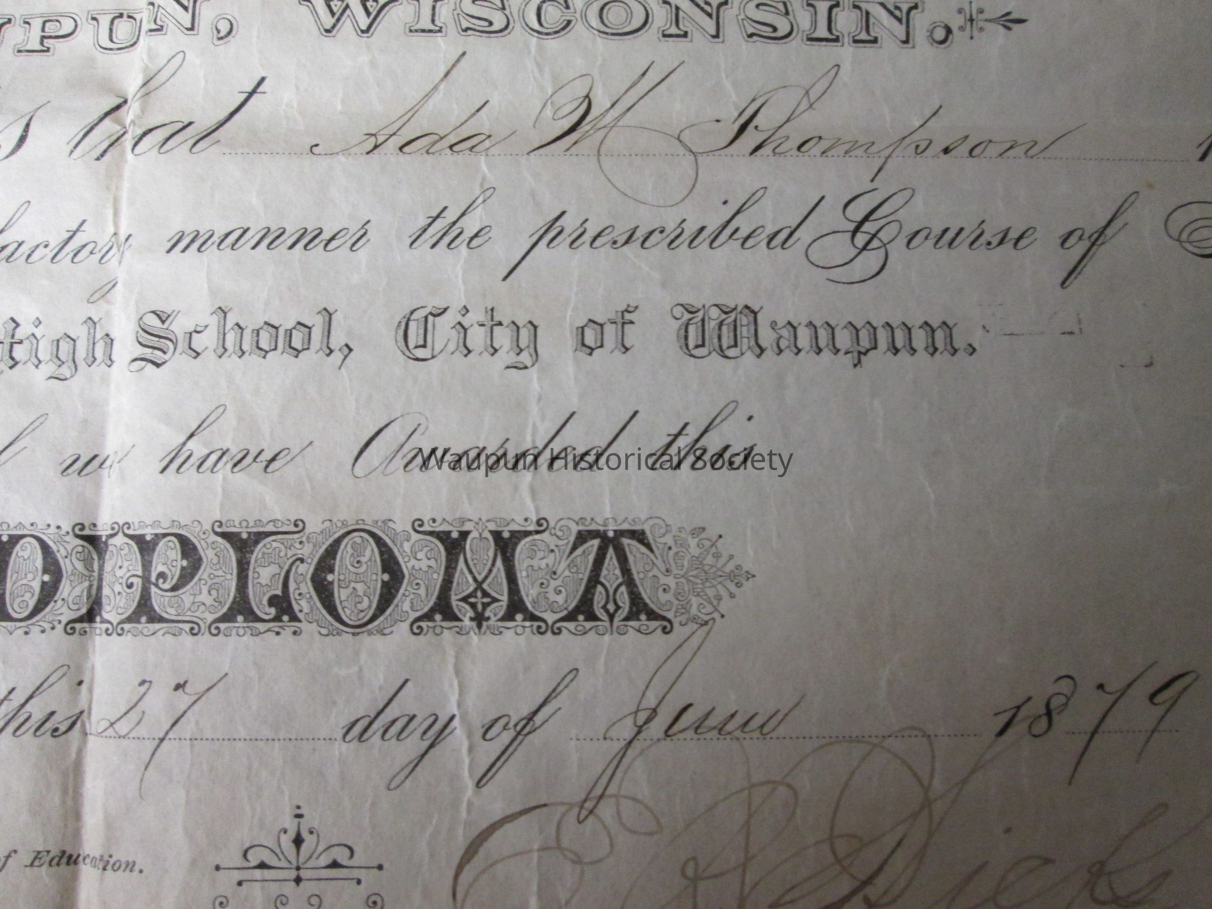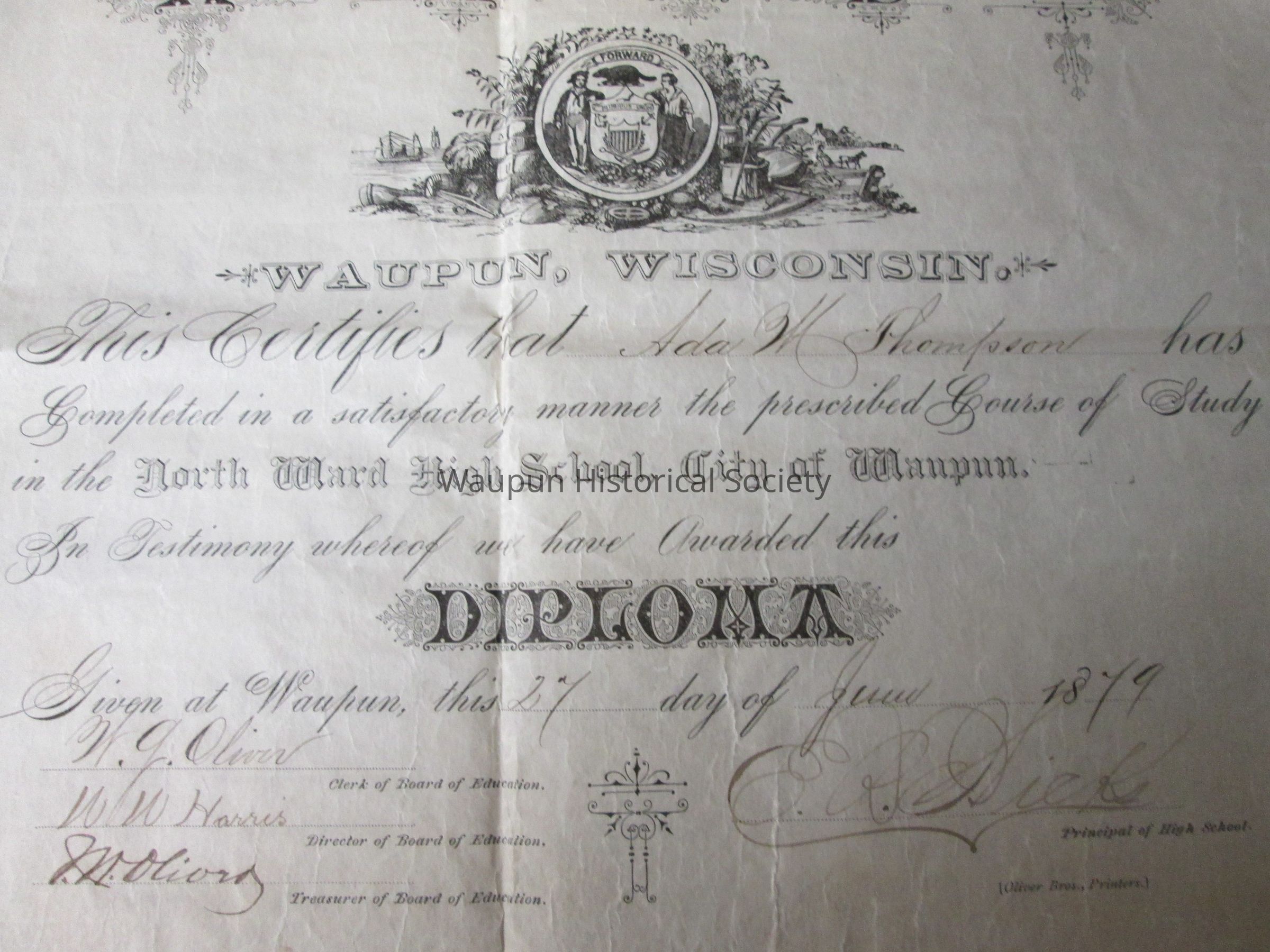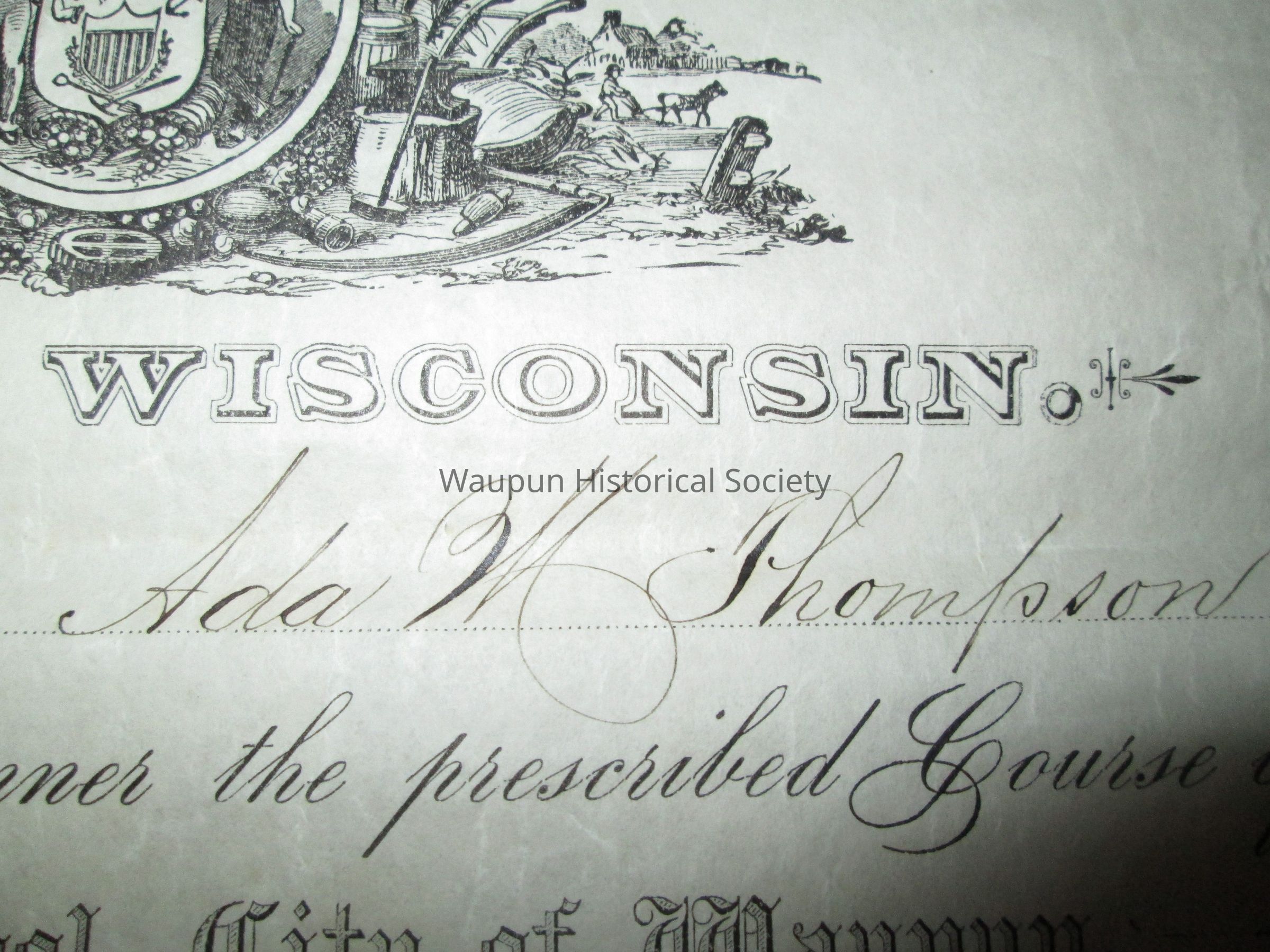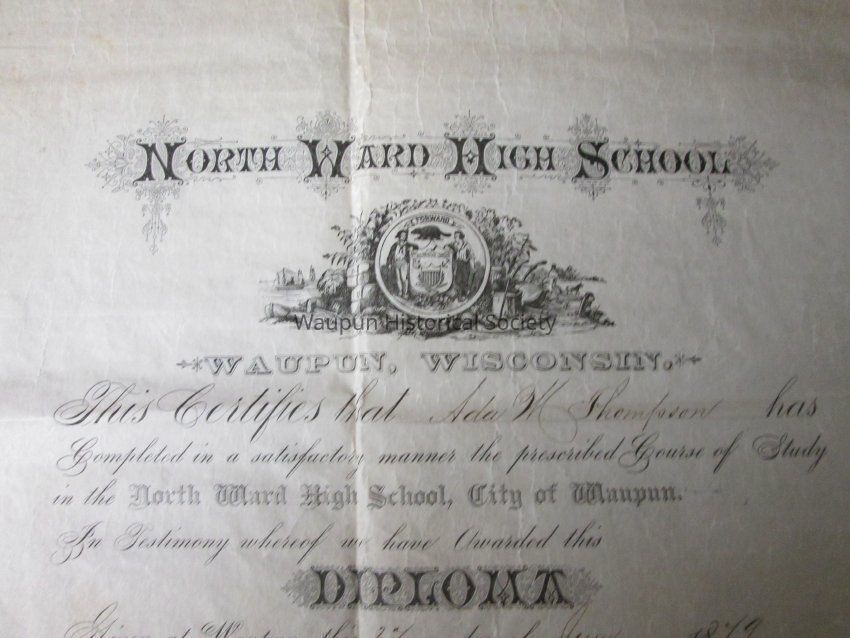 This Certifies that Ada W. Thompson has completed in a satisfactory manner the prescribed Course of Study in the North Ward High School, City of Waupun.