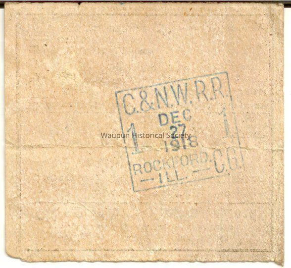 Back side of the ticket is stamped with C.&N.W.R.R. 1 - Dec 27,1918 Rockford. - ILL - C.G.
