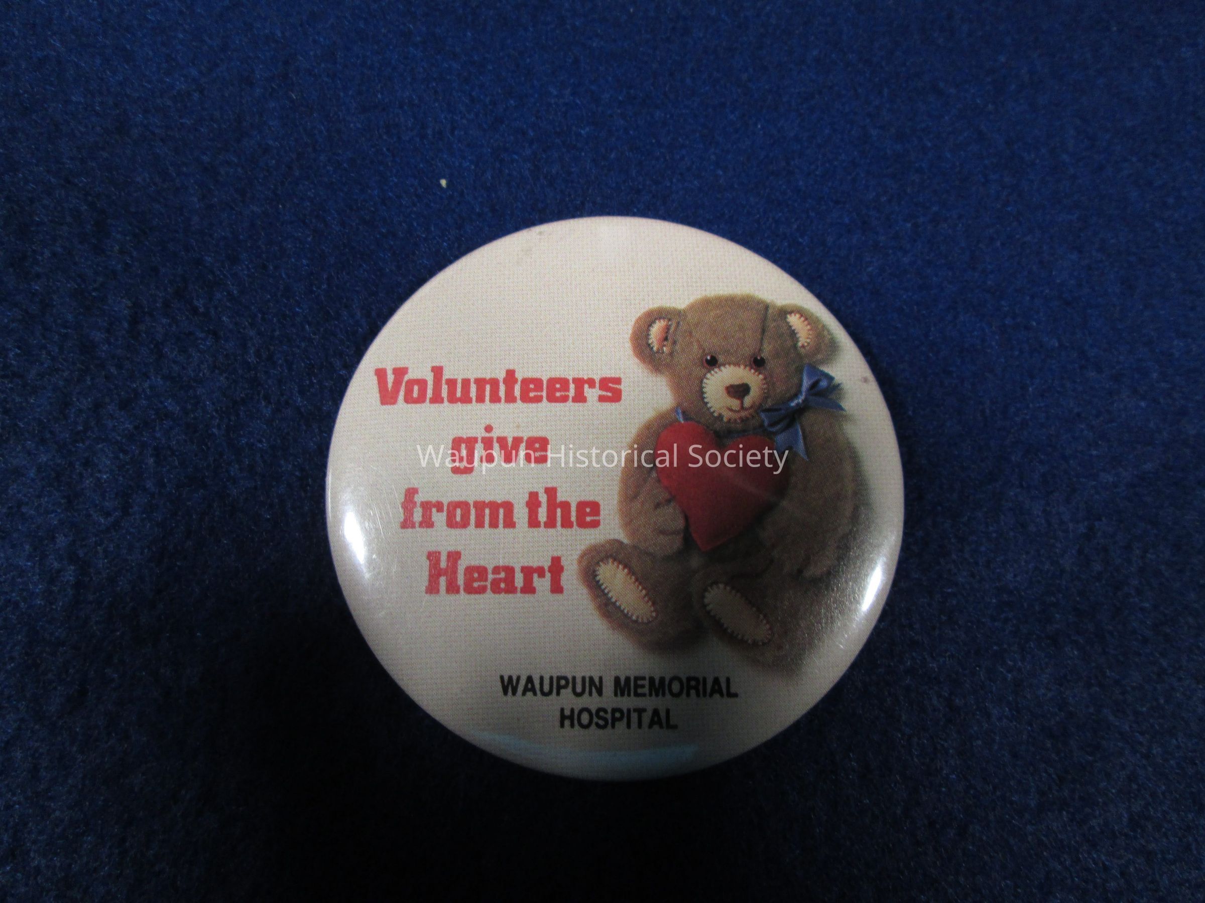 Pin/Button round and cream in color with teddy bear on the front from Volunteer's give from the heart and picture of teddy bear on the front with a big red heart from Waupun Memorial HospitalAcquisition